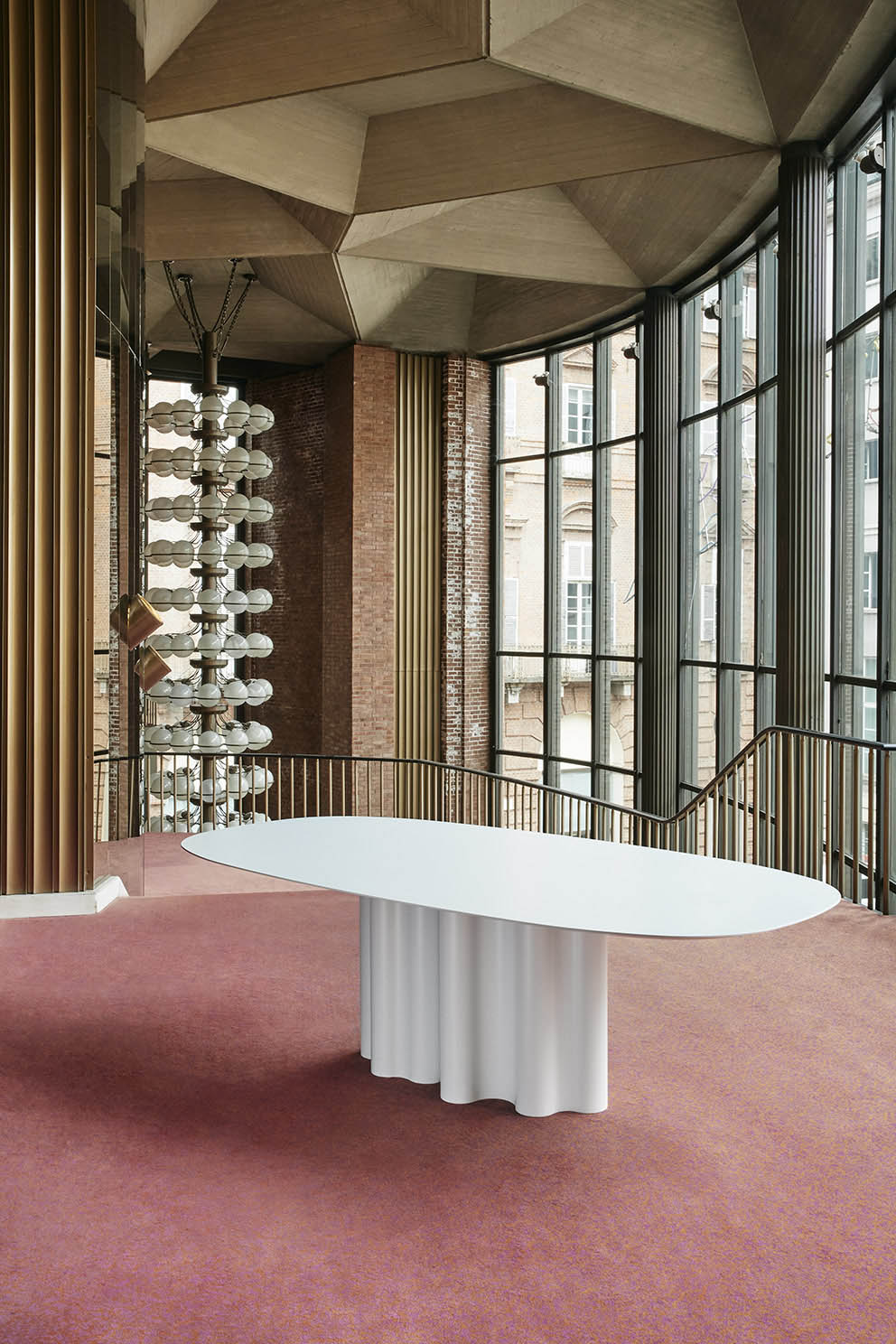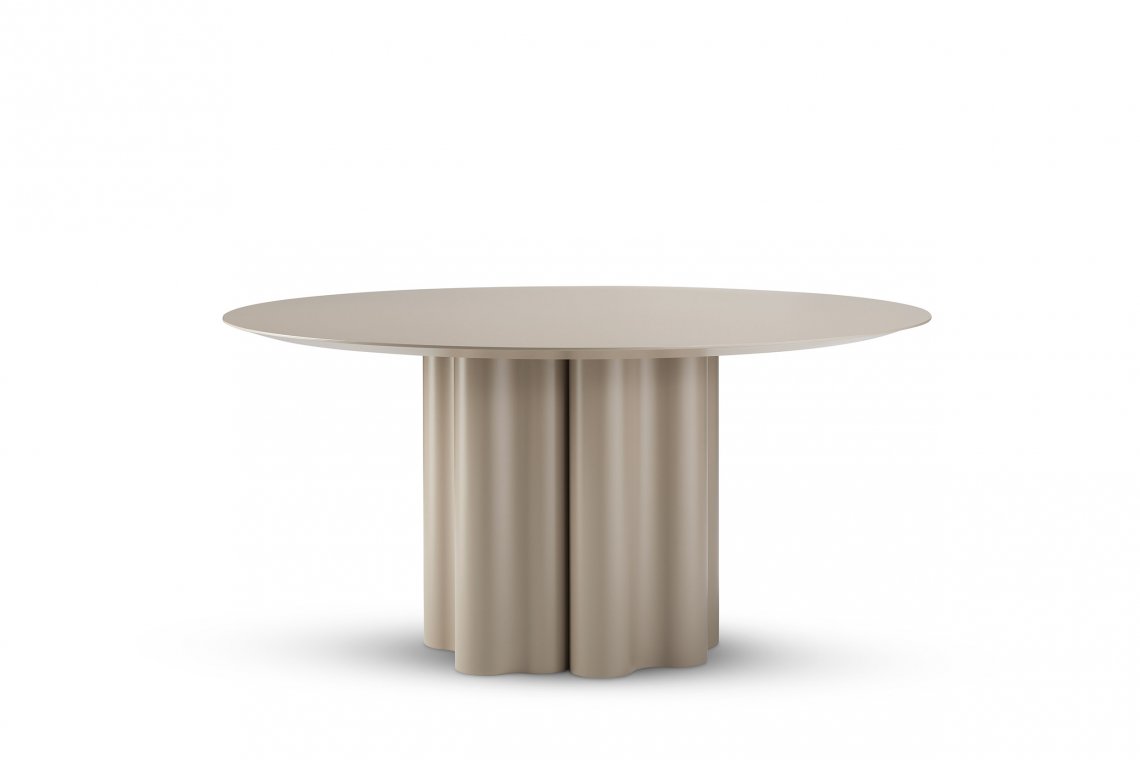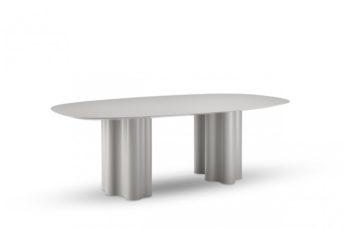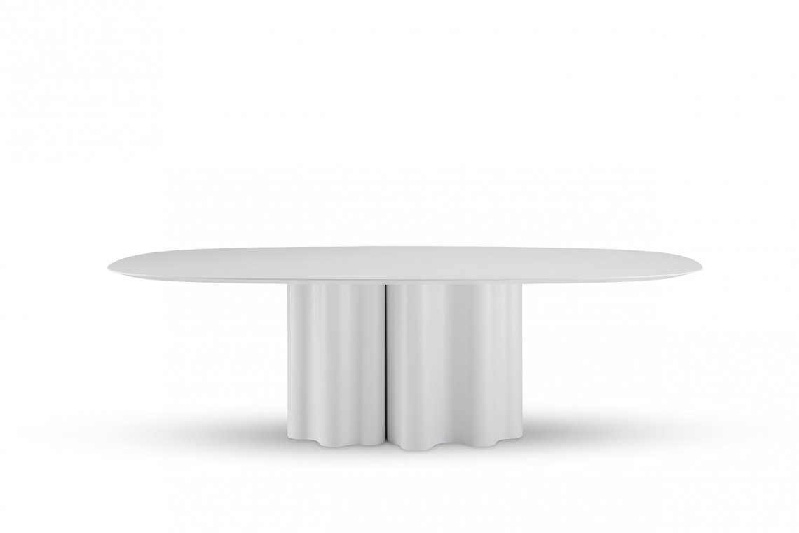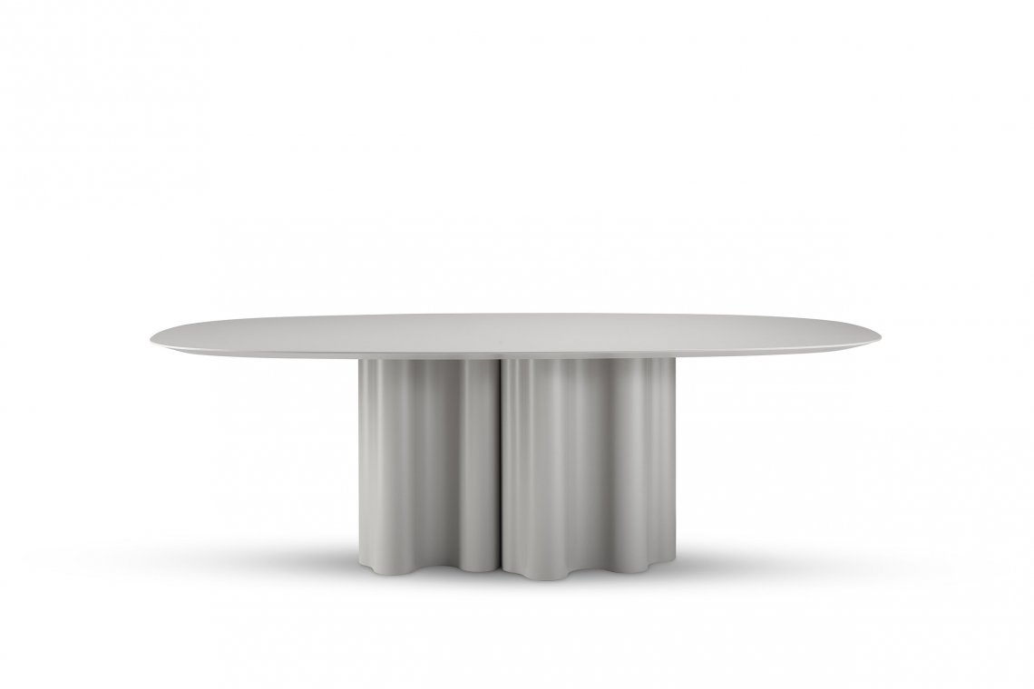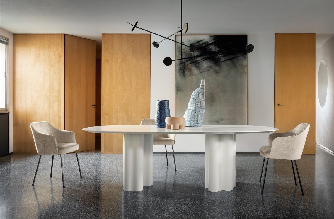 The softness of the fabric, reinterpreted in the base of the table, alludes to the very essence of the company, the table bases can be united or separated and they accentuate the compositional freedom of a sculptural furniture piece that becomes the silent protagonist of the environment. The table top, clean and essential, is available in different shapes and sizes, round and oval, to accompany different stories of conviviality.