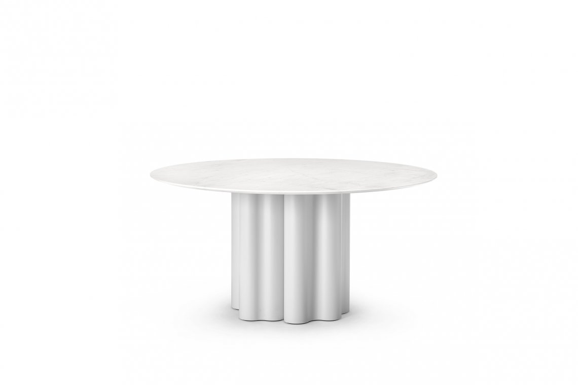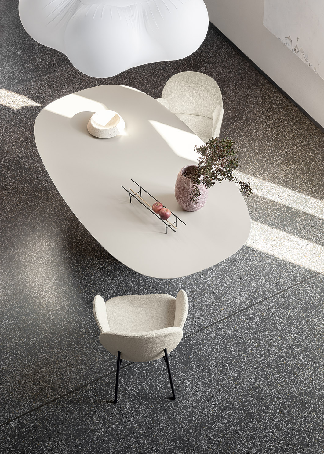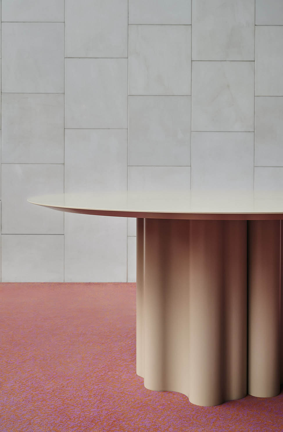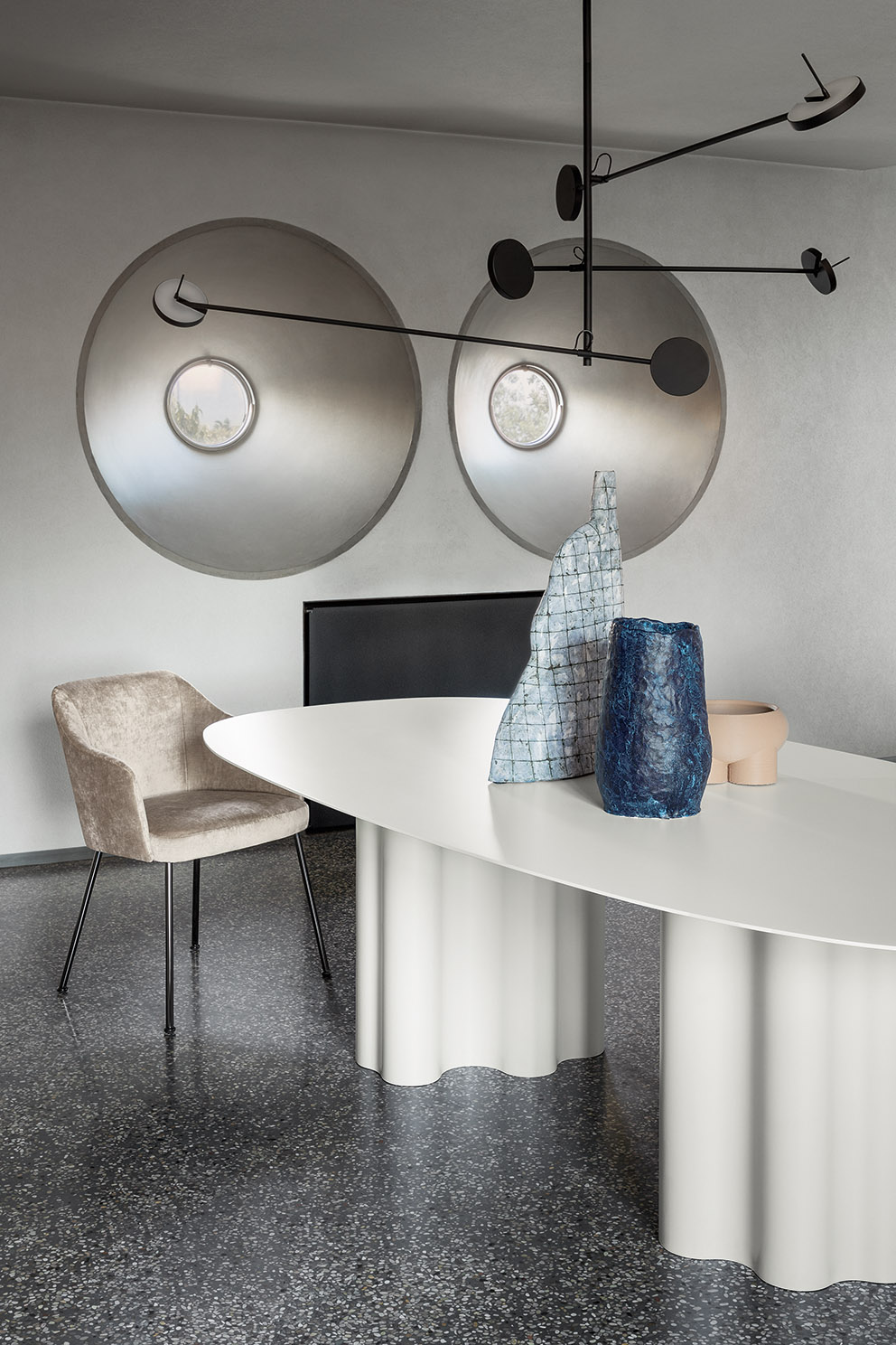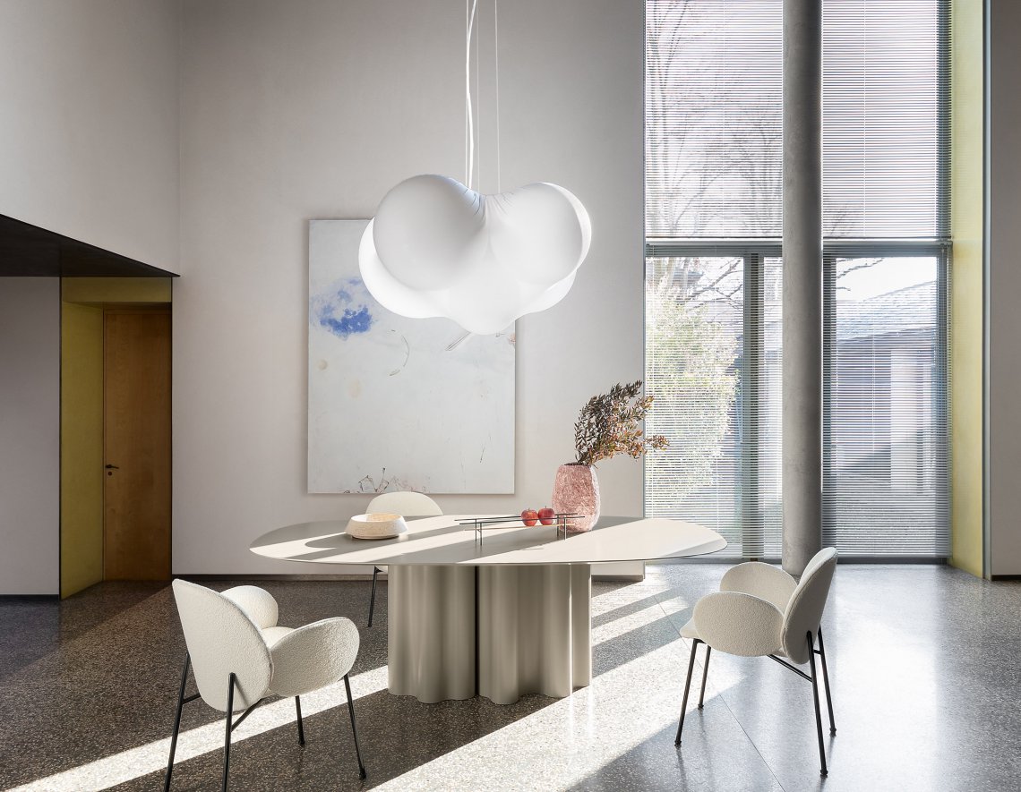 The softness of the fabric, reinterpreted in the base of the table, alludes to the very essence of the company, the table bases can be united or separated and they accentuate the compositional freedom of a sculptural furniture piece that becomes the silent protagonist of the environment. The table top, clean and essential, is available in different shapes and sizes, round and oval, to accompany different stories of conviviality.