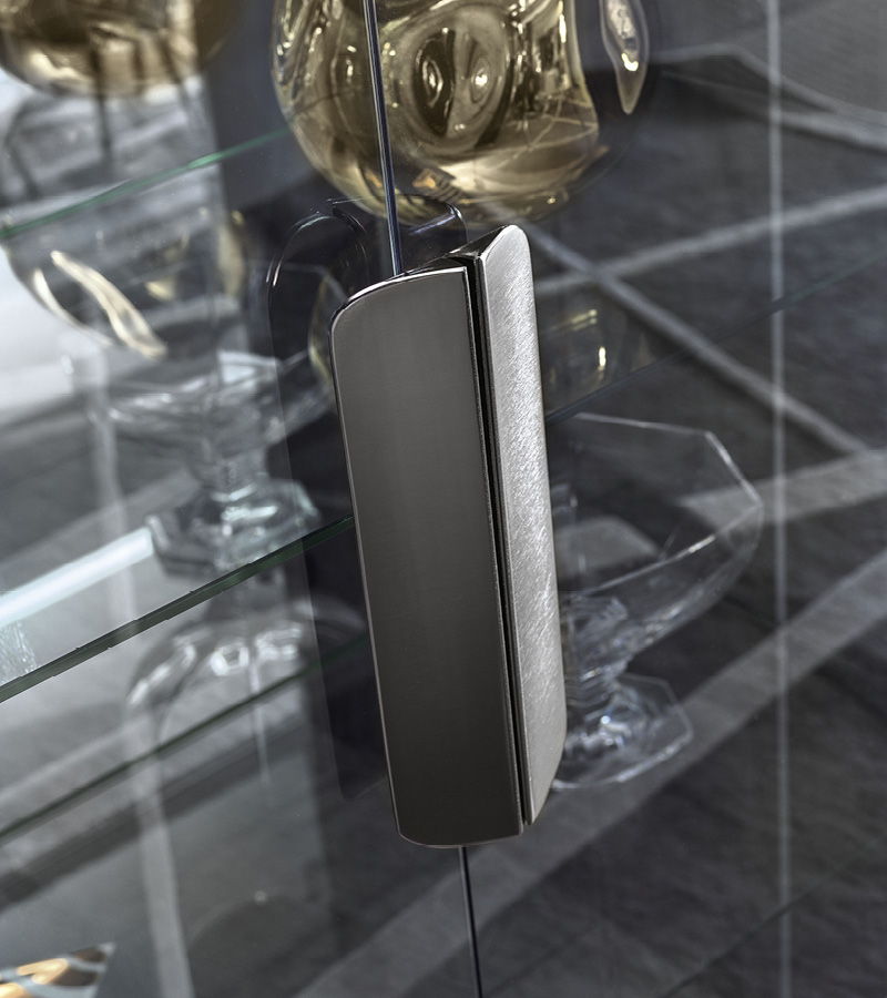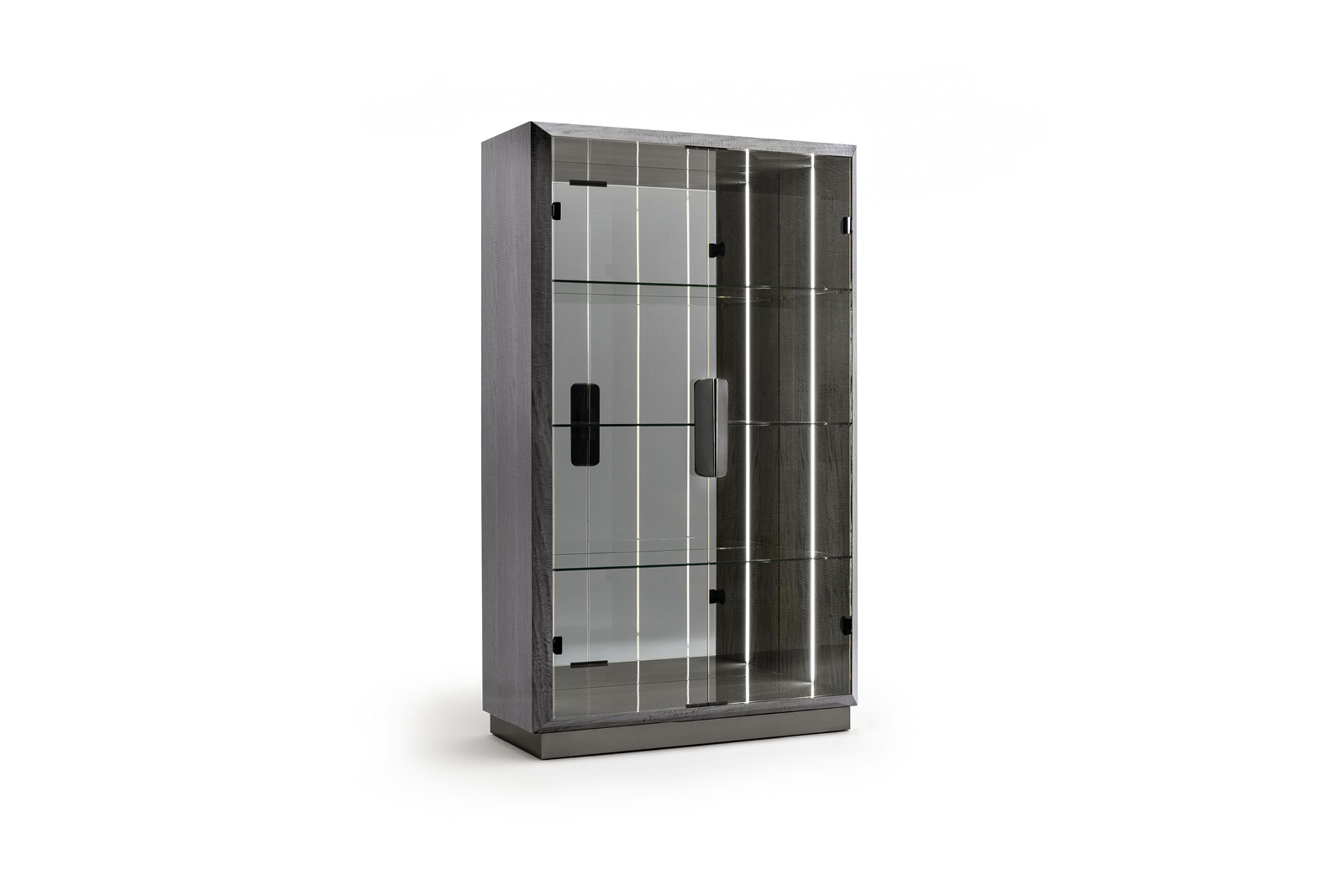 Vetrine with 2 glass doors, structure in Madagascar figured Mowinghi veneer with high gloss polyester fìnish. Base and handles in satin black nickel stainless steel. 4 led lights including switch. 3 inside adjustable glass shelves.