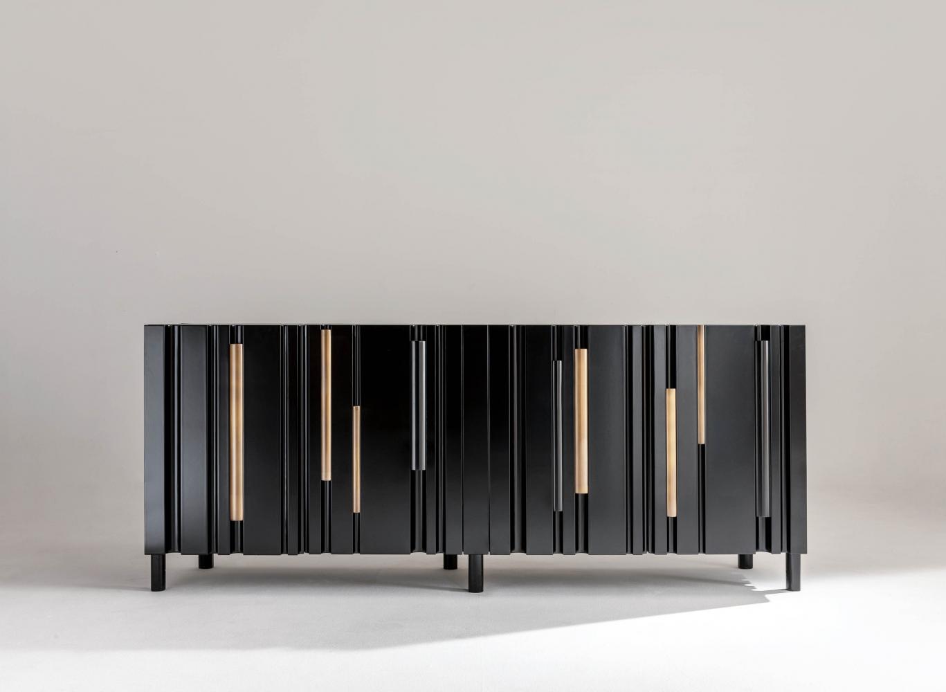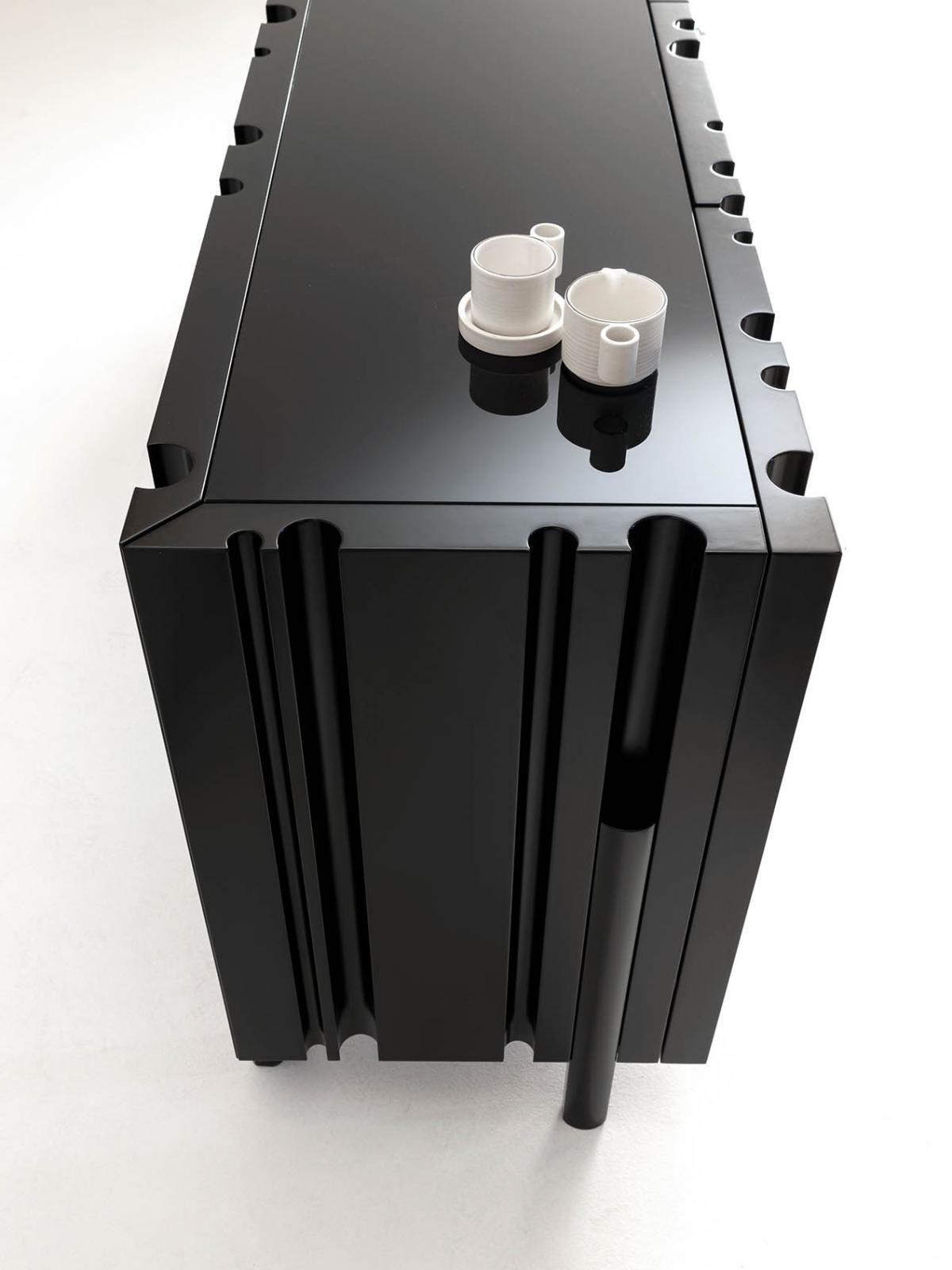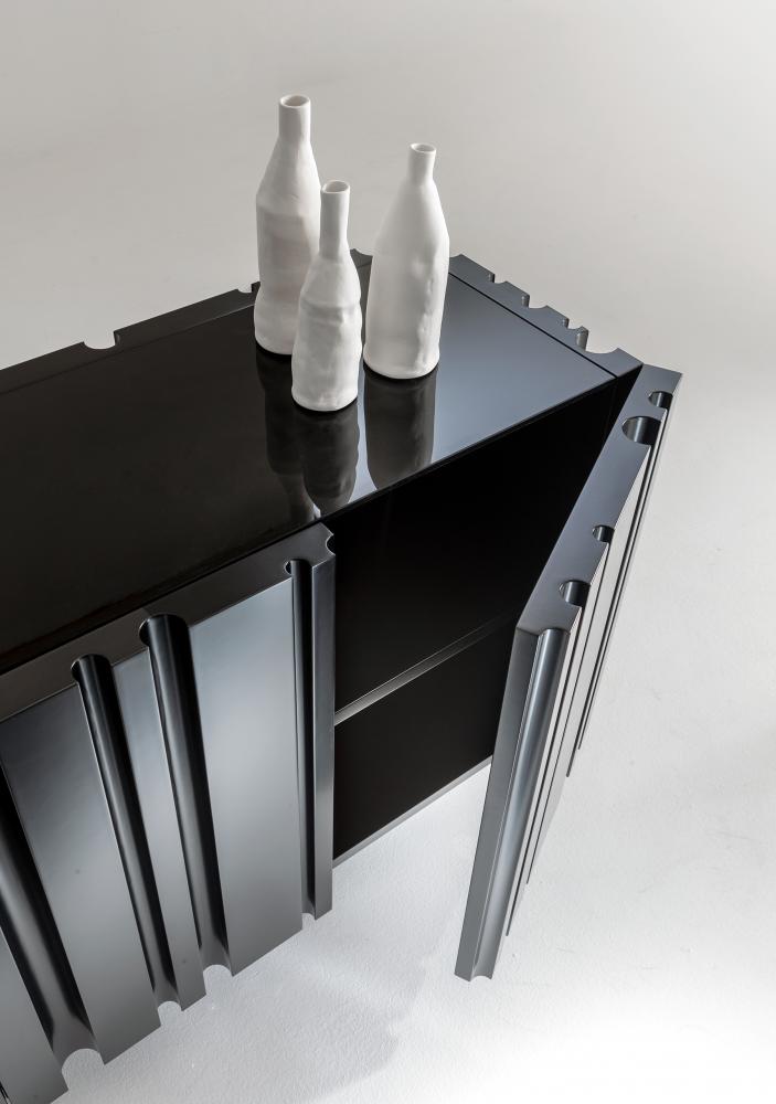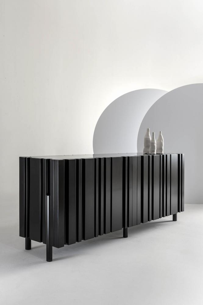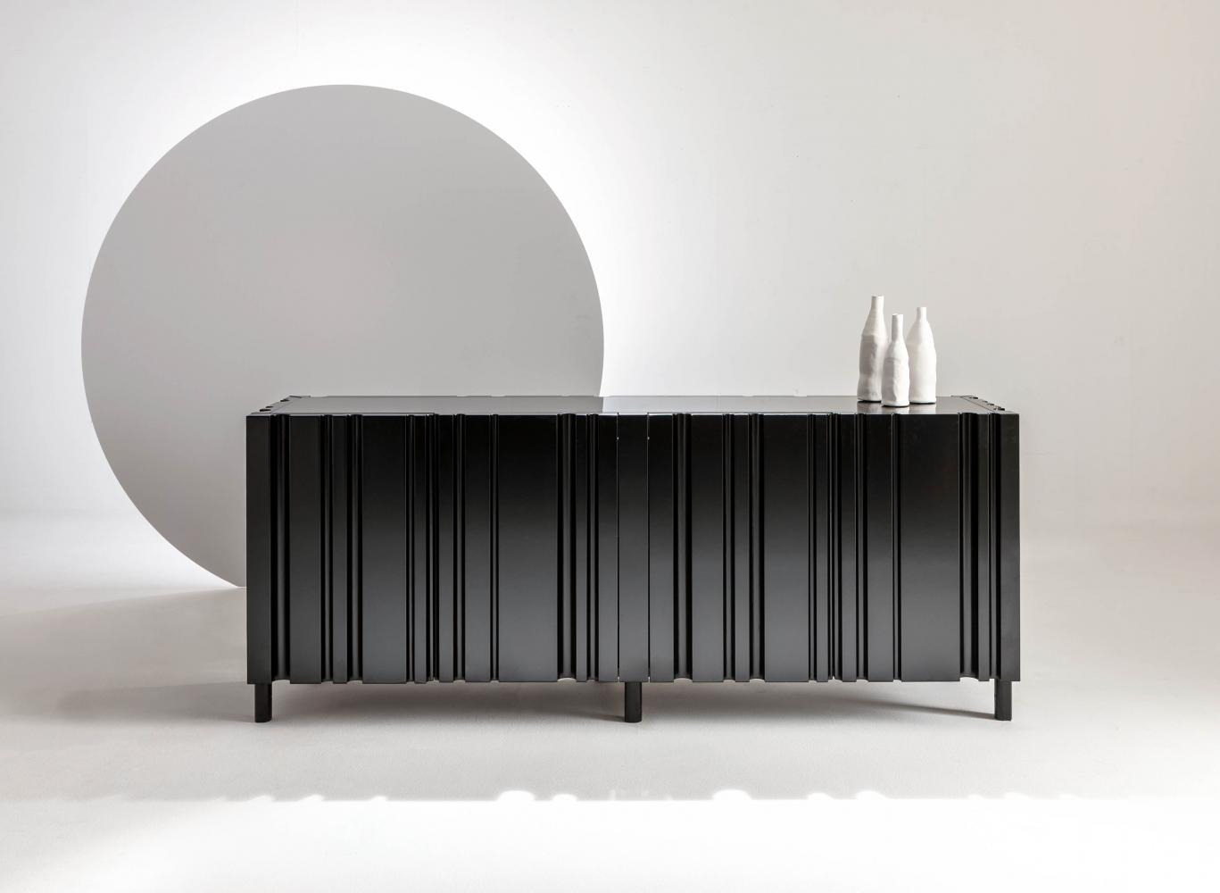 Low sideboard in lacquered wood, featuring a sequences of customizable decorative channels.