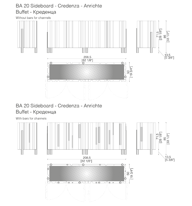 Available in veneered wood with matt lacquered channels, in lacquered wood in all the colours of the RAL scale and with metallic paint, with or without decorative bars, and with wooden or back-painted glass top.