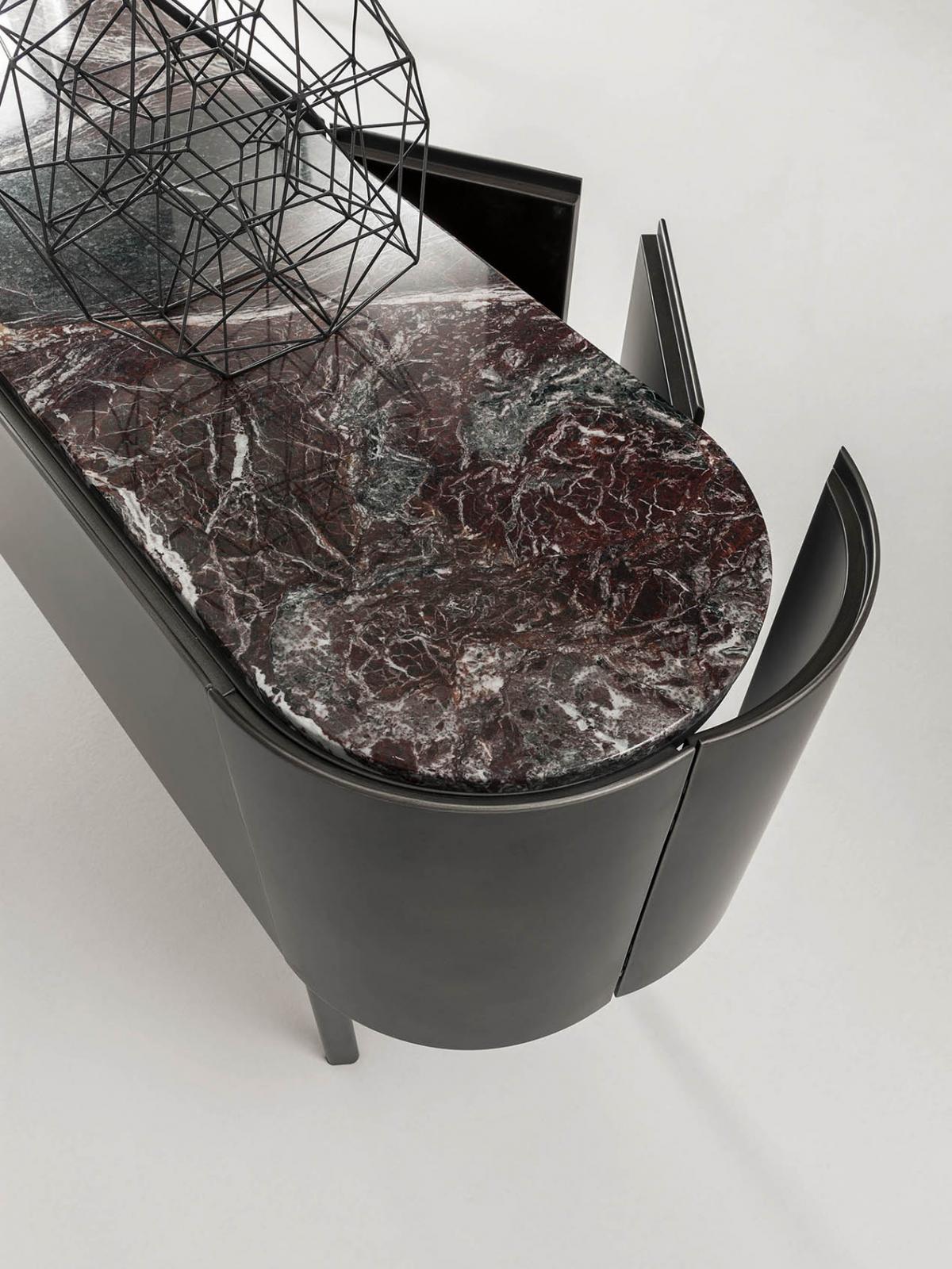 Inspired by the iconic Collectionist unit, this new sideboard proposes its soft and curvilinear design to create a low version, decorated with particular metal legs.