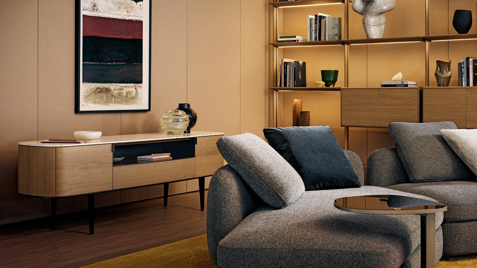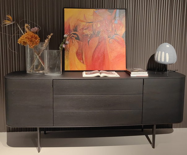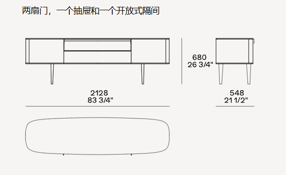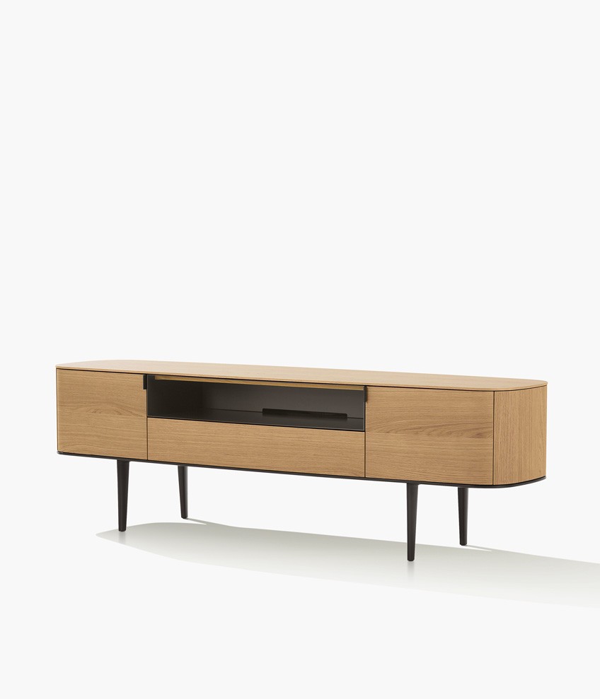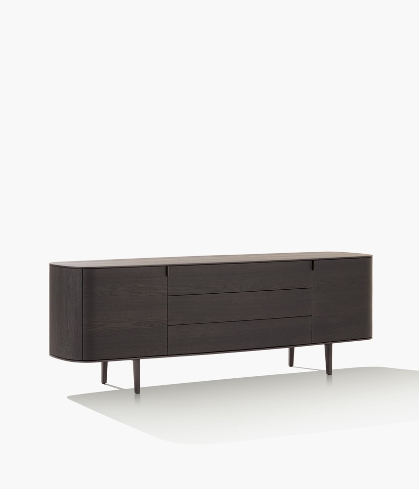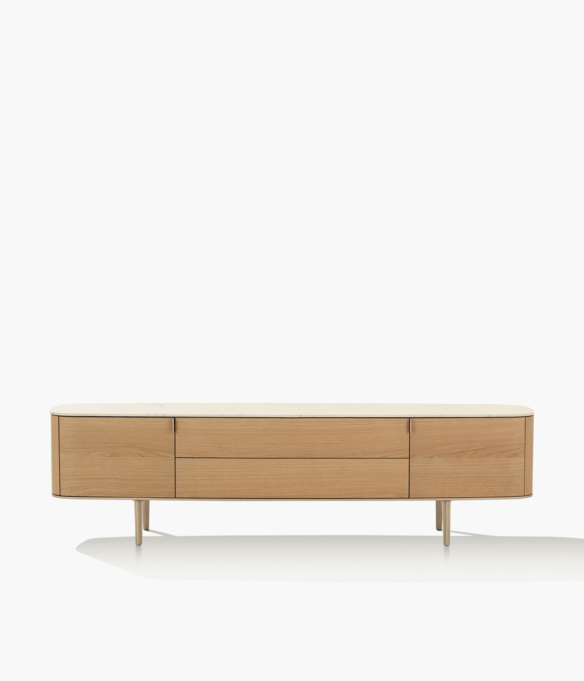 Symphony是一套櫥柜系列,尊貴的材料和精準的工藝體現出了線條之美的精髓。櫥柜以橢圓造型為特色,木飾面更突出了外觀美感。系列產品包含高度和尺寸各異的附件,從高、中款式的柜門,到搭配多個或單個抽屜和開放式隔層的低尺寸款式,均安置在帶支撐腳的底座上。