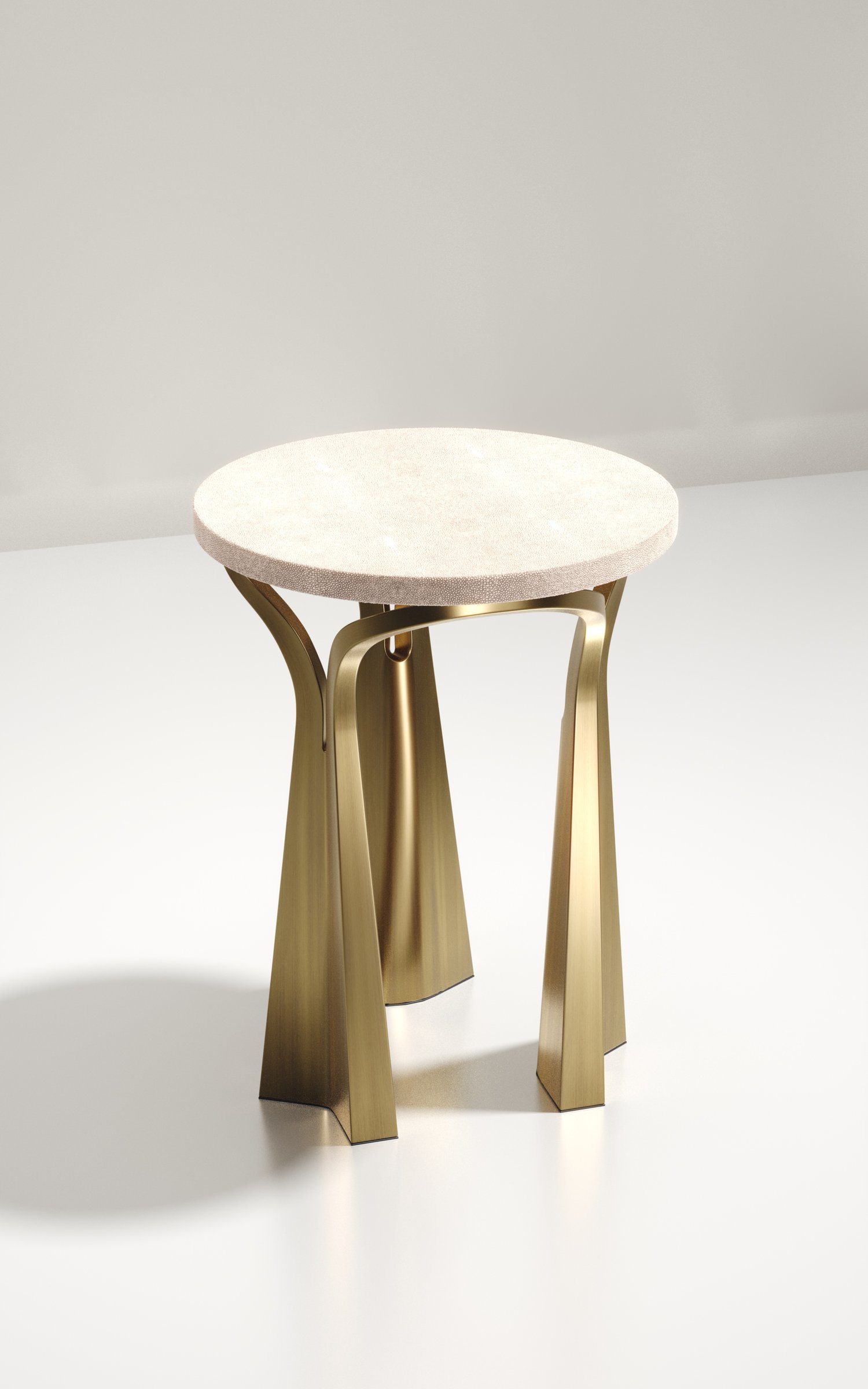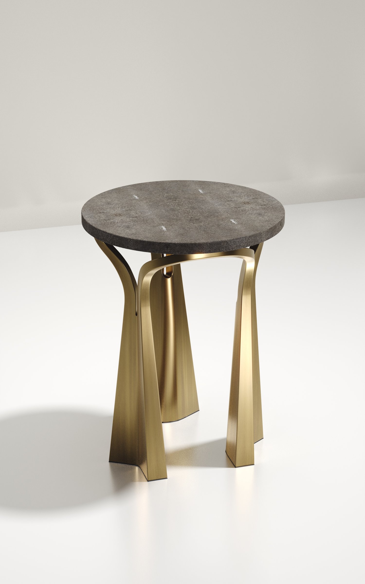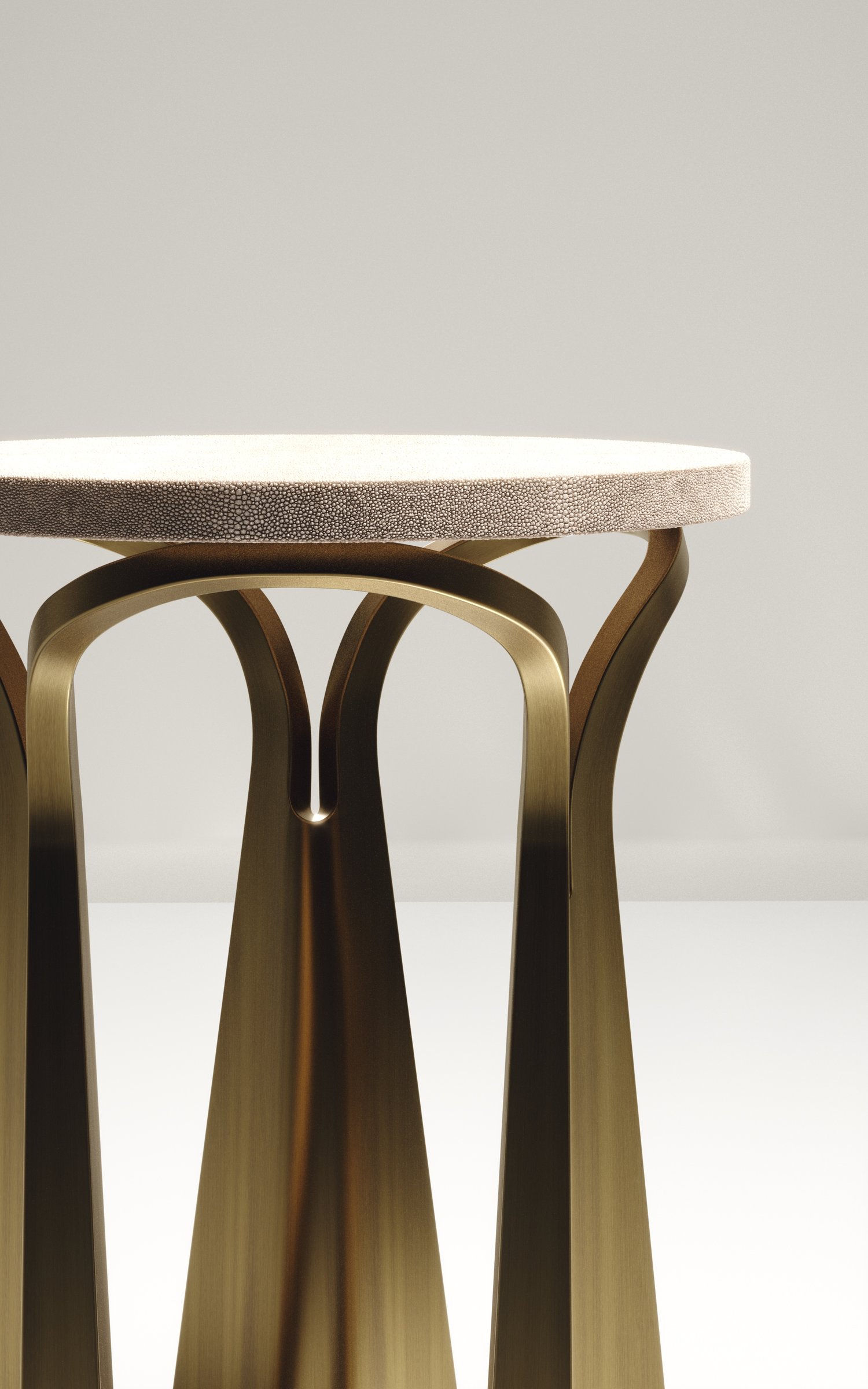The Arche side table by R&Y Augousti is a stunning piece, a statement in any space. The shagreen or shell inlaid top has a subtle metal inset around the frame, followed by bronze-patina brass sculptural cutout "arched" legs clustered together as the base. This design also exists on a breakfast table and game table version, see images at end of slide. The finish of the shagreen is authentic as it is hand-dyed and the designer calls the finish look: "antique natural shagreen."