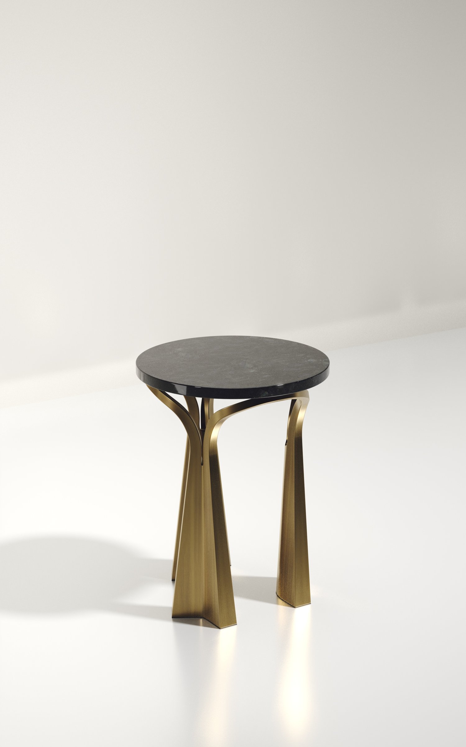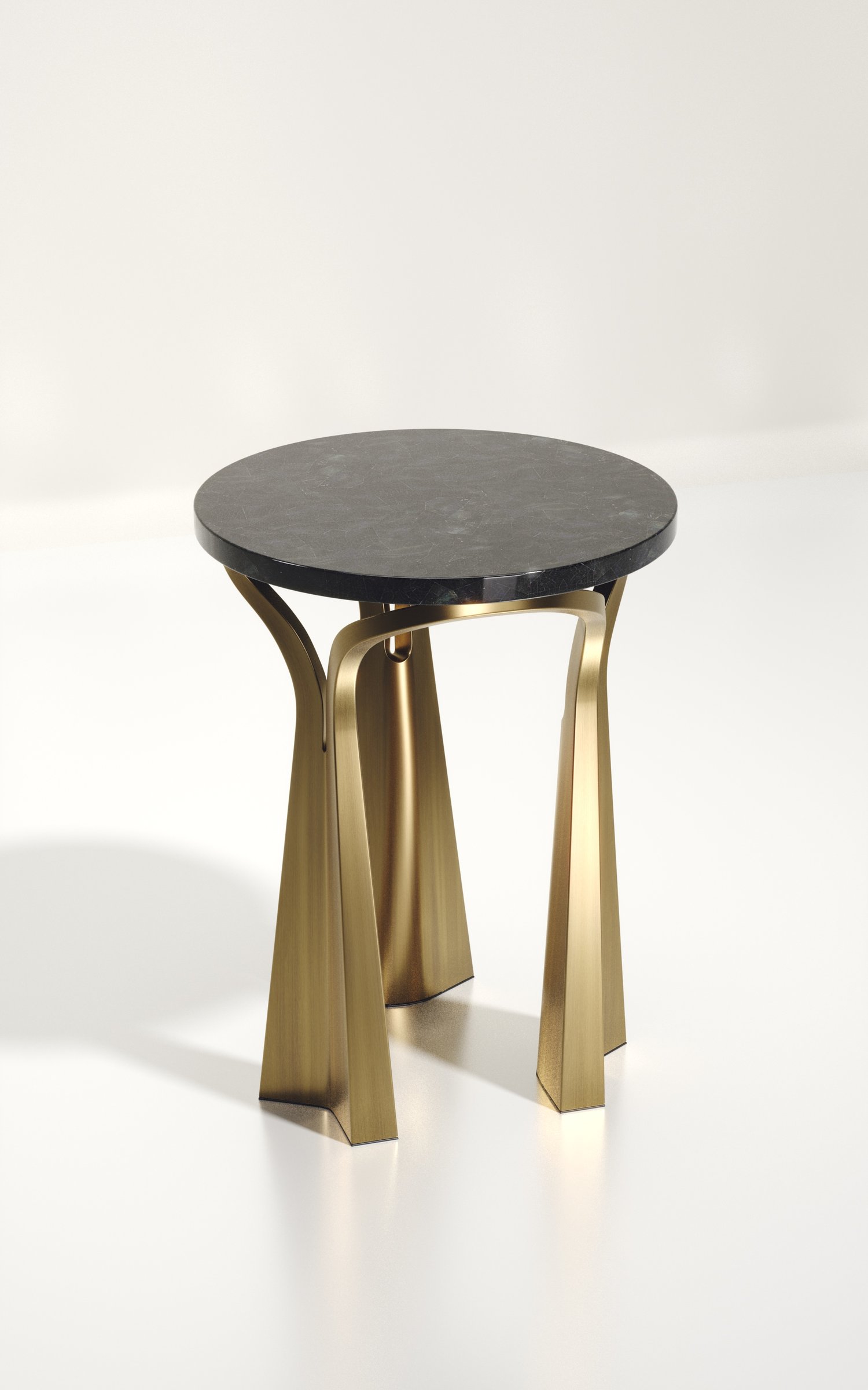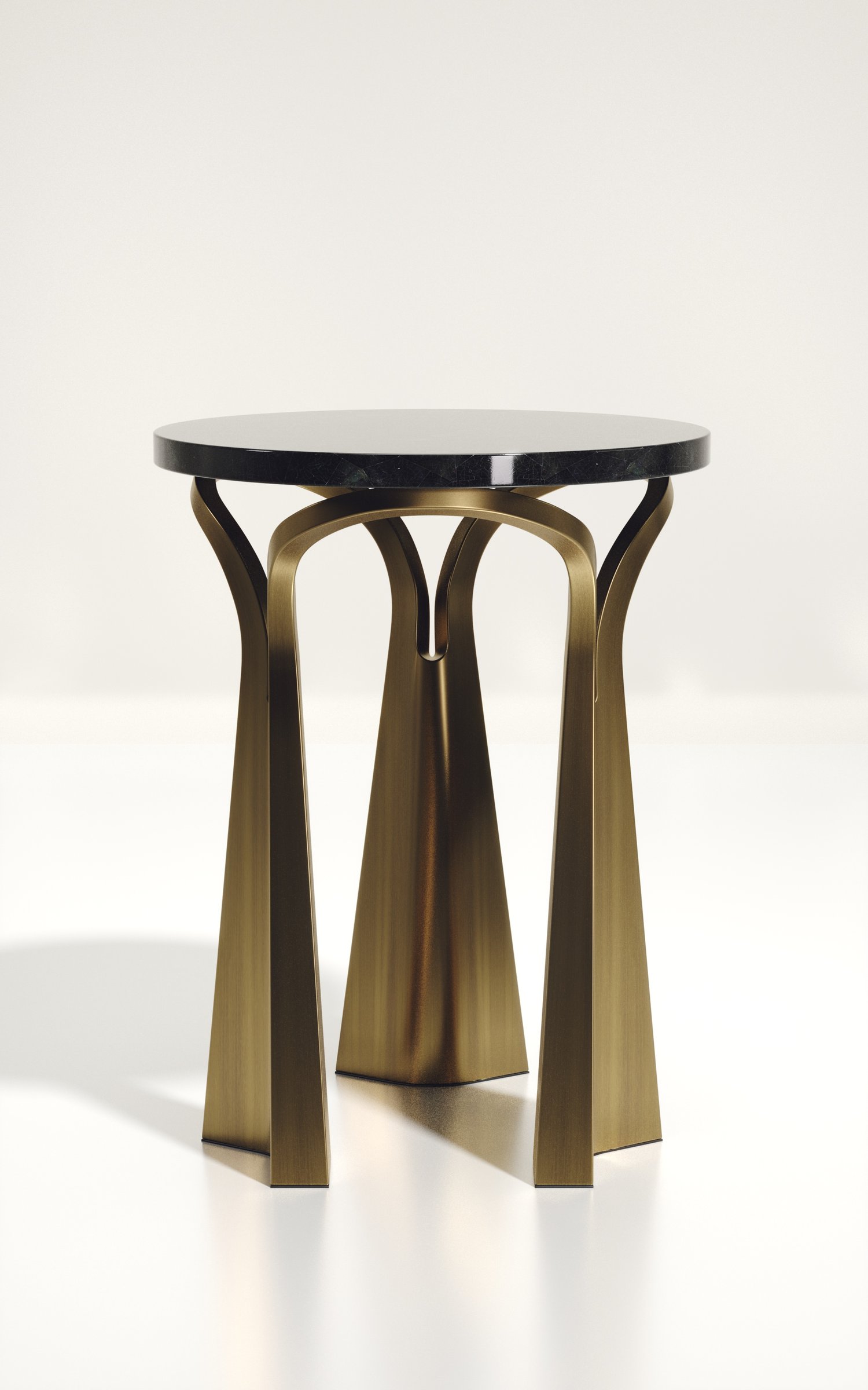 The Arche side table by R&Y Augousti is a stunning piece, a statement in any space. The shagreen or shell inlaid top has a subtle metal inset around the frame, followed by bronze-patina brass sculptural cutout "arched" legs clustered together as the base. This design also exists on a breakfast table and game table version, see images at end of slide. The finish of the shagreen is authentic as it is hand-dyed and the designer calls the finish look: "antique natural shagreen."