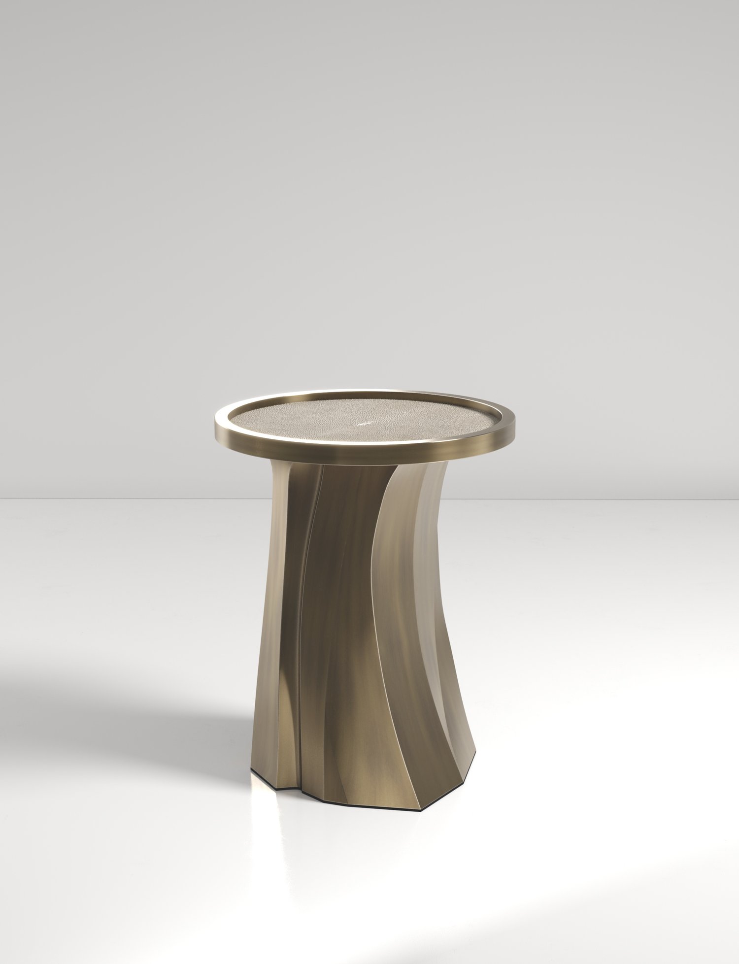 The Alma Nesting Tables by R&Y Augousti are sculptural and versatile pieces. The shagreen inlaid top morphs into a dramatic hand-carved bronze-patina base. The grooves and details on the base allow the tables to have different expressions from all angles.