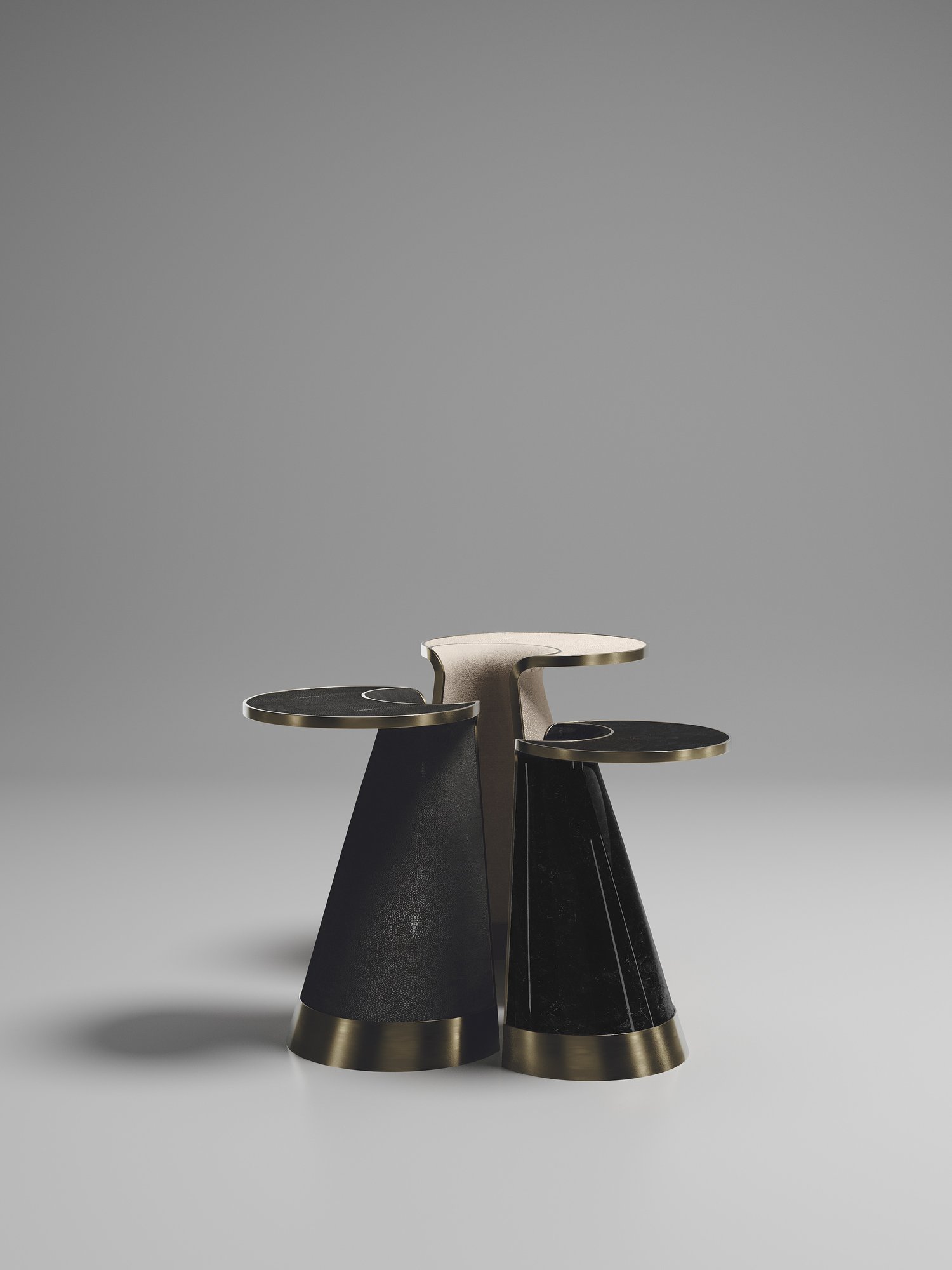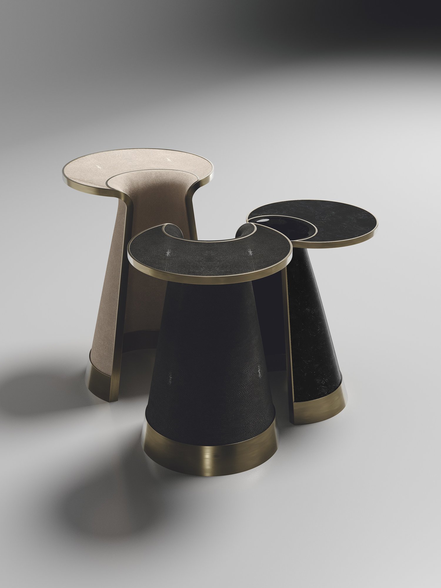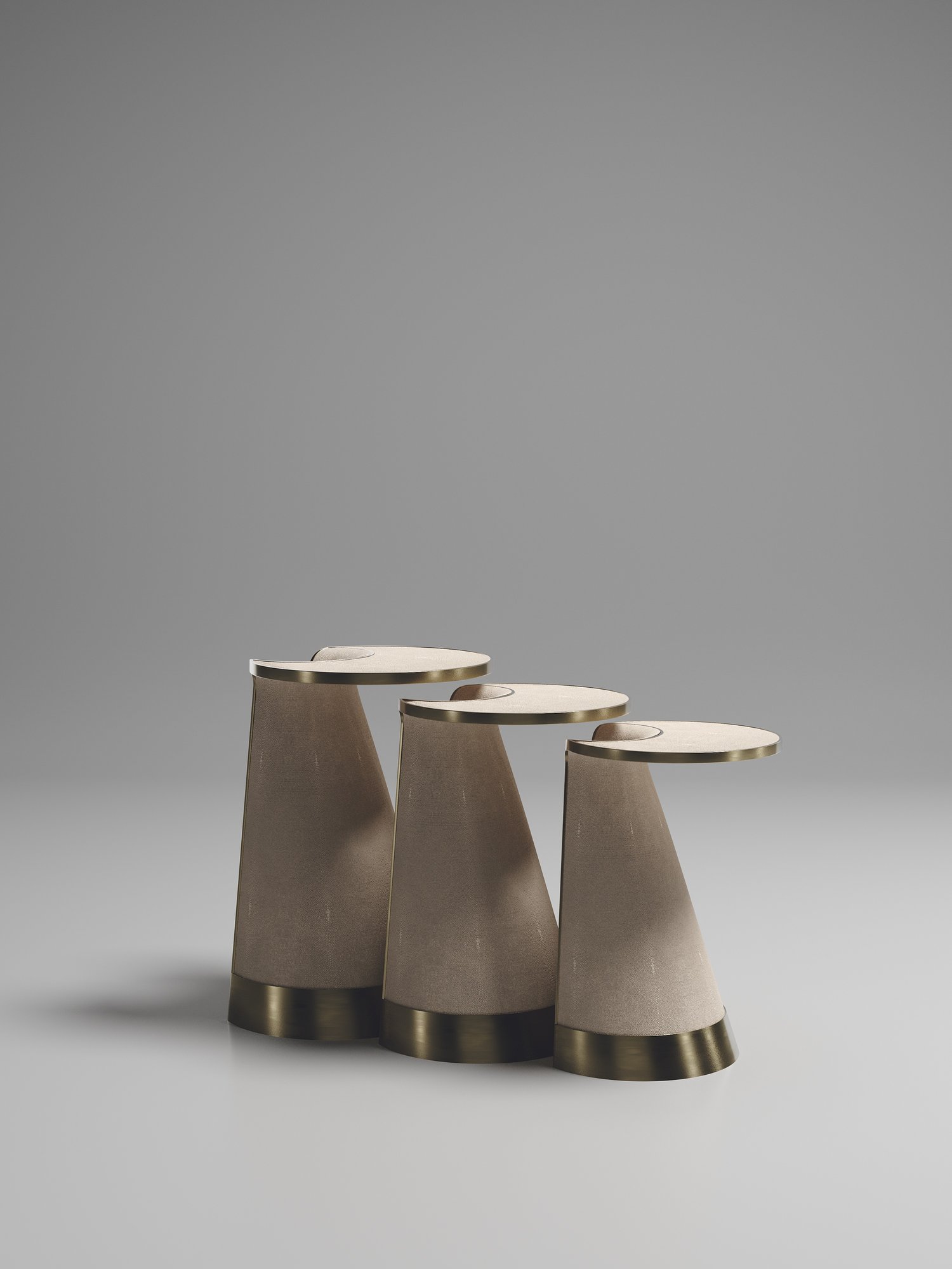 The Nymphea set of 3 nesting side tables by R & Y Augousti explore the brand's iconic DNA of bringing old world artisanal craft into a contemporary and utterly luxury feel. These pieces are done in different finish variations including shagreen, pen shell with bronze-patina brass accents. This listing is for the set of 3 nesting tables, the pieces are available to purchase individually on request. Custom sizing/finishing on request.