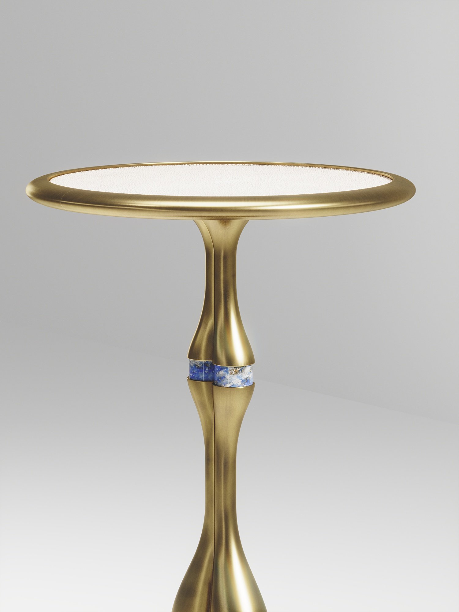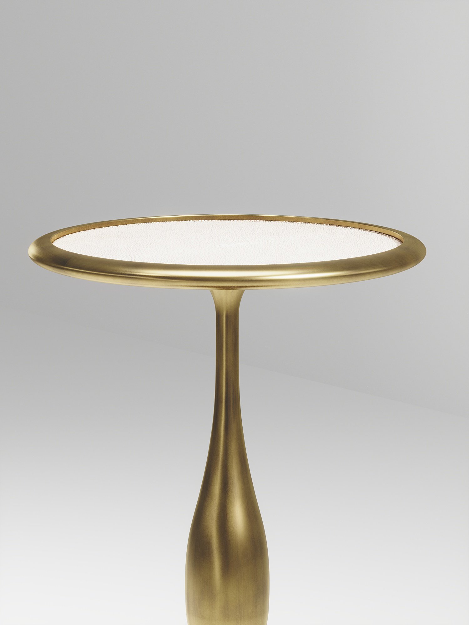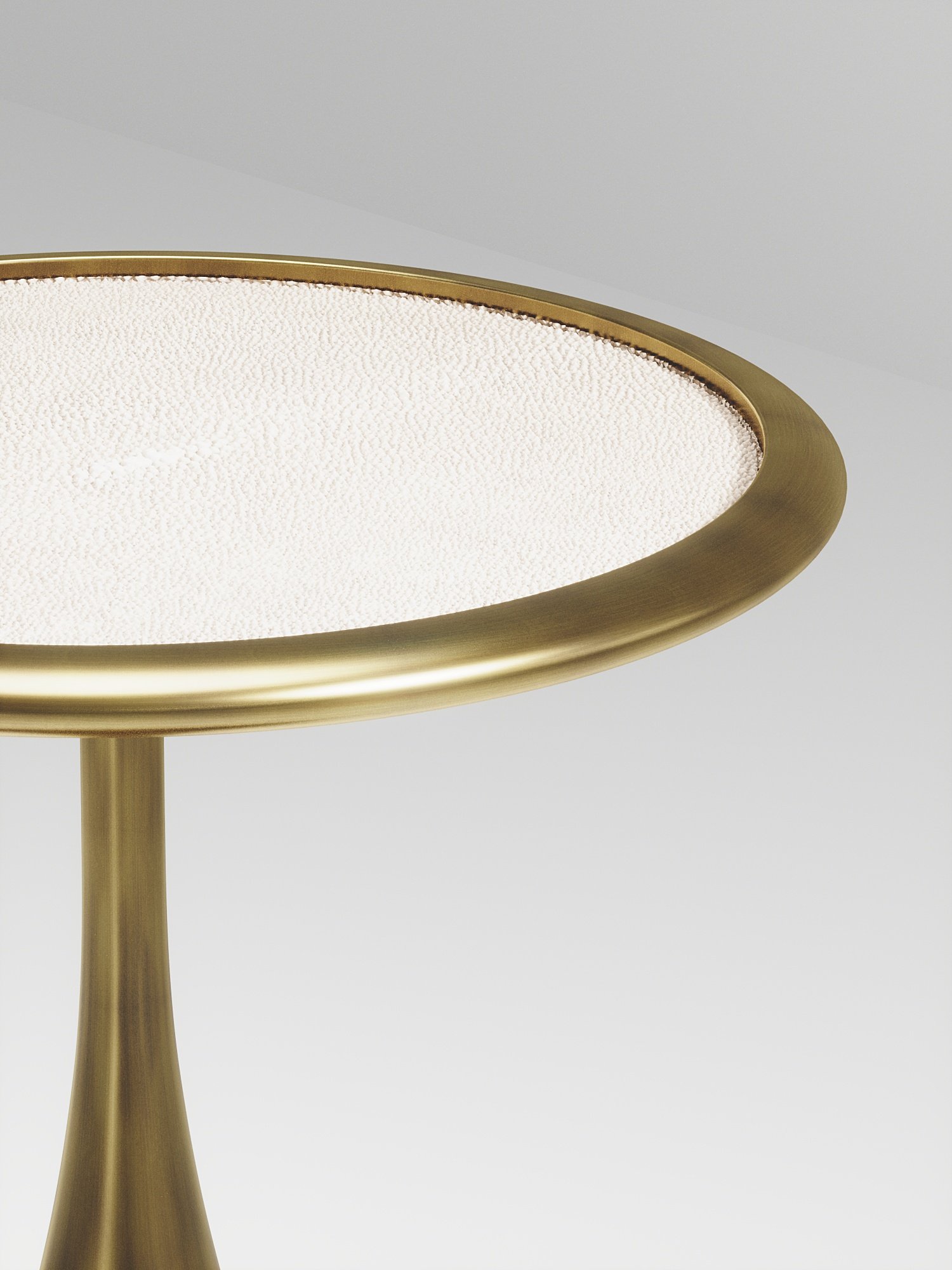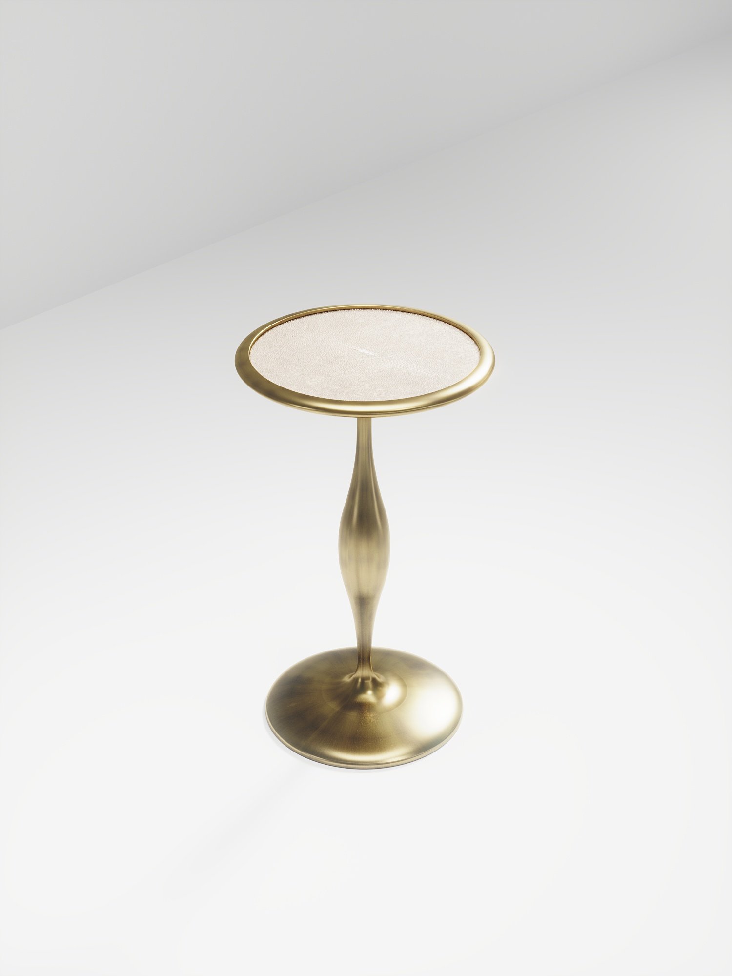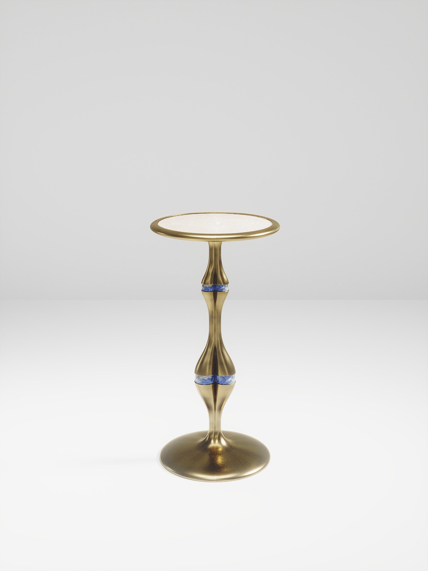 The Frequency side table II by R & Y Augousti is a sleek piece with a vintage-modern feel. The piece explores fluid organic lines with subtle detailing to create the signature Augousti aesthetic. The piece is inlaid in a mixture of cream shagreen and bronze patina brass.