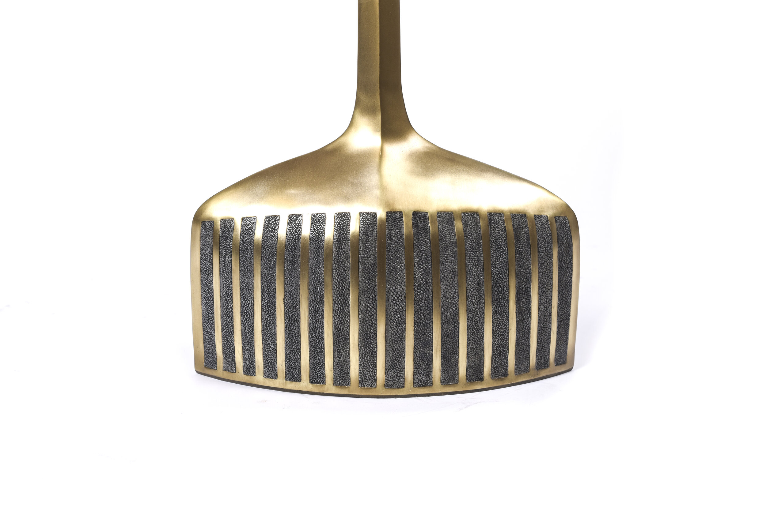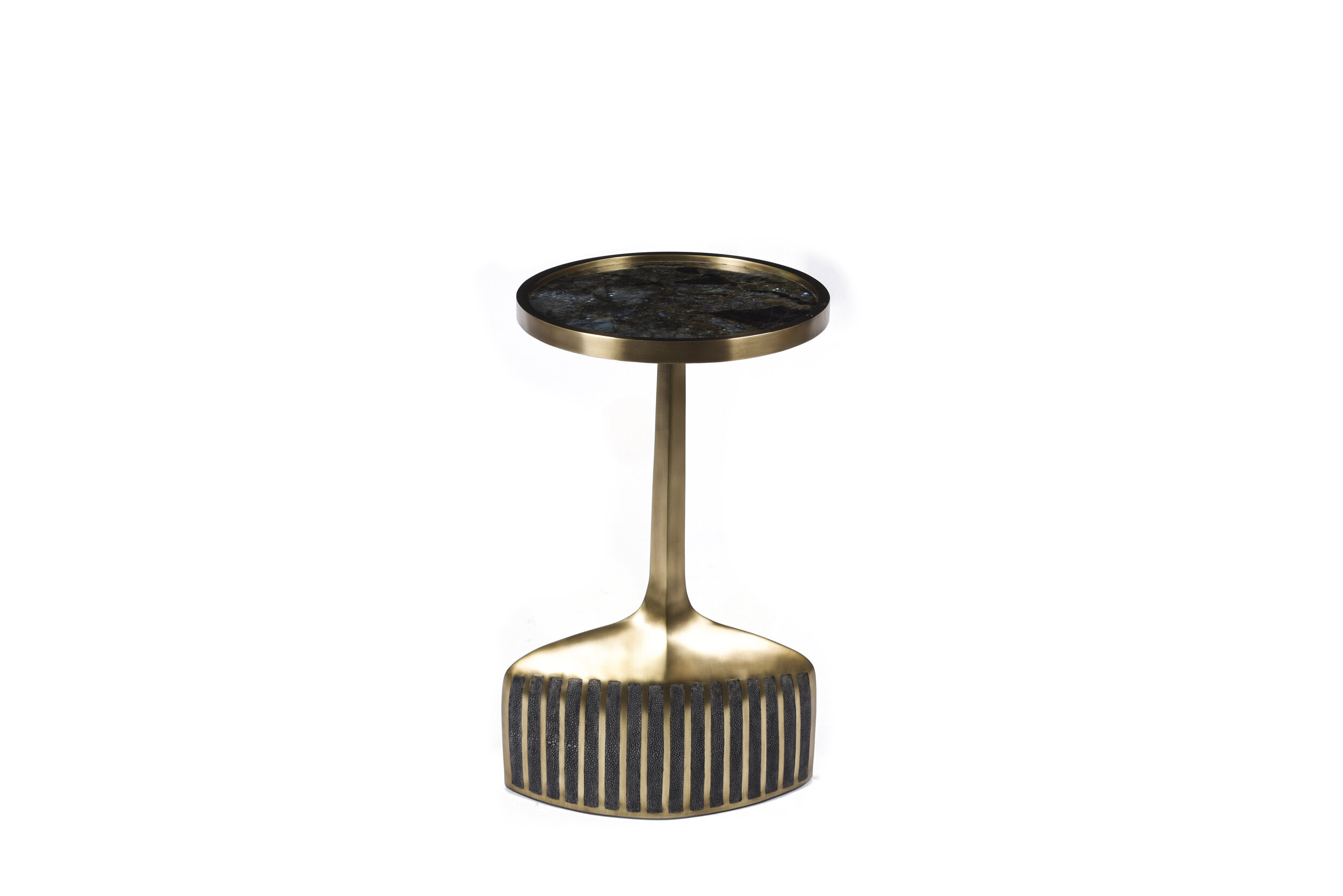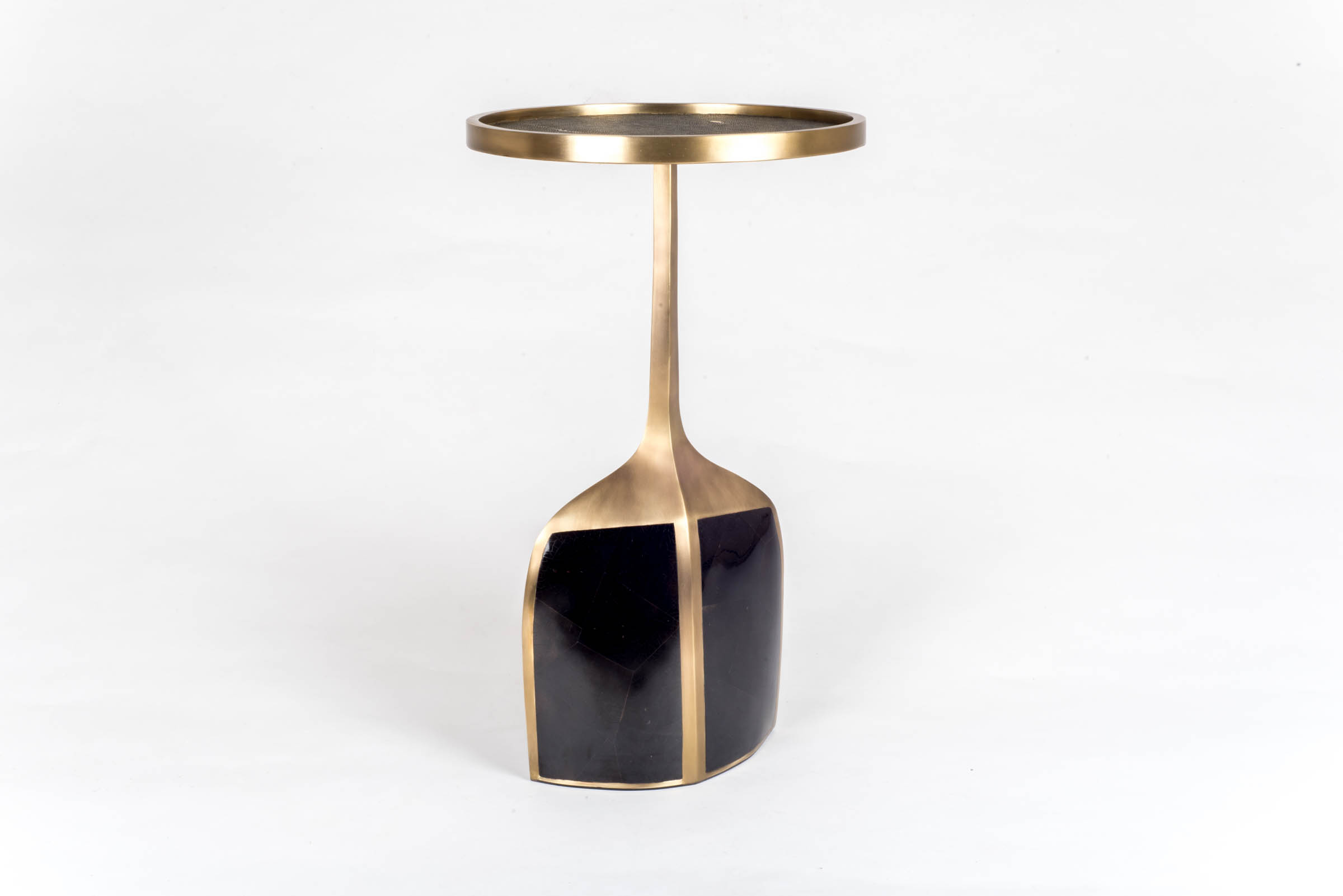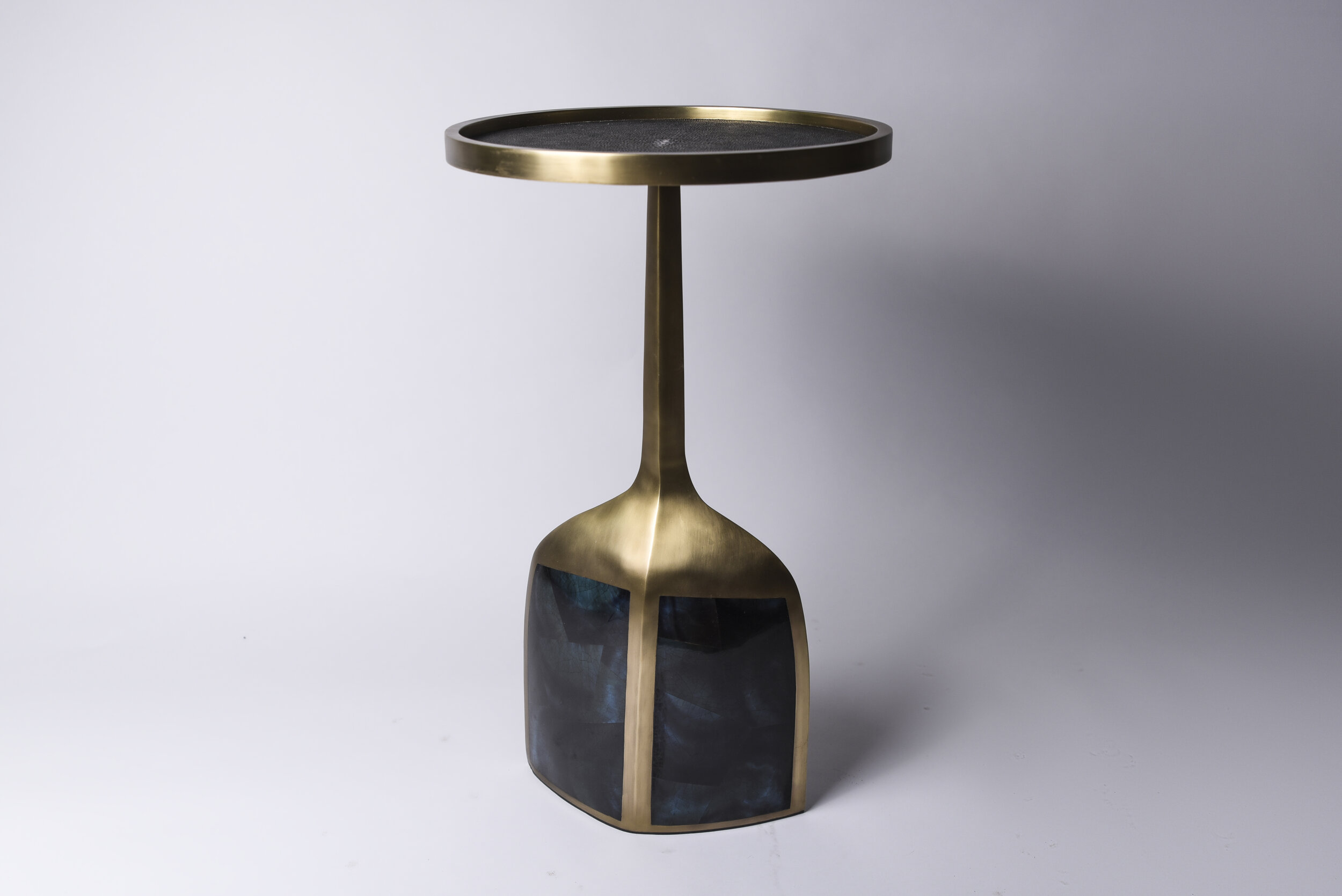 The pedestal side table in small and large are the perfect nesting accent pieces due to their sleek and light aesthetic. The large size is inlaid on the top surface with coal black shagreen, the bottom part a mixture of blue pen shell and bronze patina brass. The small size is inlaid on the top surface with Lemurian and the bottom part a mixture of black shagreen and bronze patina brass. The option to purchase the tables as individuals is available upon request.