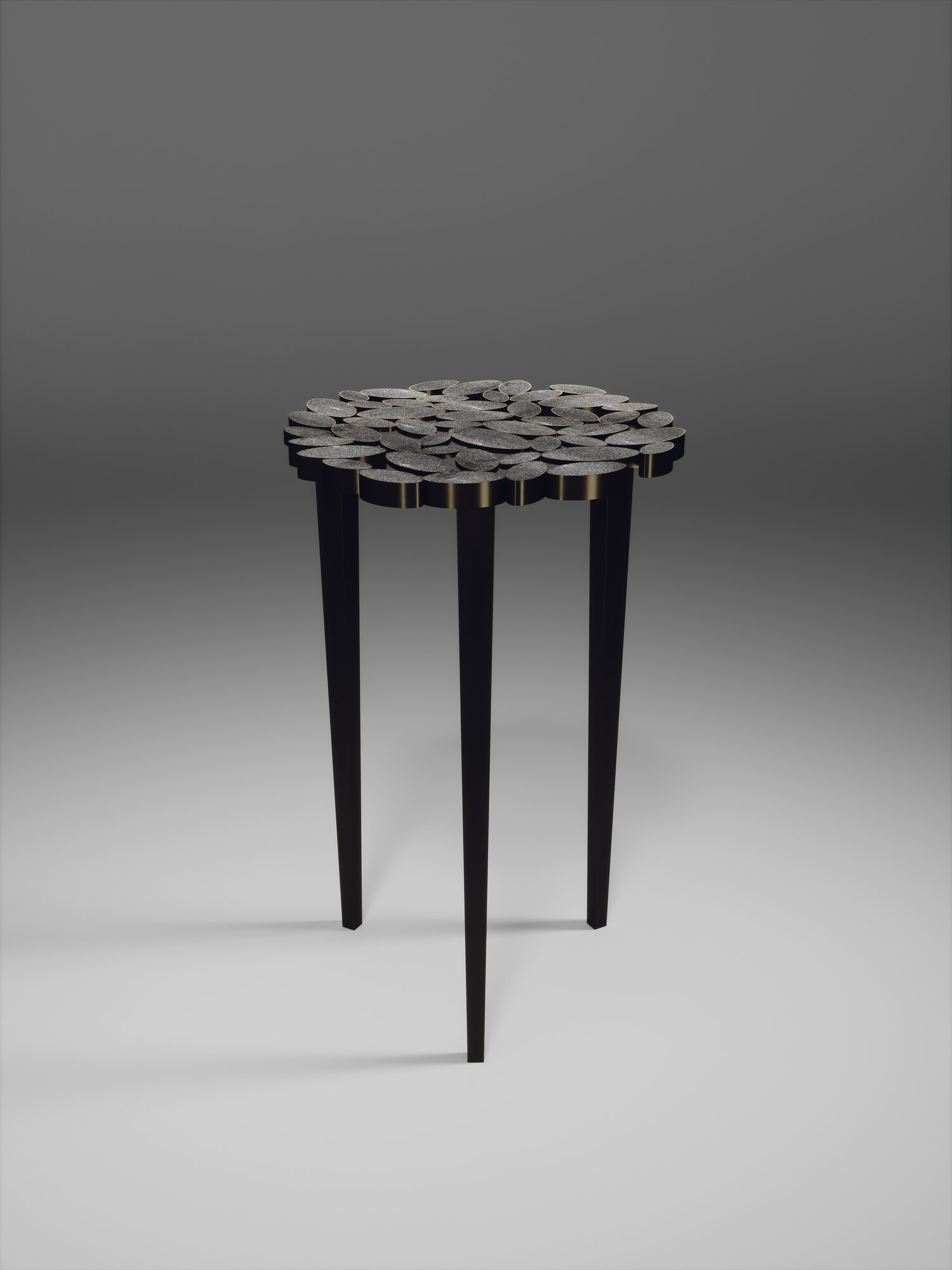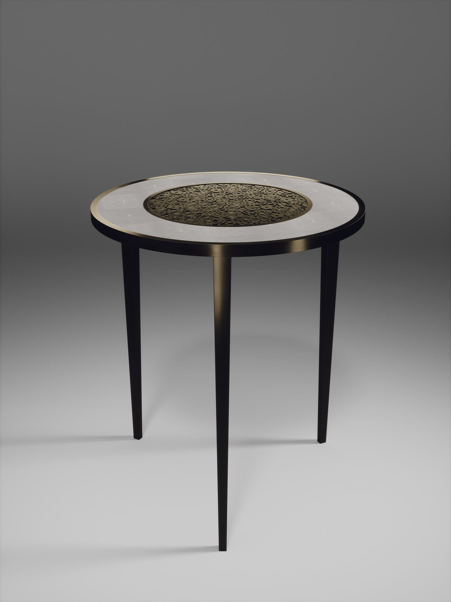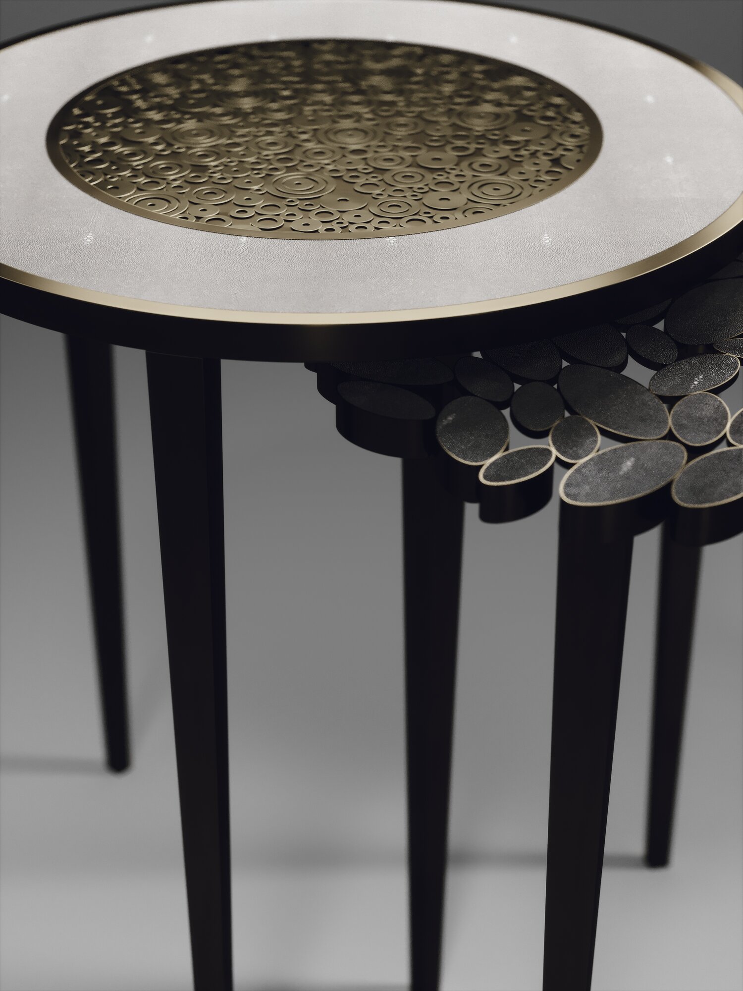 The iconic nesting tables by R&Y Augousti, showcase their signature and renowned artisanal work. The larger nesting table is inlaid in a mixture of cream shagreen and dark bronze-patina brass, and the smaller in a mixture of black shagreen and dark-bronze patina brass. The circle inlay pattern seen on the center top of the larger nesting table is an iconic Augousti pattern originating from their first collections in 1990. Each circle is handcut and then hammered by hand onto the shagreen table.