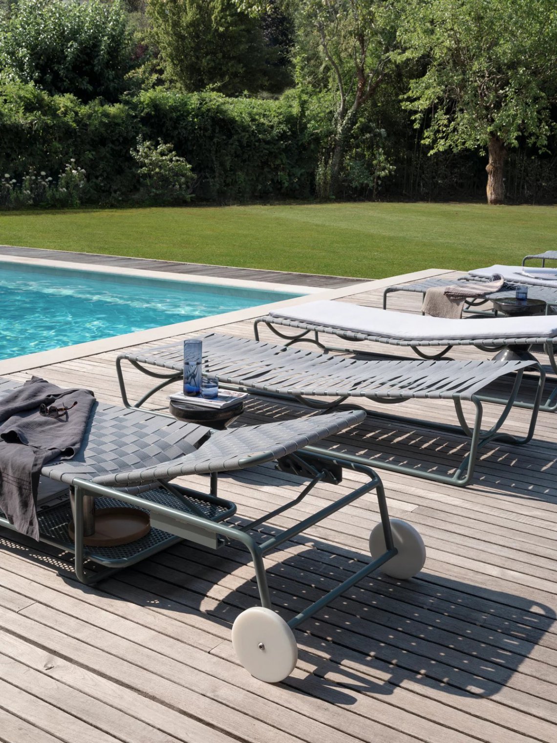 Il lettino Inout 884 è caratterizzato da una struttura fissa, non reclinabile, in alluminio verniciato opaco bianco, grigio o salvia. La struttura è arricchita da un intreccio di cinghia elastica blu, nero, tabacco o grigio, sul quale adagiare un eventuale materassino sfoderabile imbottito per una maggiore morbidezza.