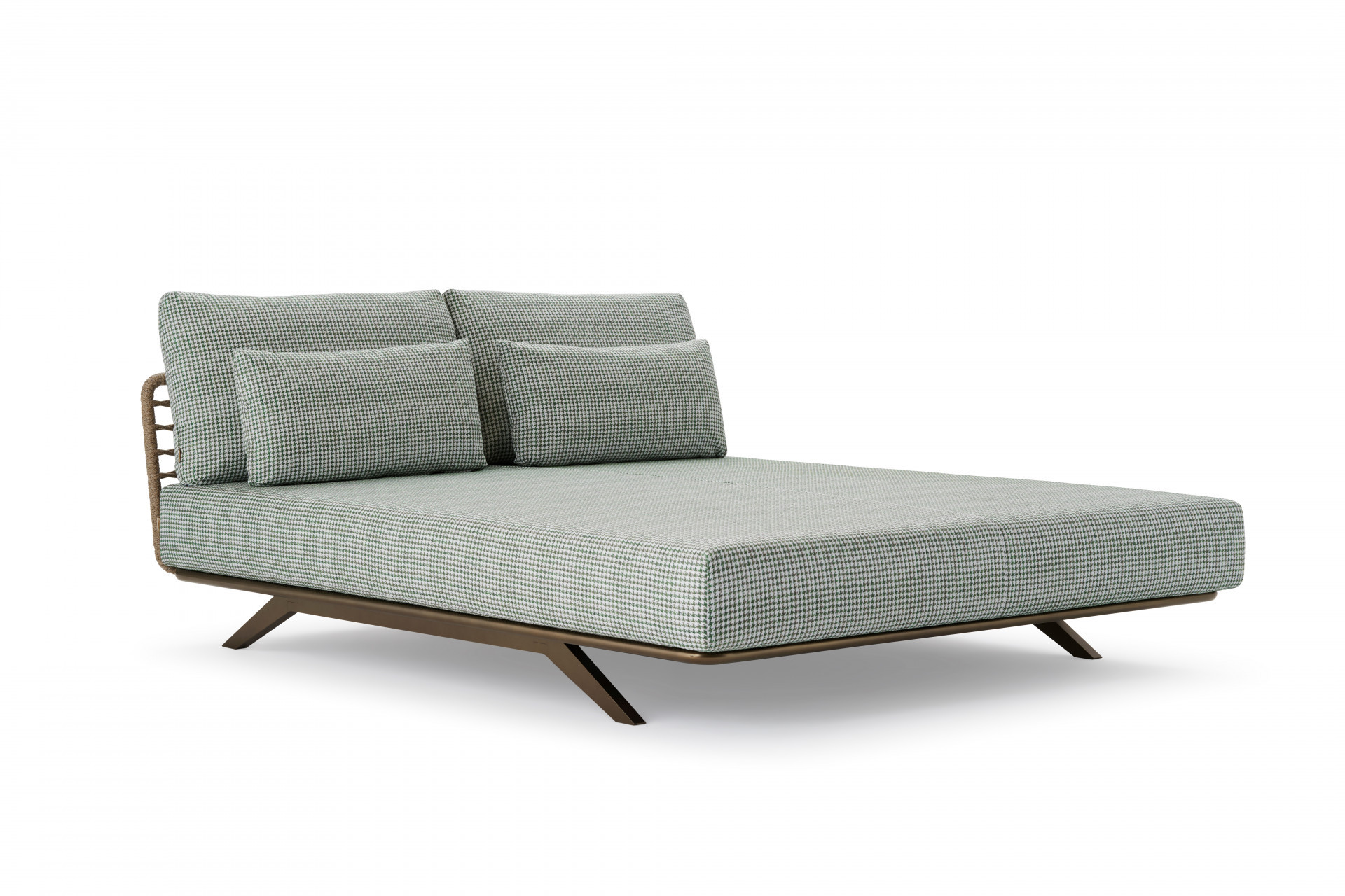 Elemento daybed in acciaio inox Aisi 304 verniciato a polveri e alluminio intrecciato in Oval Trendyrope. Componente modulare della collezione Arman, un concept di design che consente di combinare i diversi elementi in modo armonioso e personale. La generosa e comoda seduta dalle importanti dimensioni invita al relax, regalando una sensazione di comfort accogliente e conferendo un'eleganza contemporanea agli spazi circostanti. L'intera gamma è progettata sia per l'arredamento residenziale che per quello contract, sia per gli spazi outdoor che indoor.