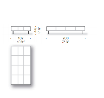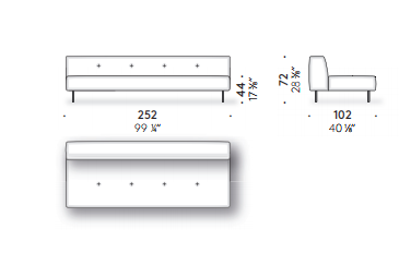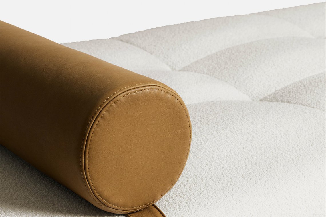 Erei’s domestic landscapes are formed by straight lines and different heights that interact with one another. Elisa Ossino’s project had to include a daybed with seams that create an original tufted capitonné motif. A leather cylinder anchored by an integrated belt serves as a headrest. A large leather pocket and two square or rectangular cushions complete the collection.