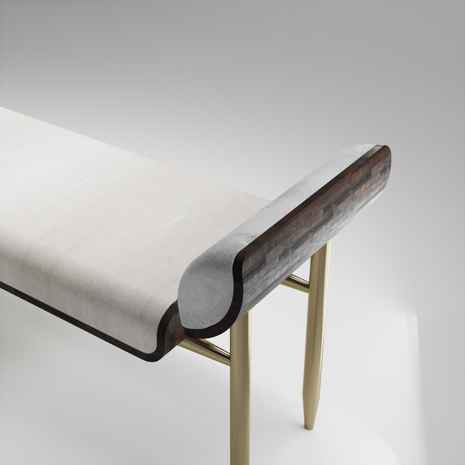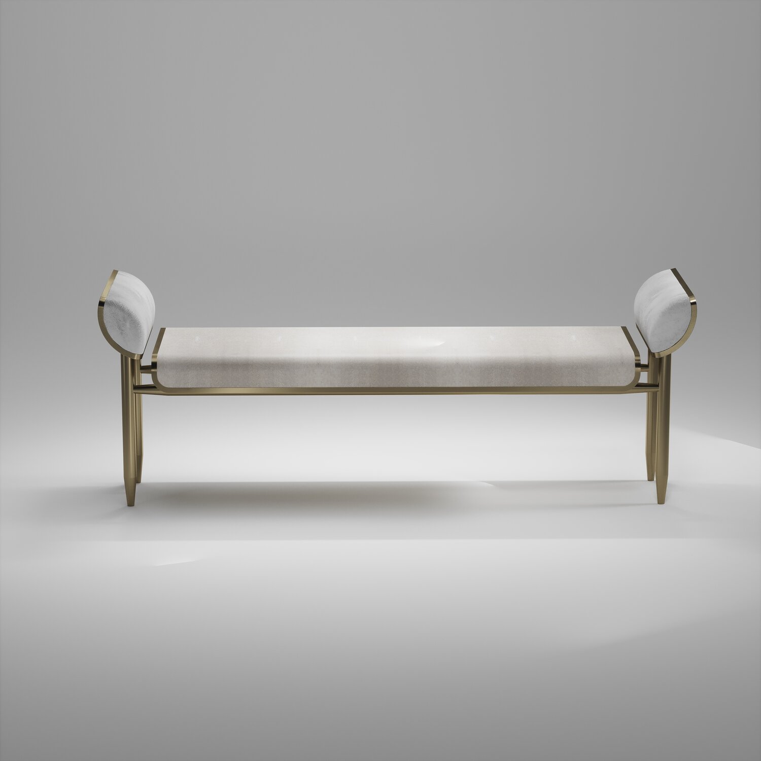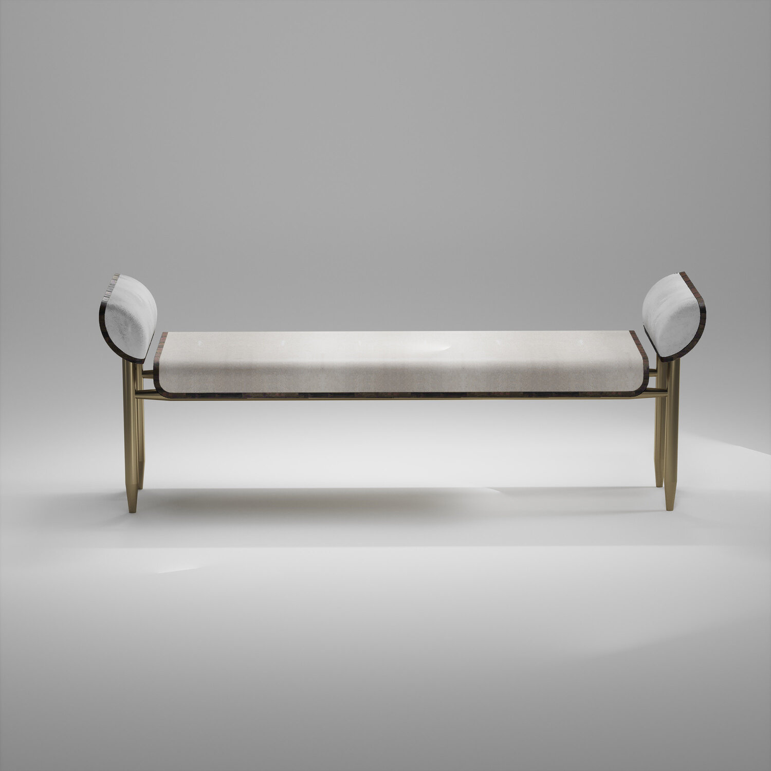 Inspired by the original Dandy bench by KIFU PARIS, the Dandy II Bench is the ultimate luxury seating. The seating area is inlaid in cream shagreen and the frame, legs and sides of the bench are completely inlaid in bronze-patina brass. On the left and right side of the bench both armrests are upholstered in white vachette. Other versions are also available as part of the Dandy II Capsule.
