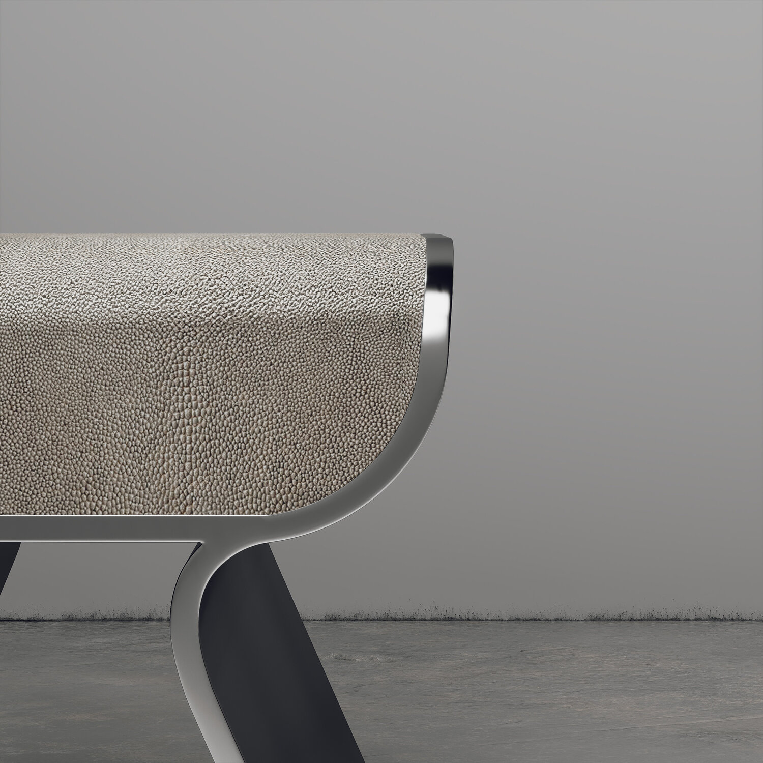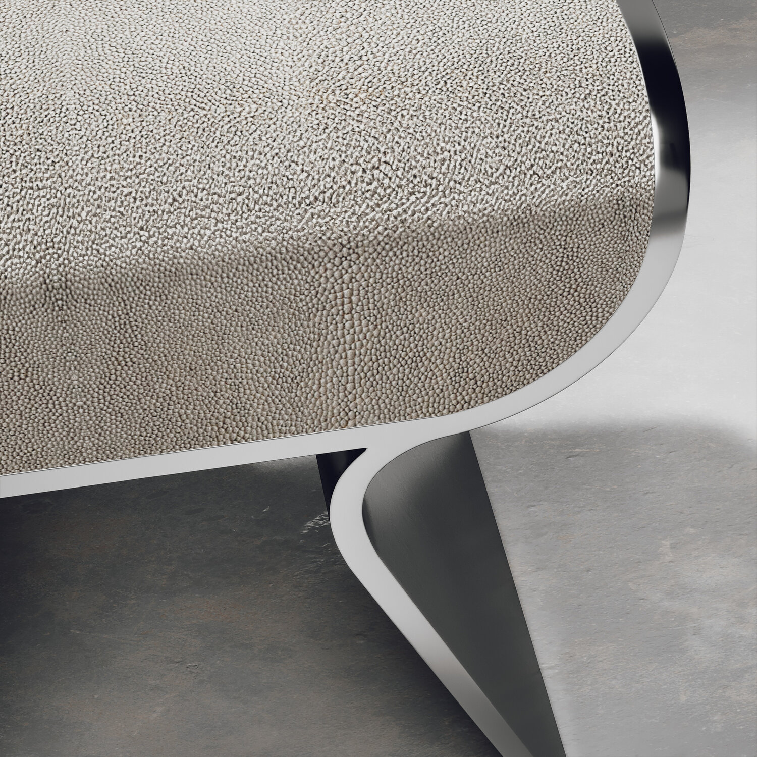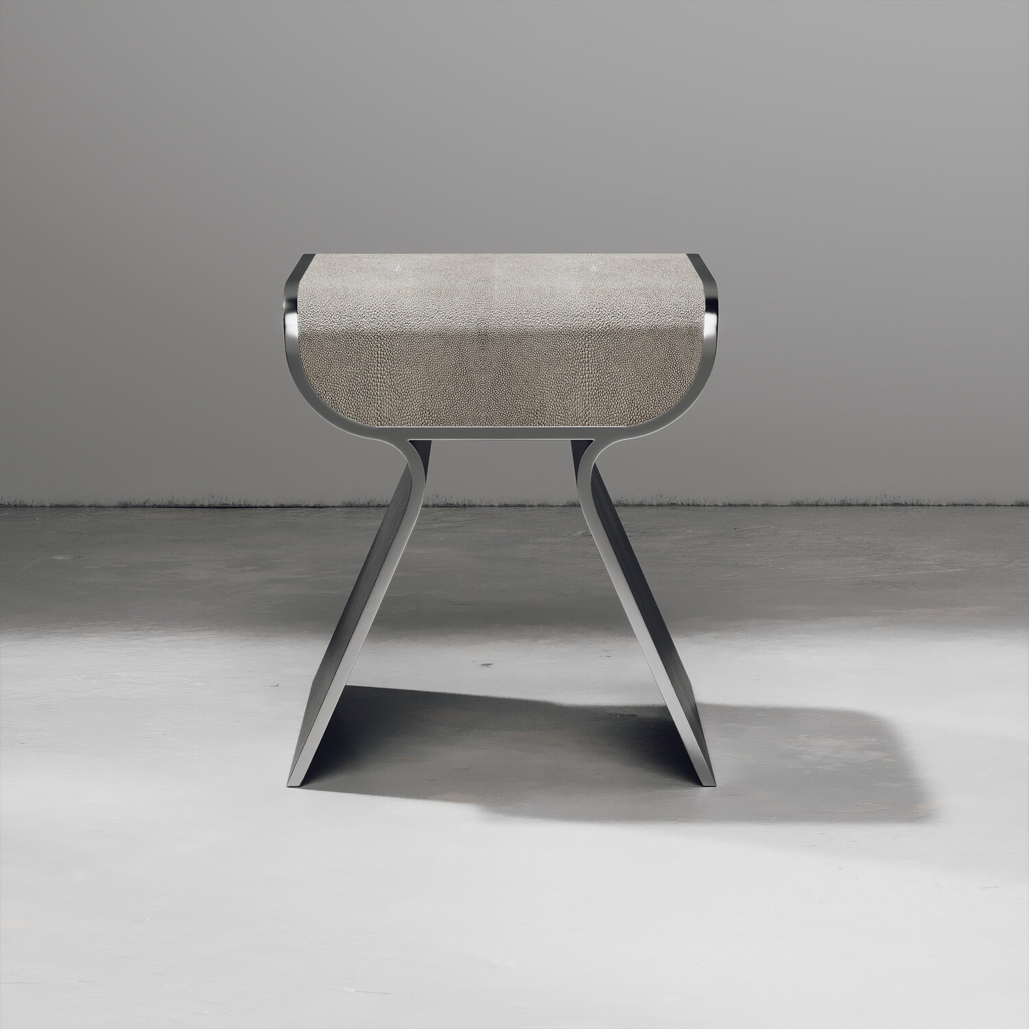 The dandy stool inlaid in cream shagreen is a chic seating piece for any space. The sides of the pieces are completely inlaid in polished steel adding another luxurious and modern element to the piece. Available in other finishes and as a bench, see images at end of slide. This piece is designed by Kifu Augousti, the daughter of Ria and Yiouri Augousti.