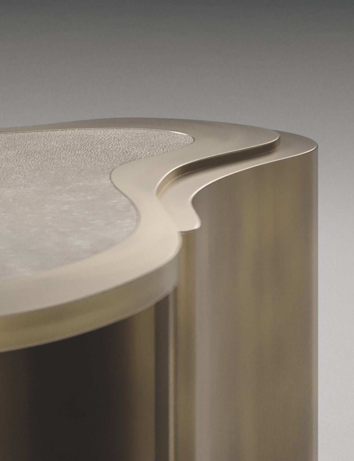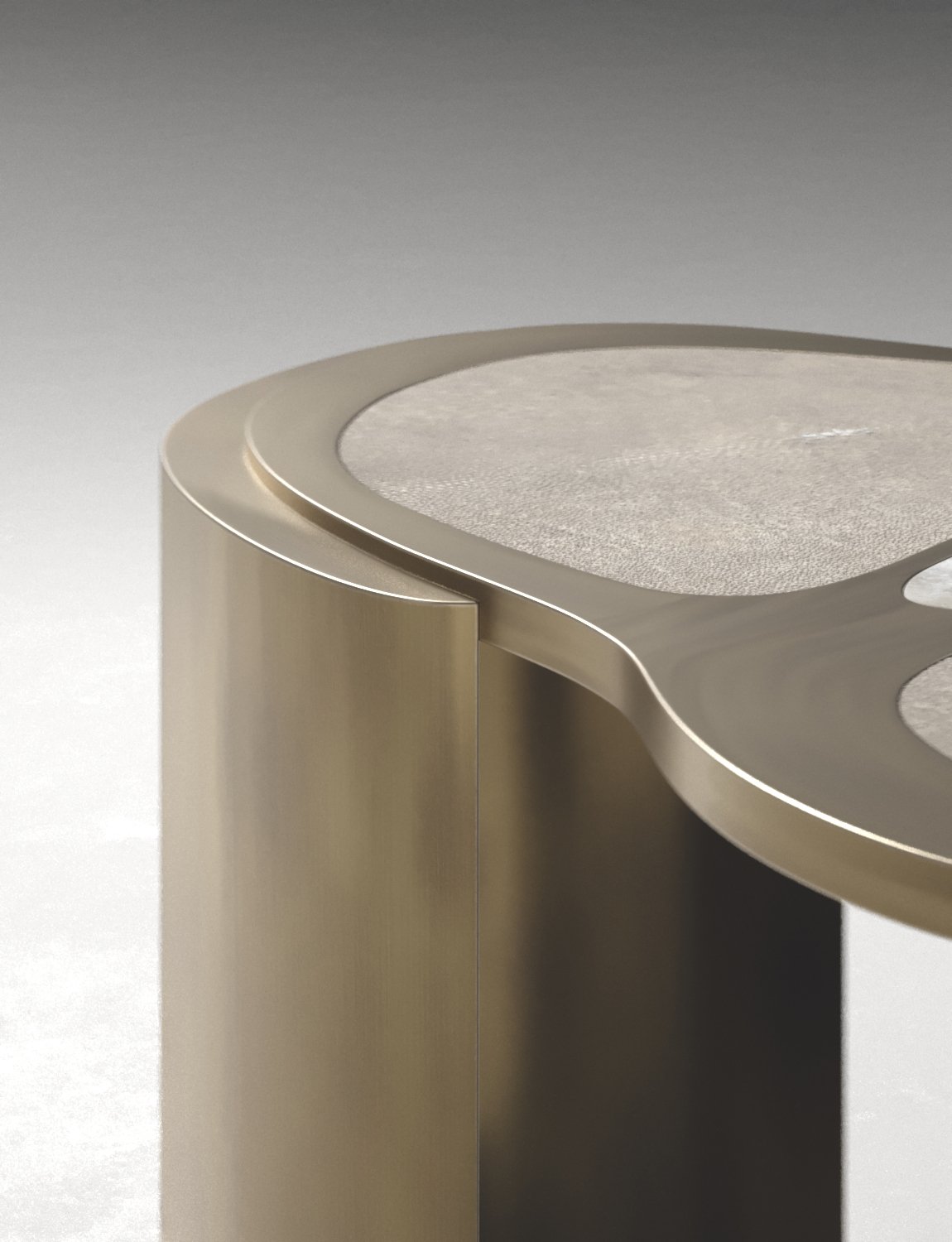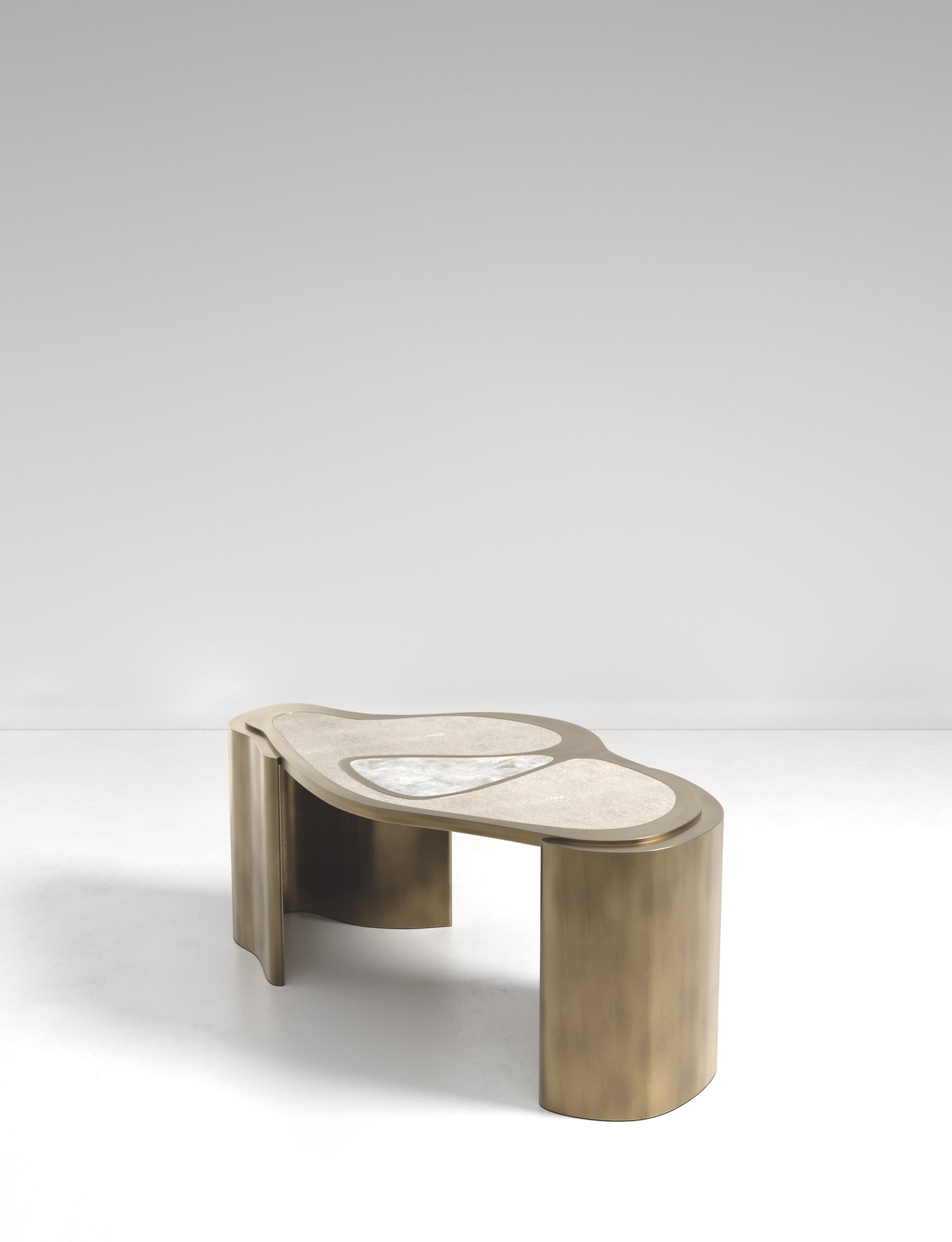 The Mask Coffee Table by Kifu Paris is a versatile and organic piece. The amorphous top and base are inlaid in a mixture of shagreen, white quartz or shell and bronze-patina brass. This piece is designed by Kifu Augousti the daughter of Ria and Yiouri Augousti. Available as a nesting side table and a coffee table
