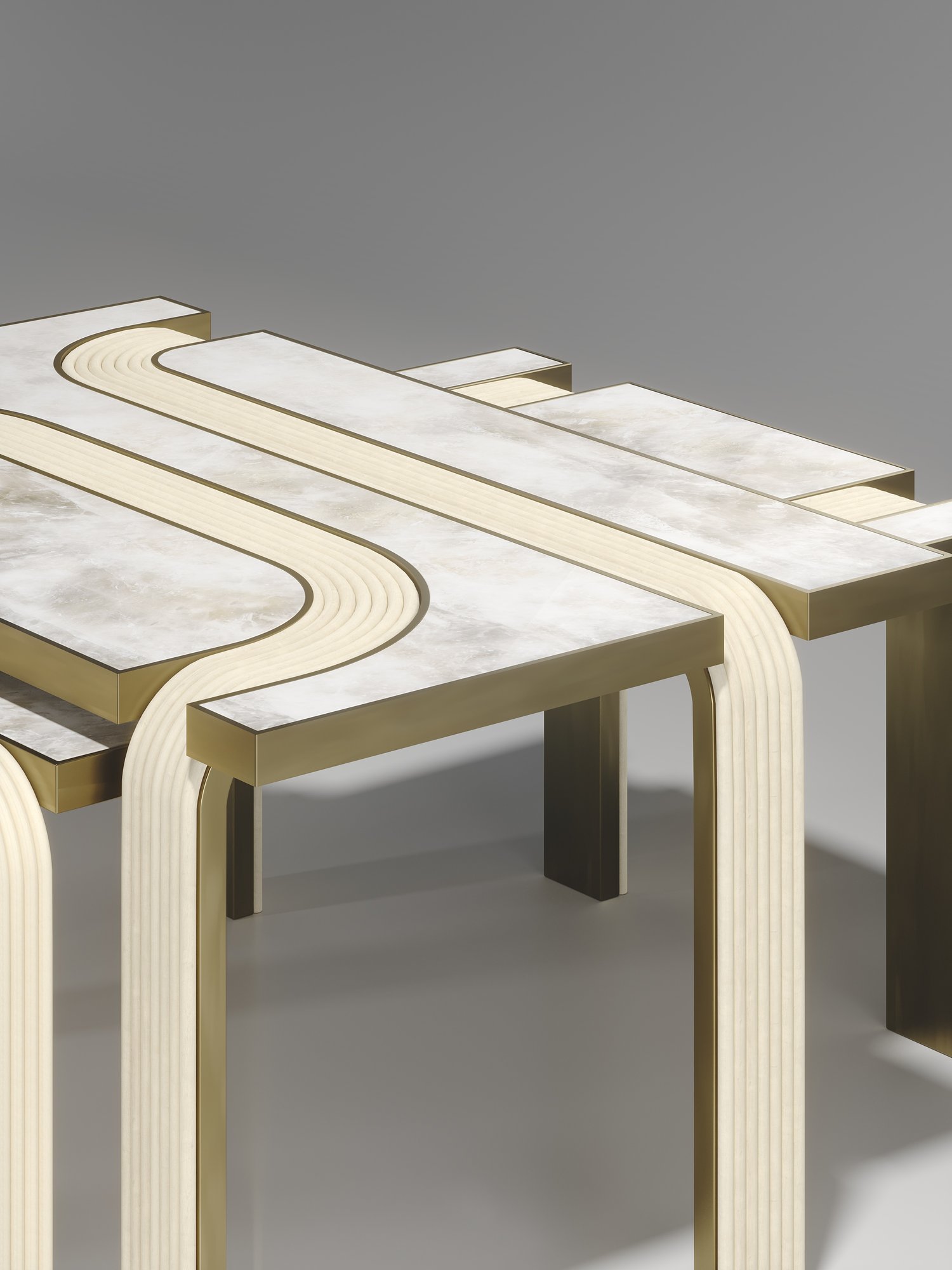 The Set of 2 Licol Nesting Coffee Tables by R & Y Augousti explore the brand's iconic DNA of bringing old world artisanal craft into a contemporary and utterly luxury feel. These tables are done in different finish variations including shagreen and pen shell with bronze-patina brass accents, and inlay mixed with rattan. Custom sizing/finishing on request.