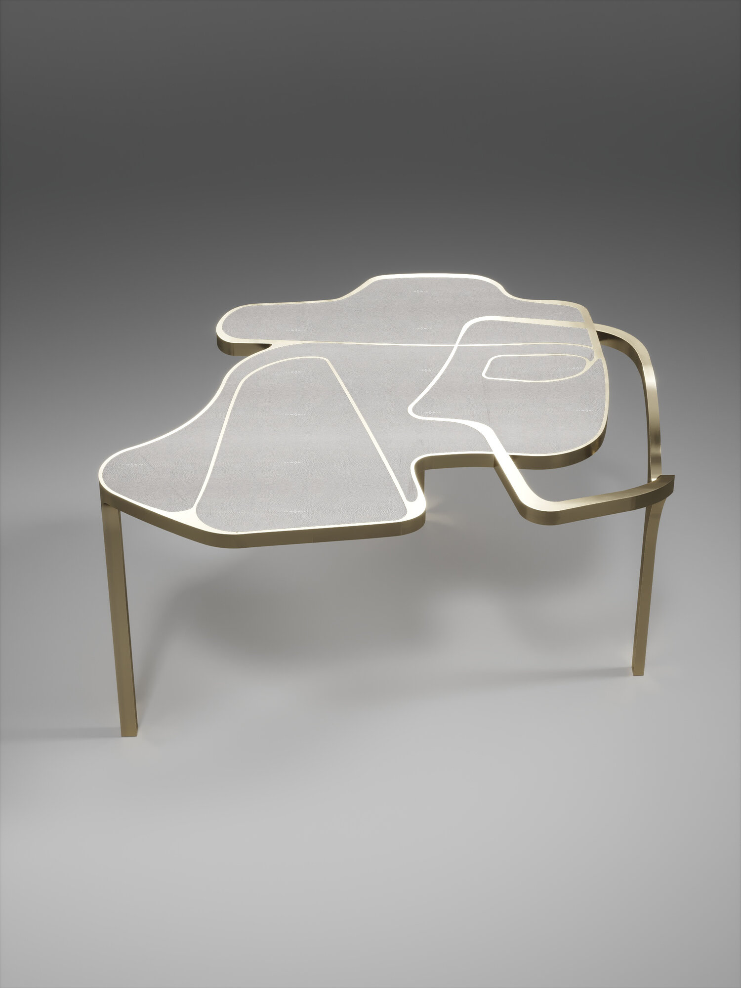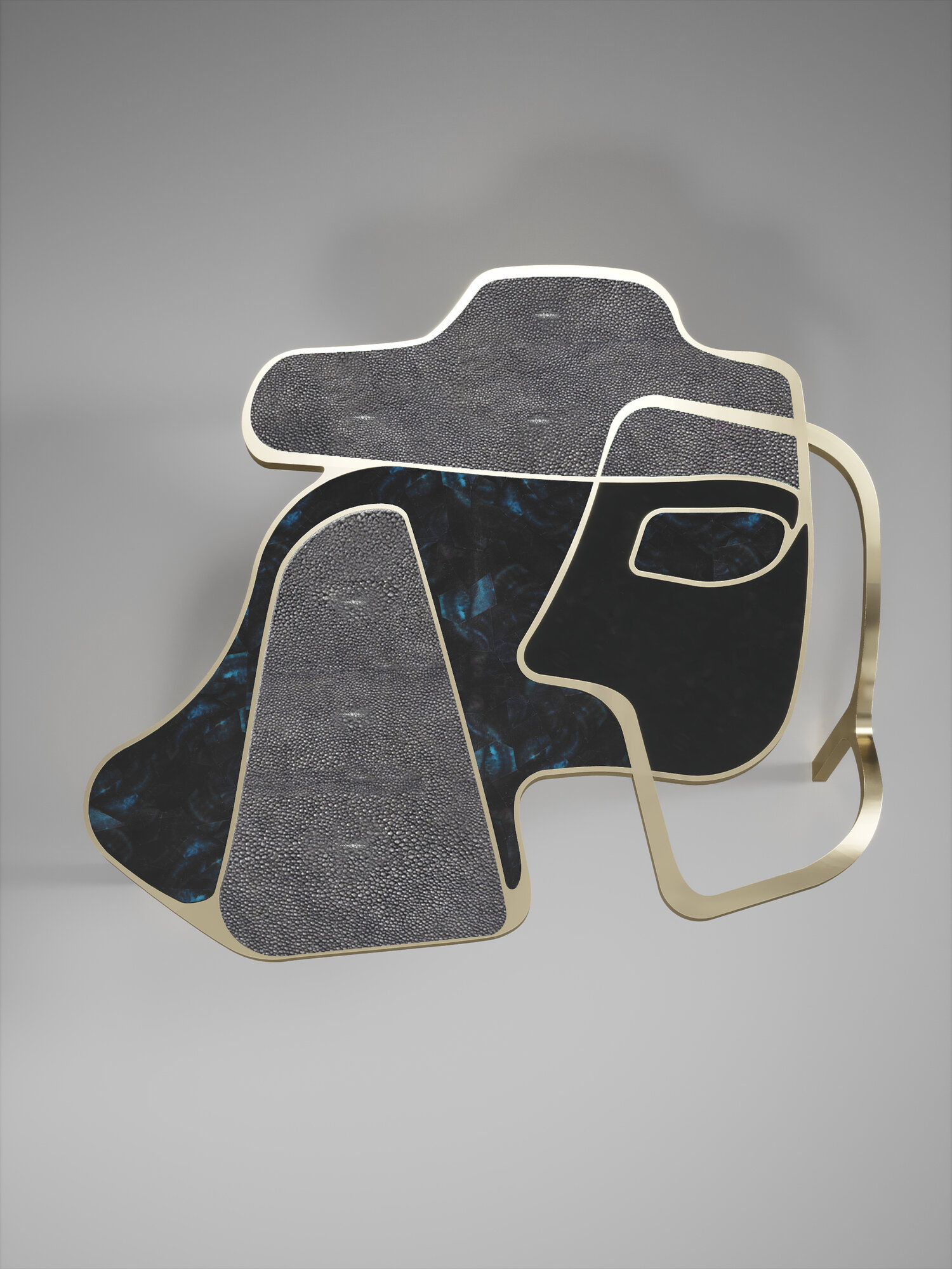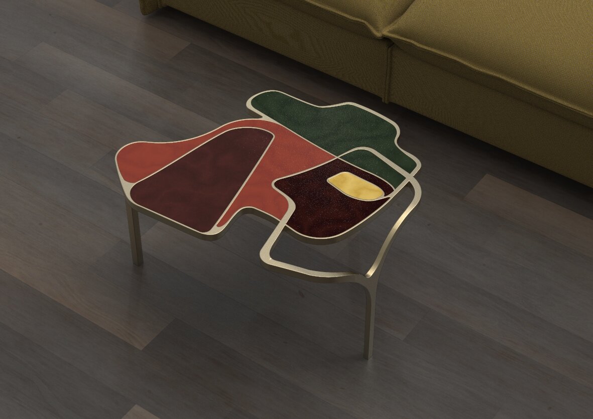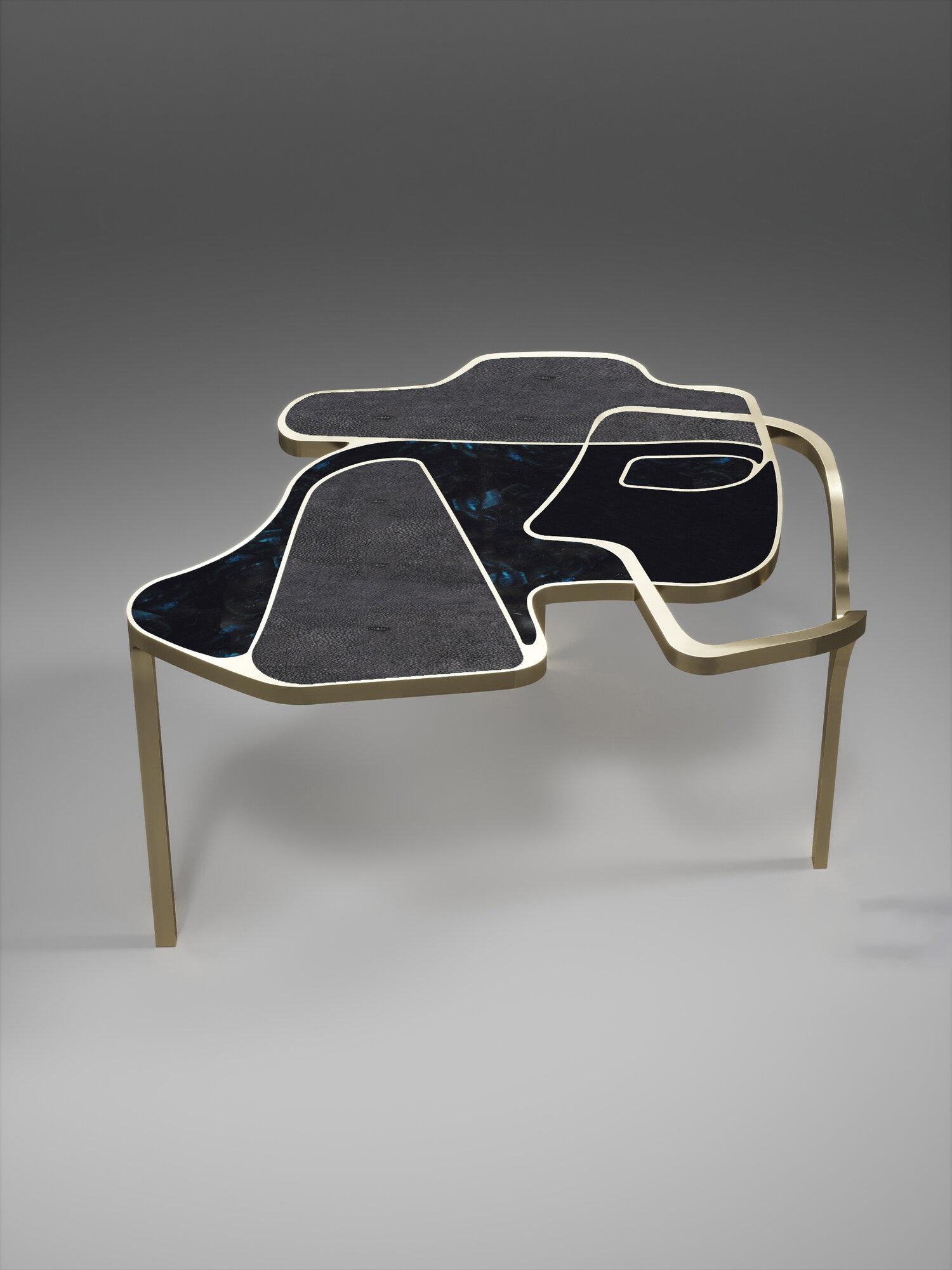The Cocteau coffee table by R&Y Augousti is a truly one of a kind piece. The sculptural and ethereal piece has abstract forms, shapes and figures within it that one could interpret in different ways. The bronze-patina brass inserts in the inlaid surface "melt" organically into the floating frame and base to create this overall beautiful amorphous shape.