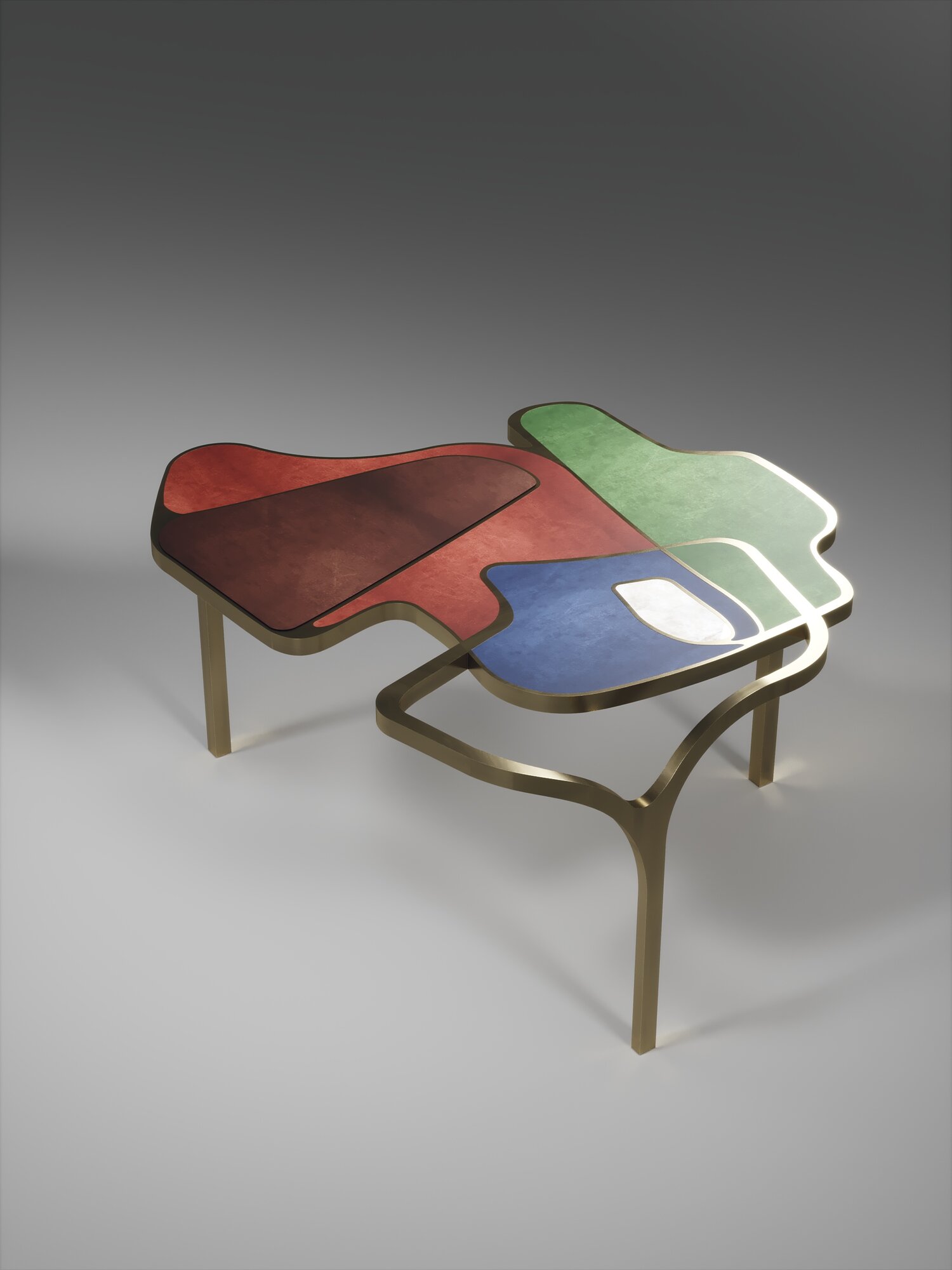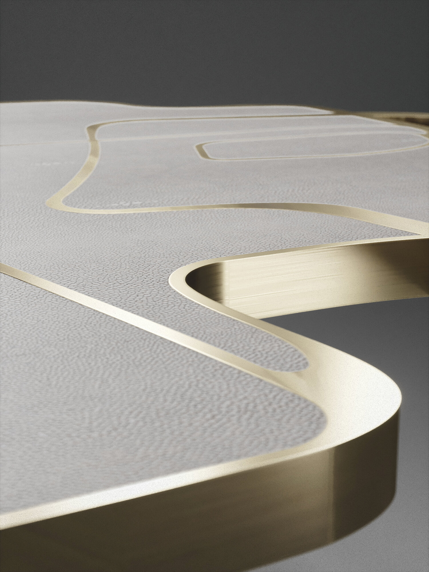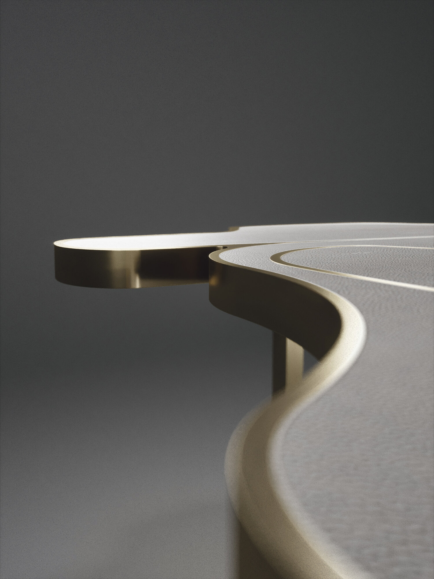 The Cocteau coffee table by R&Y Augousti is a truly one of a kind piece. The sculptural and ethereal piece has abstract forms, shapes and figures within it that one could interpret in different ways. The bronze-patina brass inserts in the inlaid surface "melt" organically into the floating frame and base to create this overall beautiful amorphous shape.