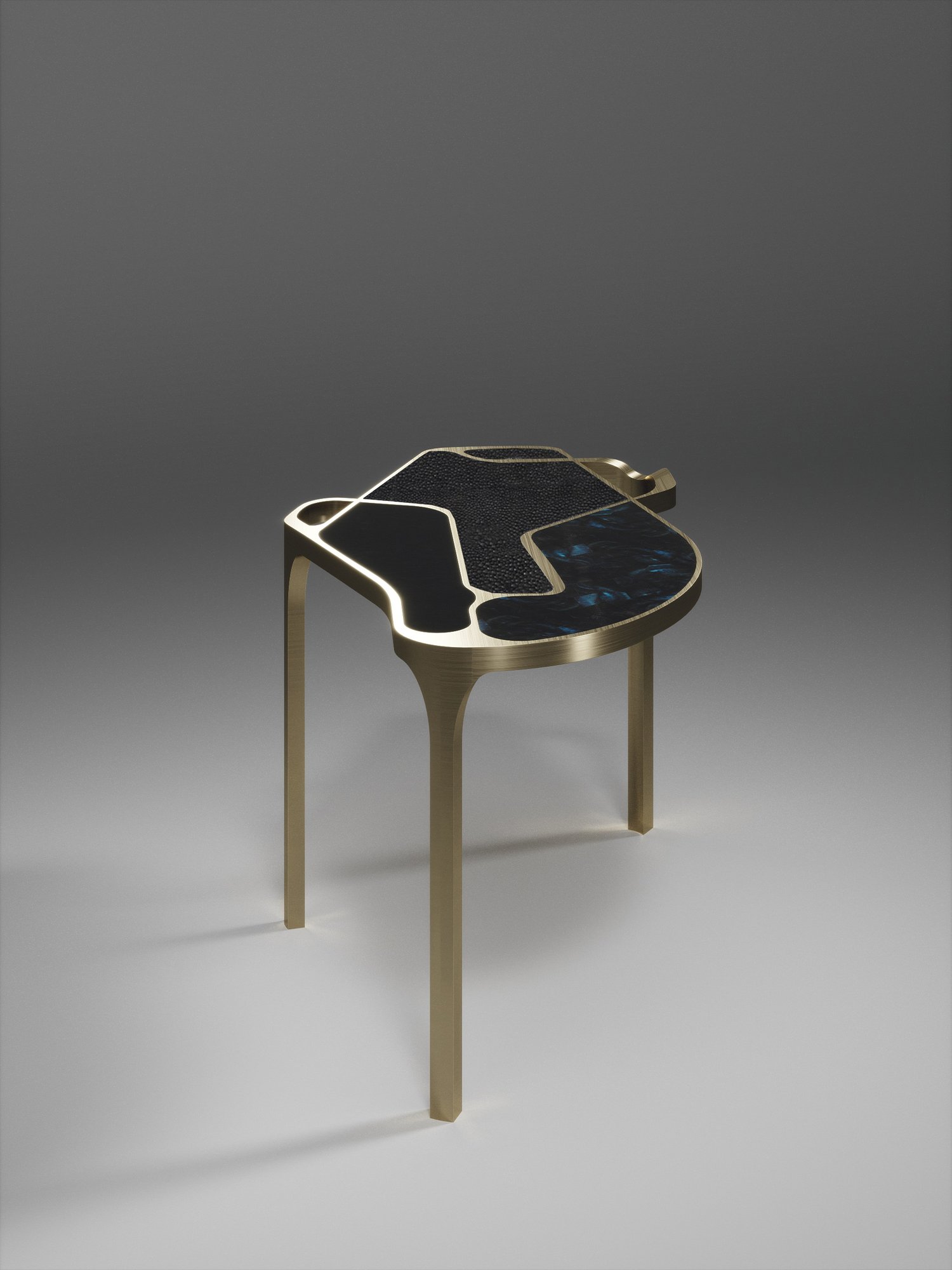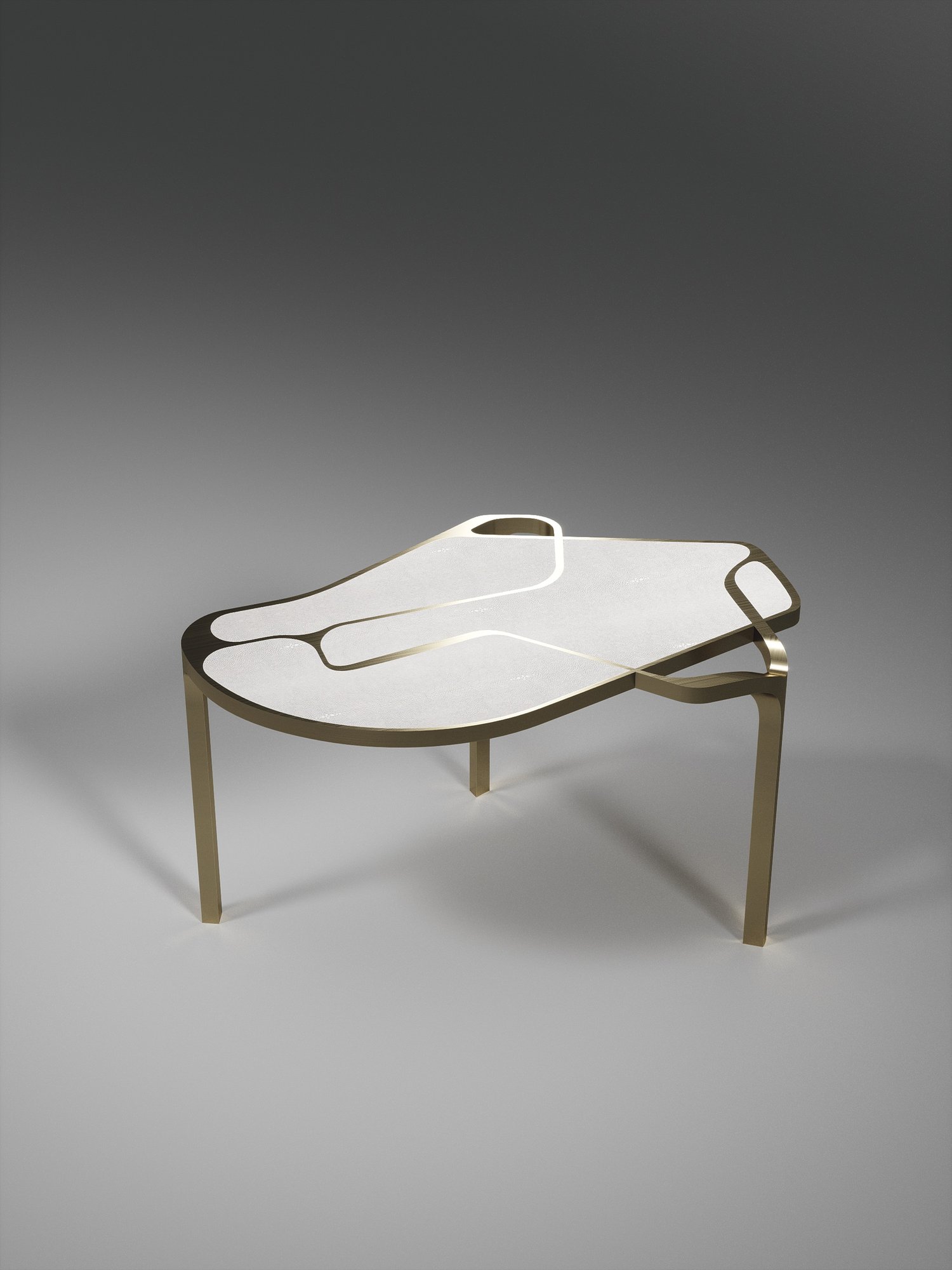 The Cocteau II coffee table by R&Y Augousti is a truly one of a kind piece. The sculptural and ethereal piece has abstract forms, shapes and figures within it that one could interpret in different ways. The bronze-patina brass inserts in the cream shagreen inlaid surface "melt" organically into the floating frame and base to create this overall beautiful amorphous shape. Available in other finishes and shape variations.