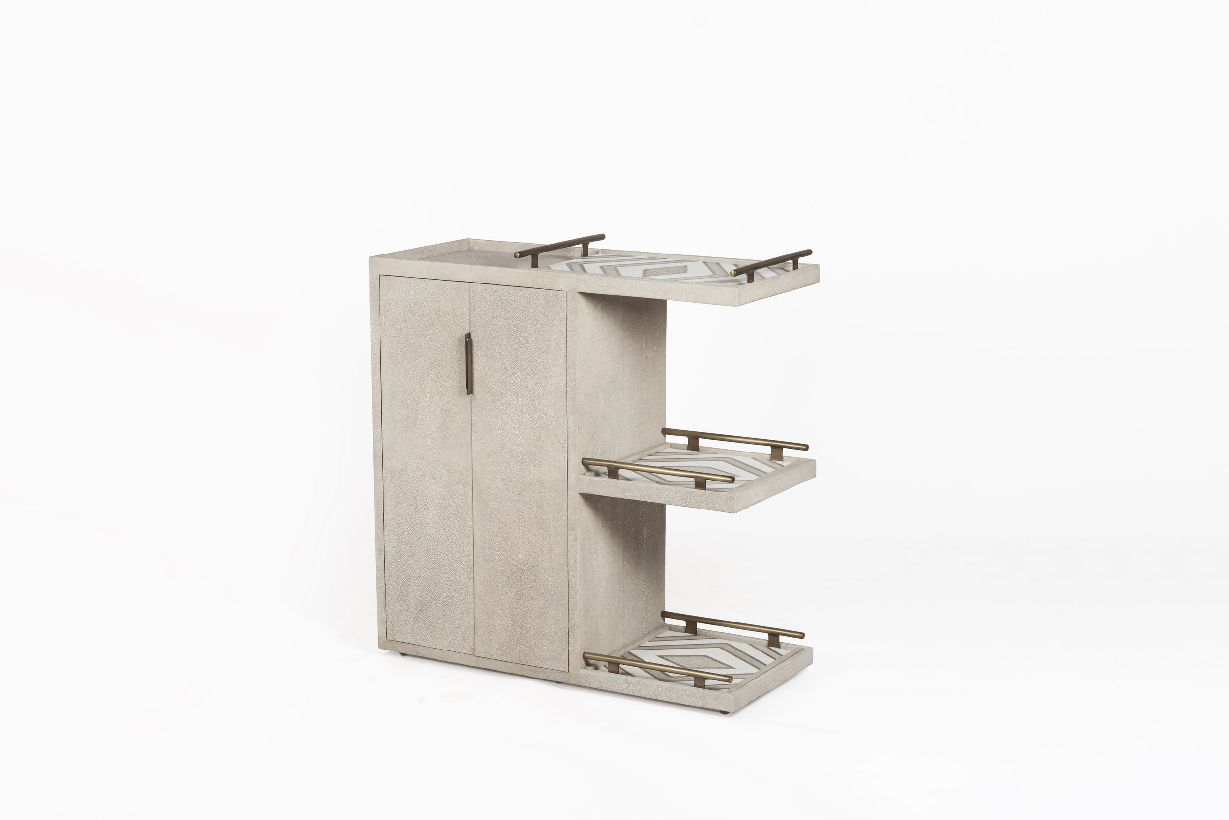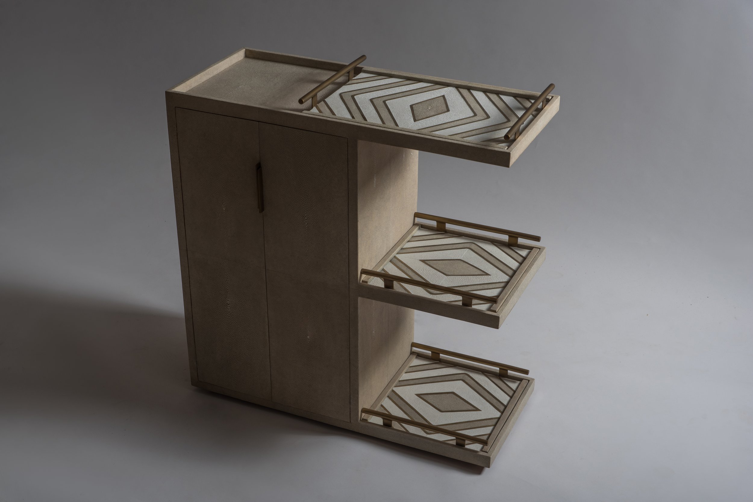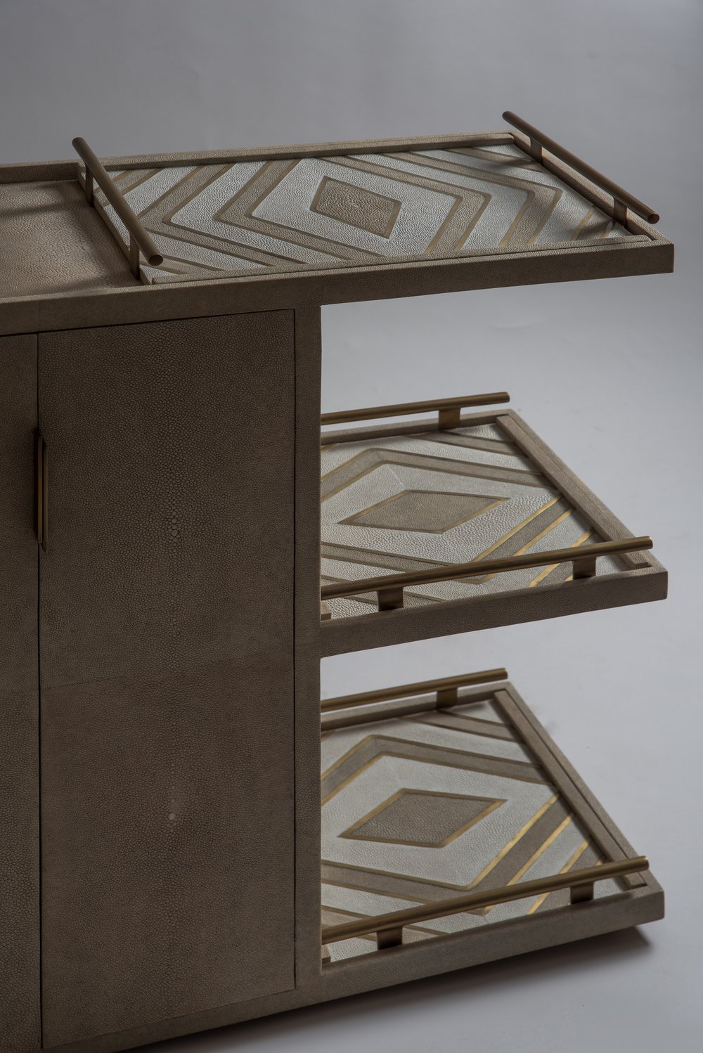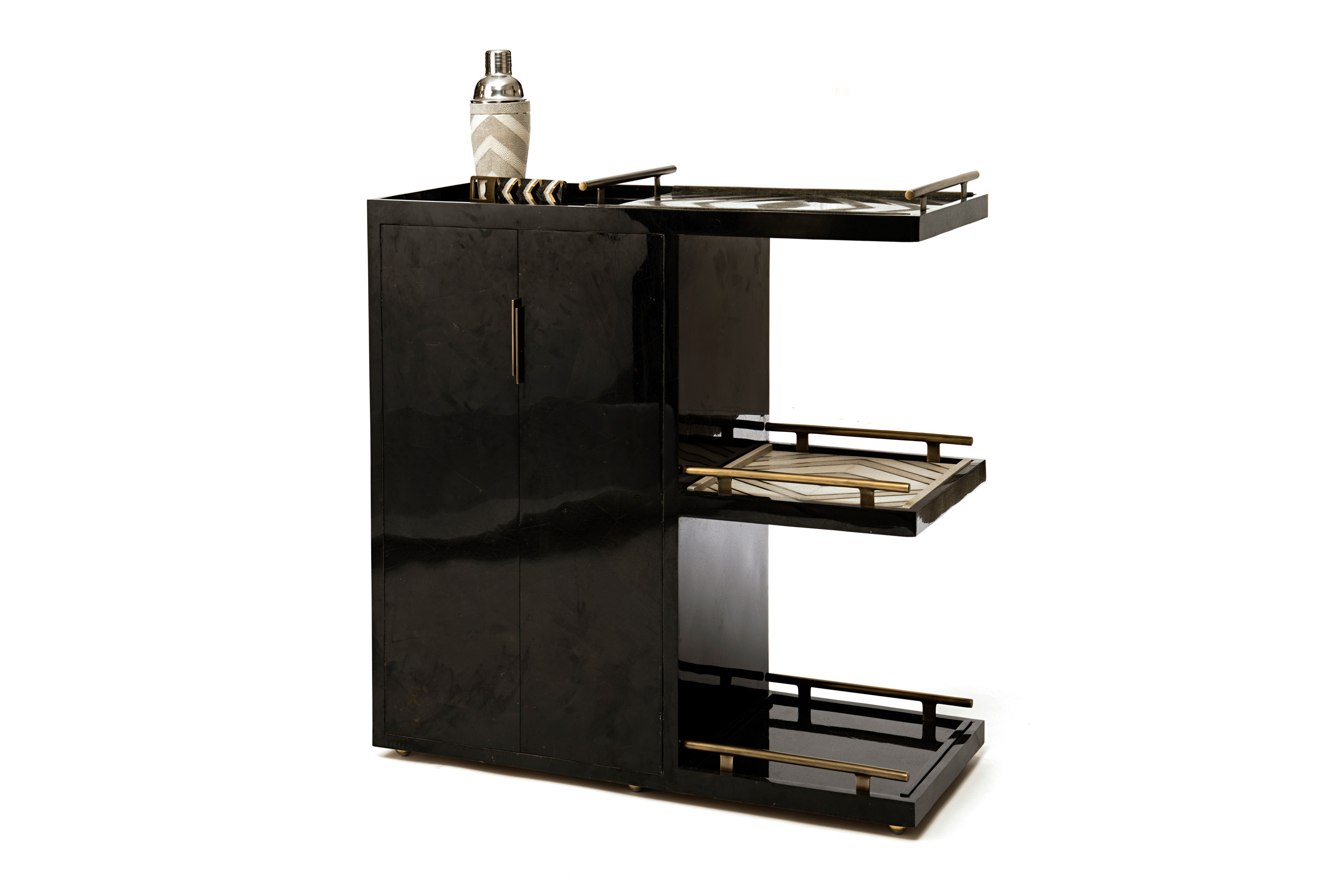The KIFU PARIS Bar Trolley is a luxurious accent piece for any living space. Available in Antique Natural Shagreen or Black Pen Shell, this piece can be easily moved on wheels and comes with three removable trays. The interior includes two drawers and shelving.