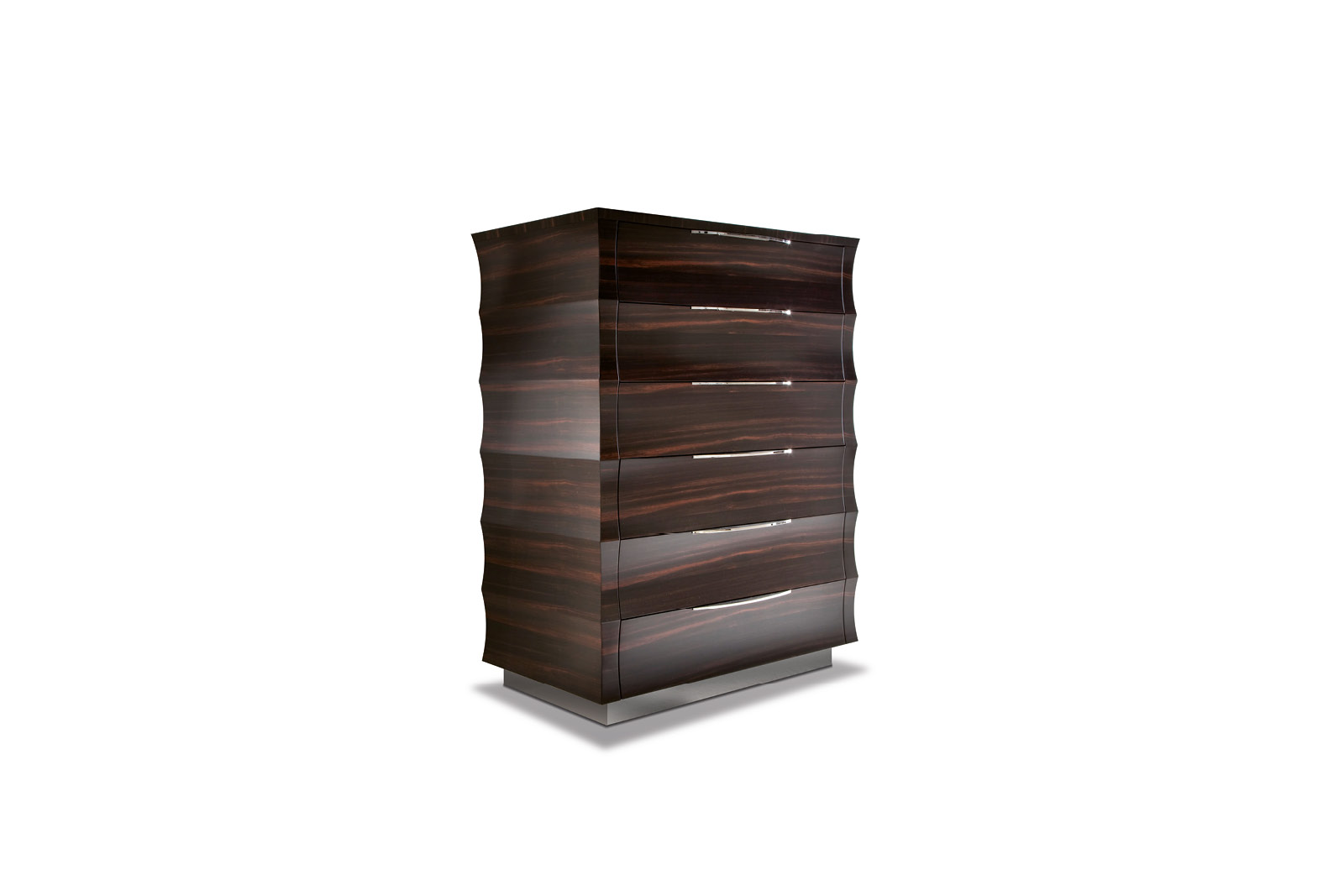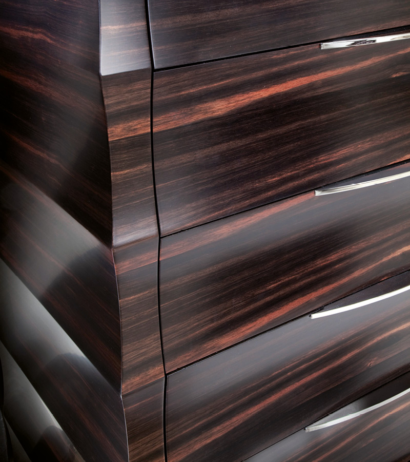 Chest in makassar ebony veneer in satin finish. 6 full extension drawers with 2 top drawers with bottom in velvet fabric. Chrome stainless steel top inlay. Chrome stainless steel handles and details.