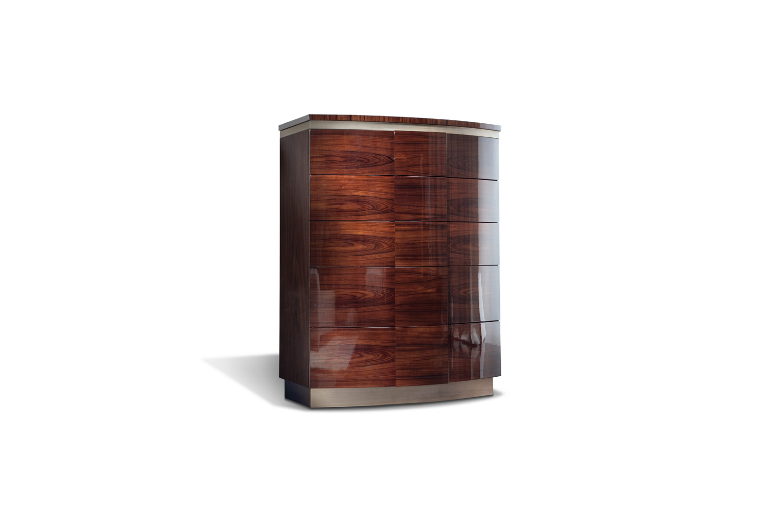 Chest with combination of brazilian rosewood veneer with high gloss polyester finish and bronzed stainless steel details. 5 full extension double drawers with bottom in velvet fabric. Bronzed stainless steel base.