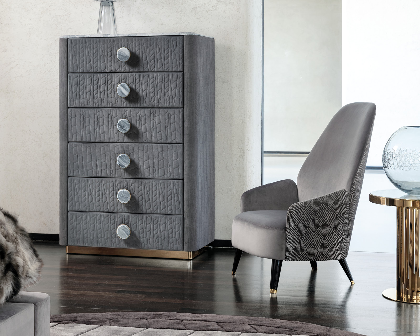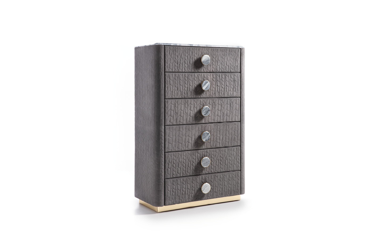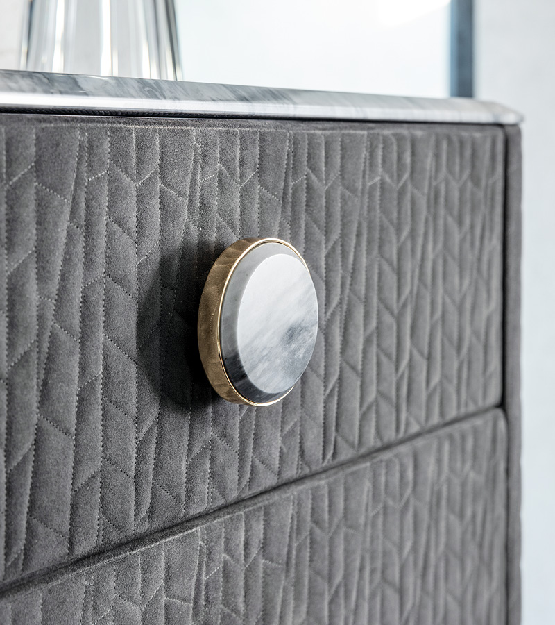 Chest in quilted grey nubuk color nr 6 with top in beveled marble. Base in light gold chrome stainless steel. 6 big center handles in combination with gold chrome stainless steel and beveled marble. 6 full extension drawers with bottom part in velvet fabric