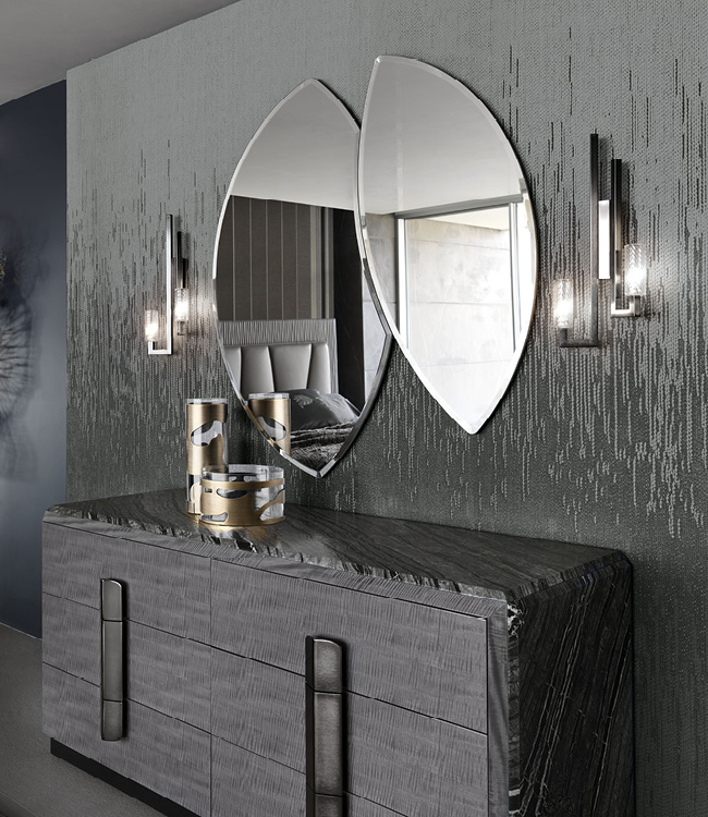 Dresser in Madagascar figured Mowinghi veneer in high gloss polyester finish. Top and sides in Kenya Black marble. Base and handles in satin black nickel stainless steel. 6 full extension drawers with bottom part in velvet fabric.