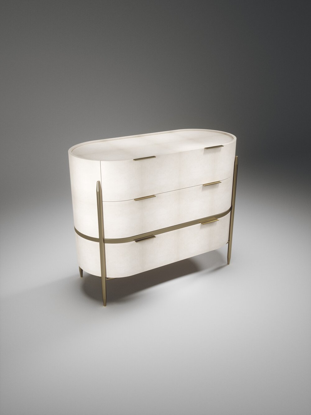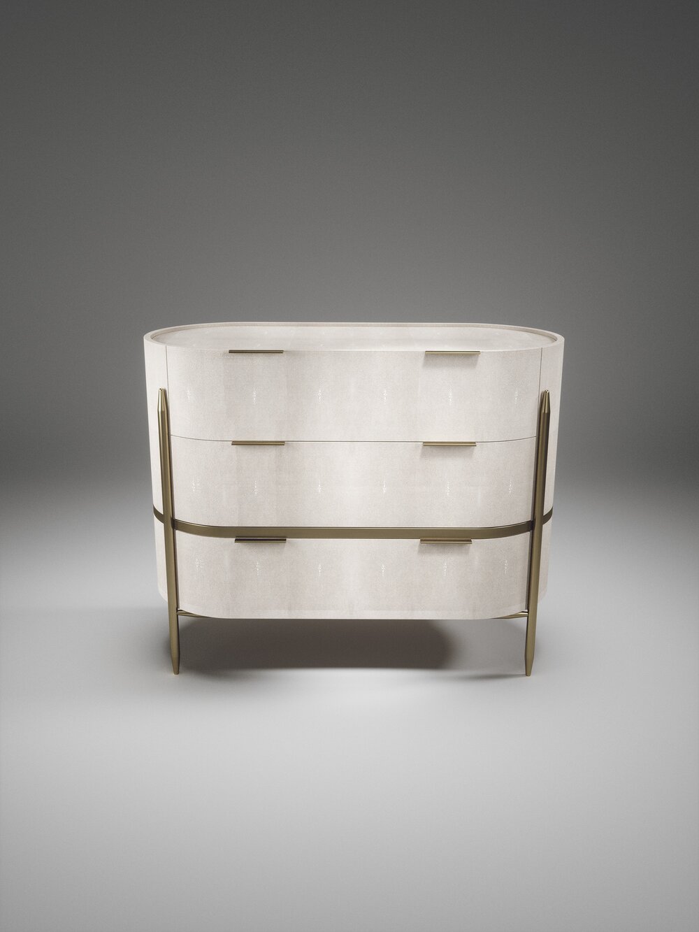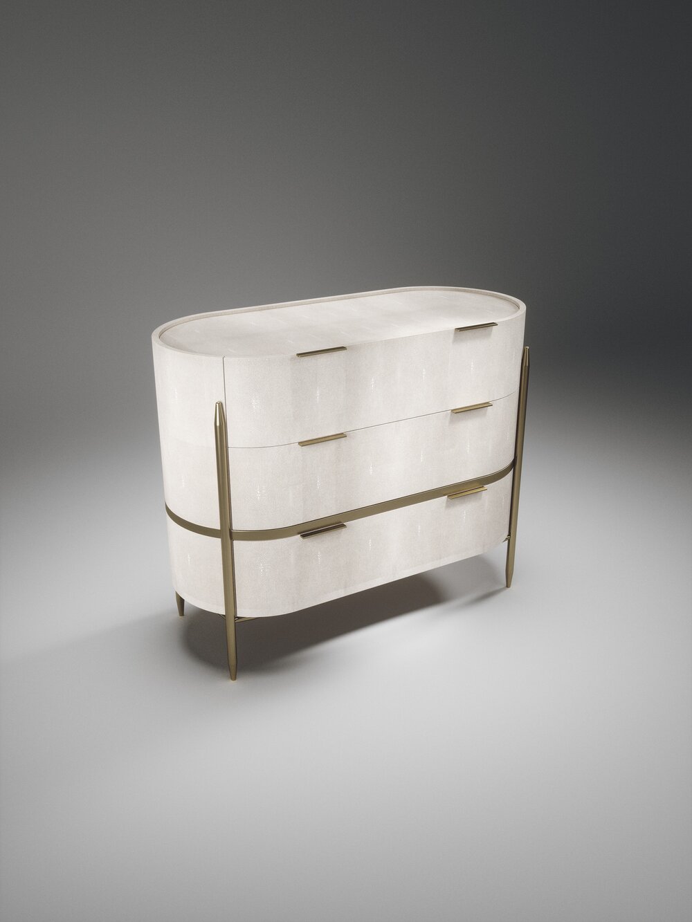The Dandy oval chest of drawers by Kifu Paris is an elegant and a luxurious home accent, inlaid in cream shagreen with bronze-patina brass details. This piece includes 3 drawers total and the interiors are inlaid in gemelina wood veneer. Available in light grey shagreen and parchment and as a rectangle version and as a bedside table. This piece is designed by Kifu Augousti, the daughter of Ria and Yiouri Augousti.