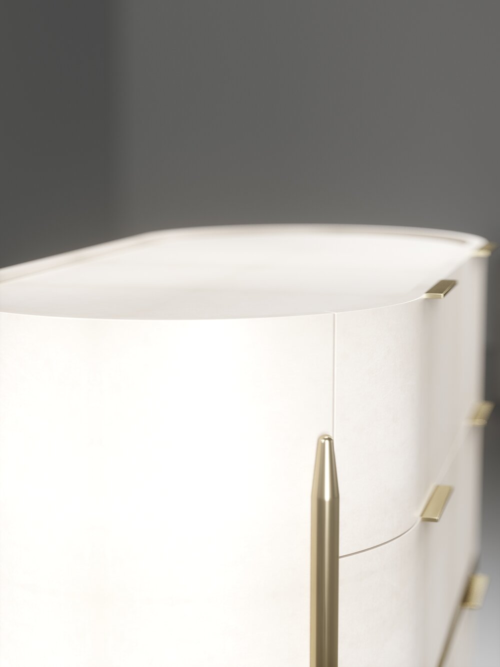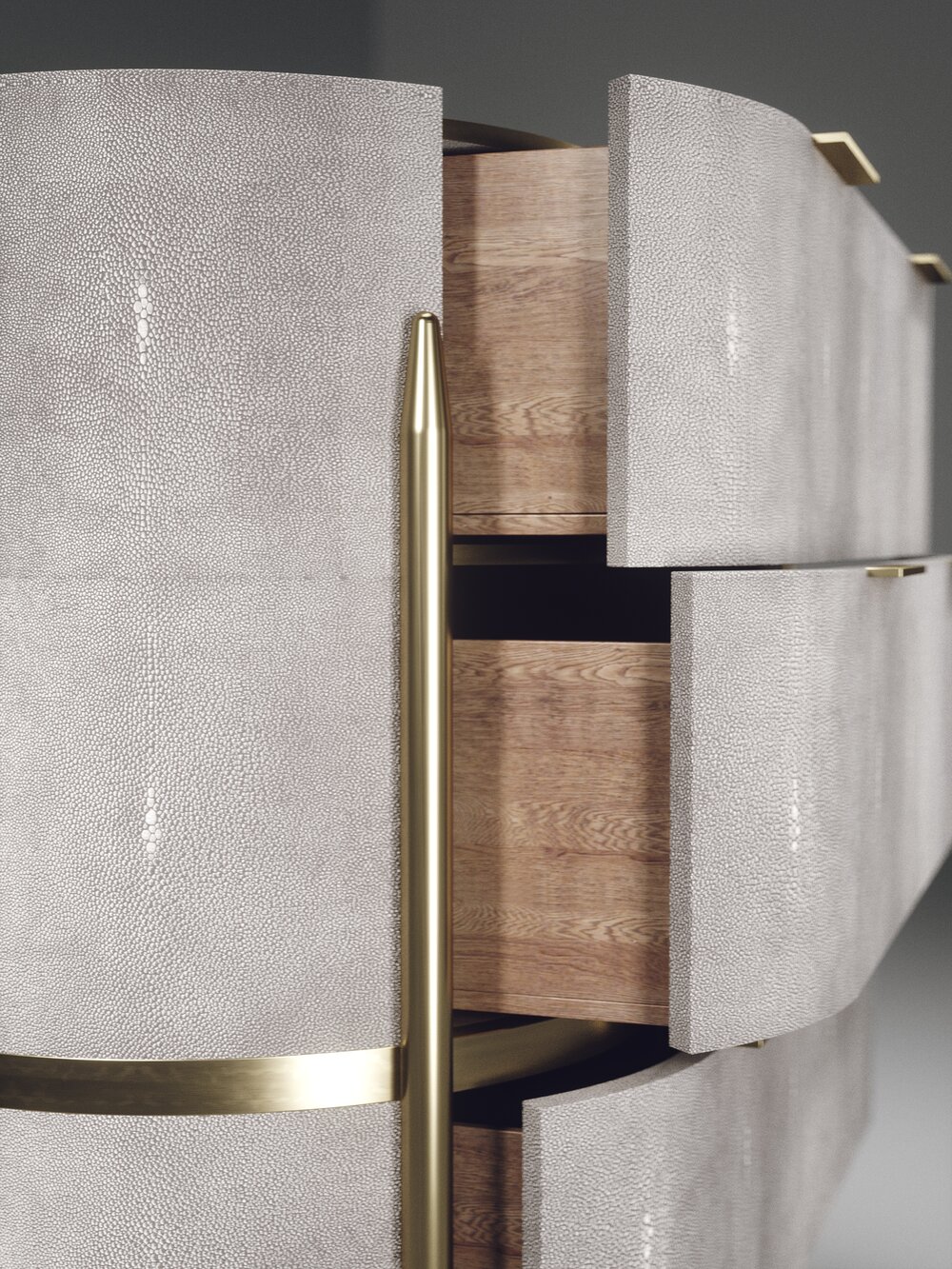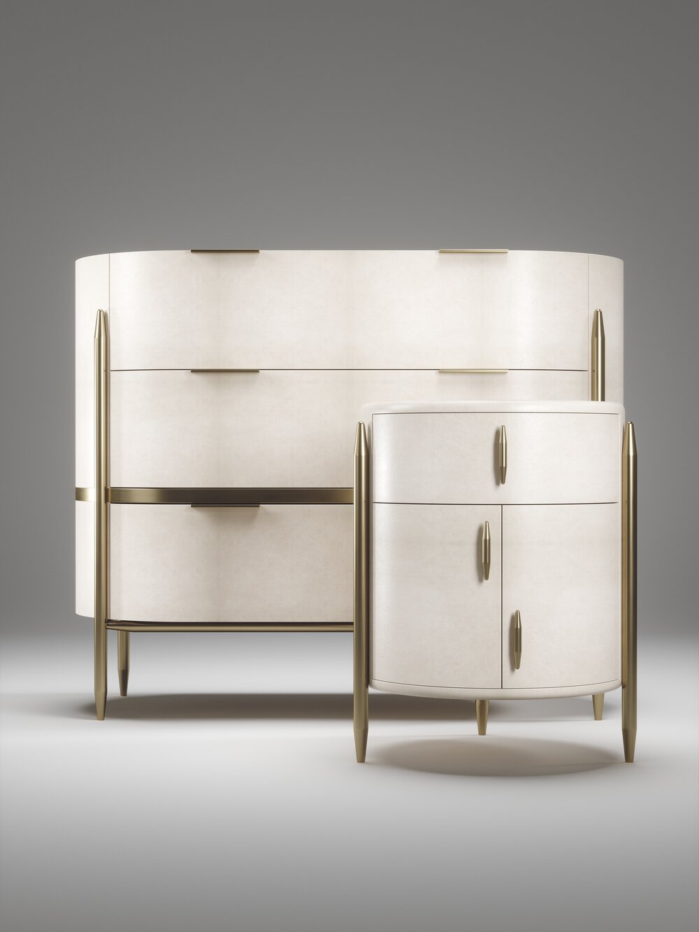 The Dandy oval chest of drawers by Kifu Paris is an elegant and a luxurious home accent, inlaid in cream shagreen with bronze-patina brass details. This piece includes 3 drawers total and the interiors are inlaid in gemelina wood veneer. Available in light grey shagreen and parchment and as a rectangle version and as a bedside table. This piece is designed by Kifu Augousti, the daughter of Ria and Yiouri Augousti.