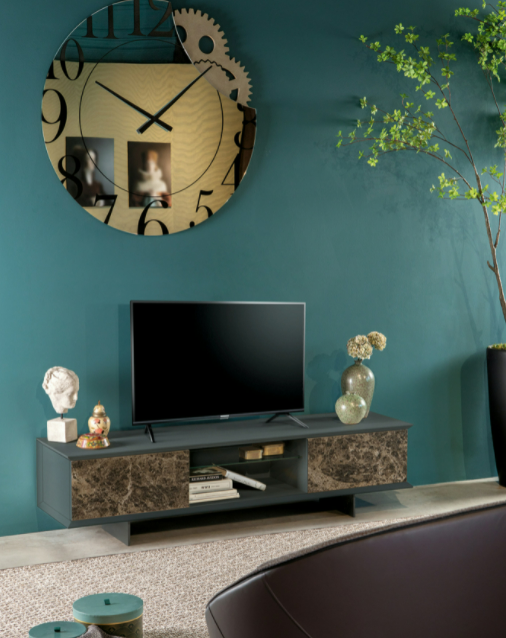 Le linee definite e il design plurimaterico del porta-tv Teo invitano a trovare nuovi spazi grazie al ripiano centrale e alle due ante laterali con finitura porcellanato o in essenza.