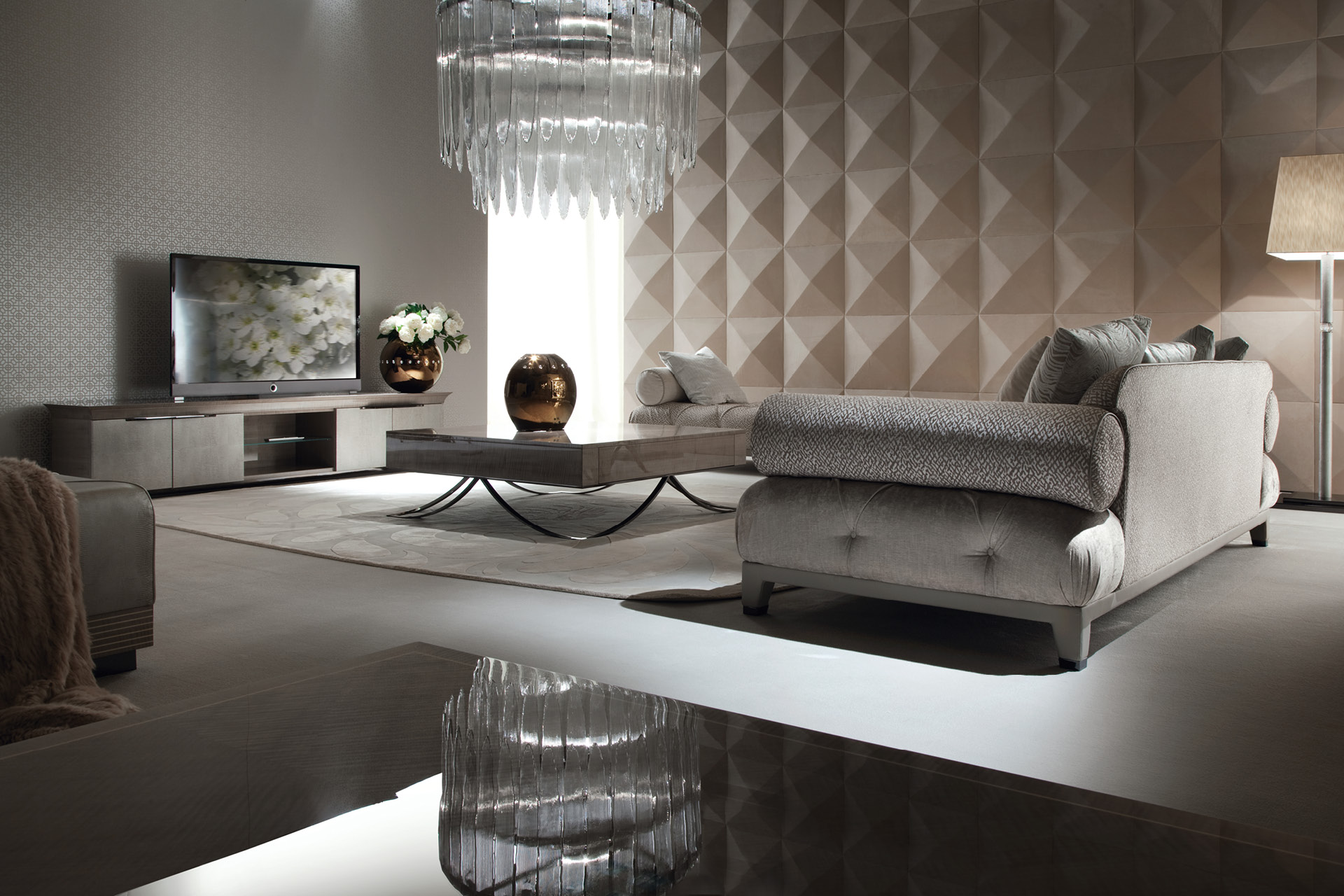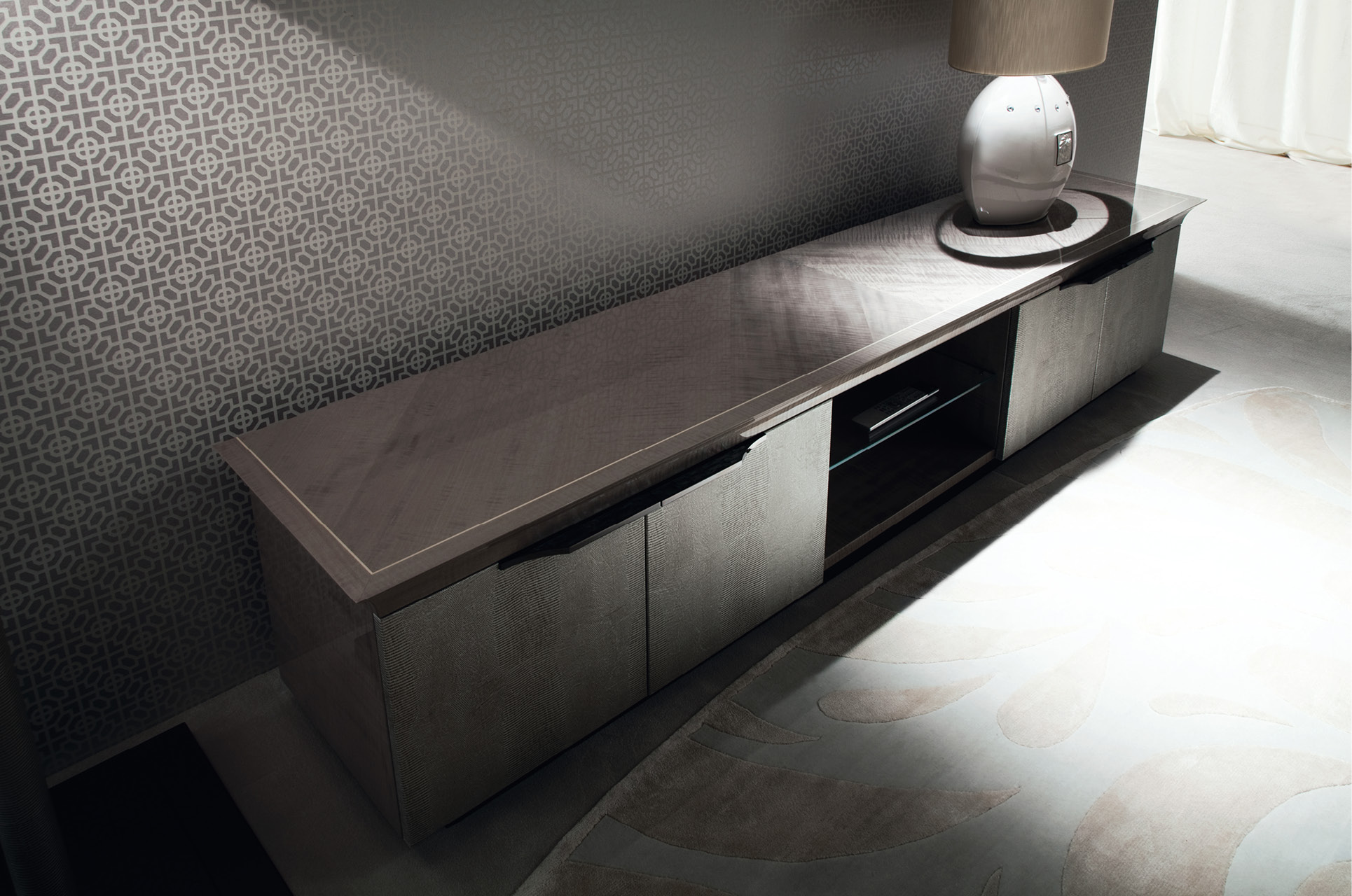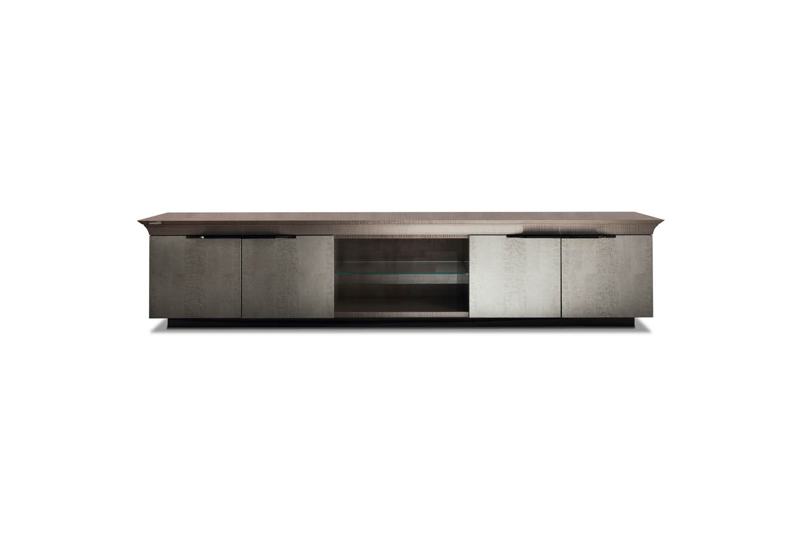 Base for plasma T.V. unit in tiger African sycomore veneer with high gloss polyester finish. 4 doors in silver lizard printed leather and 1 open space. 1 center glass shelf and 2 lateral glass shelves. Base and handles in stainless steel in storm dark grey finish.