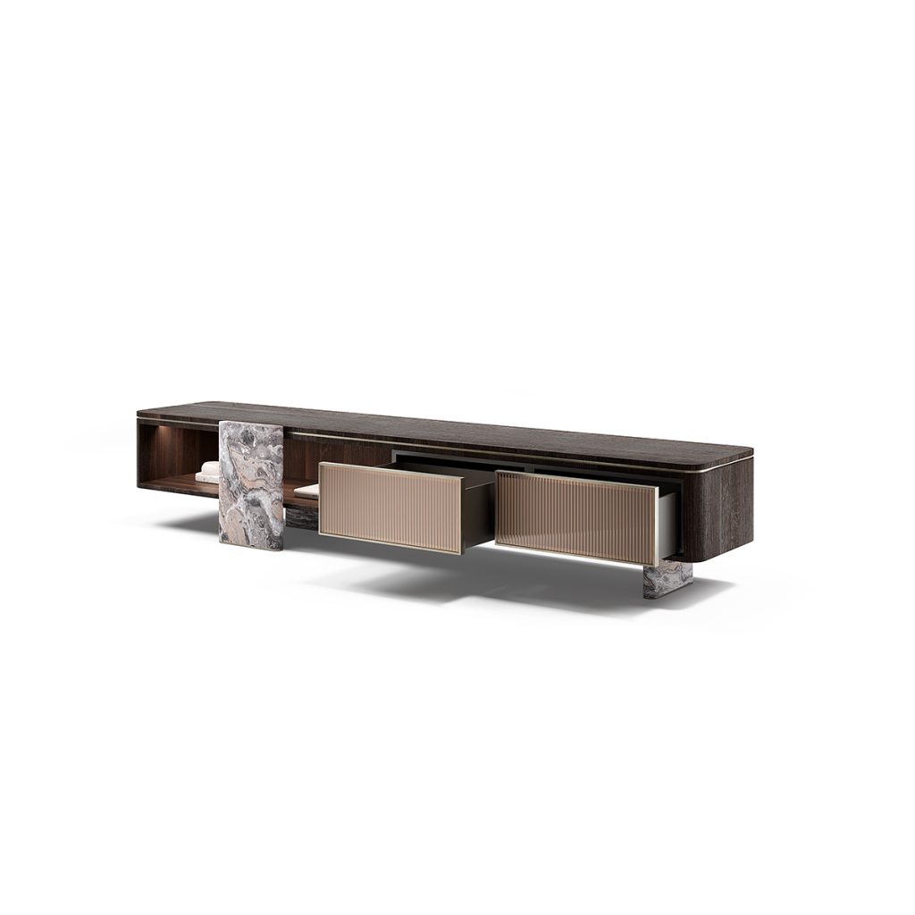 Structure in essence or lacquered. Vertical element and base in marble. 2 drawers with bronzed glass front. Details in metallic finish
