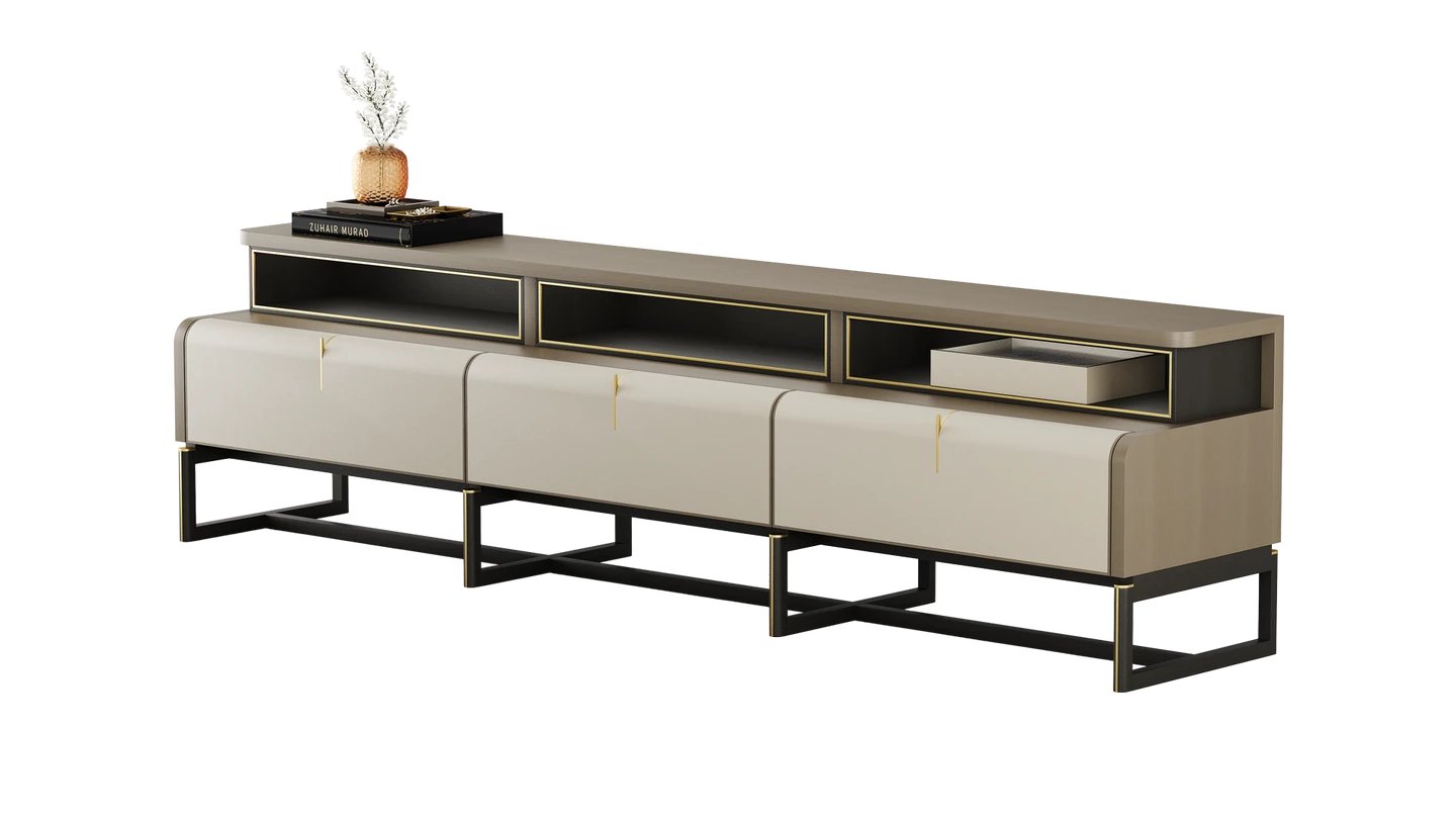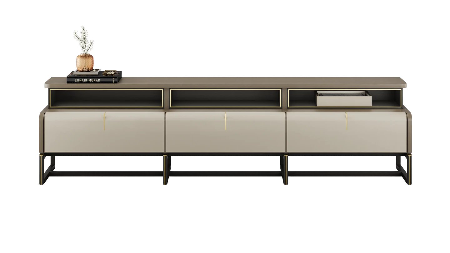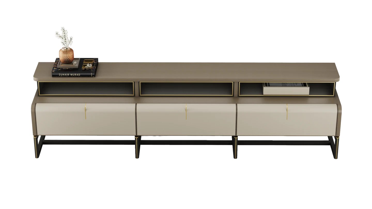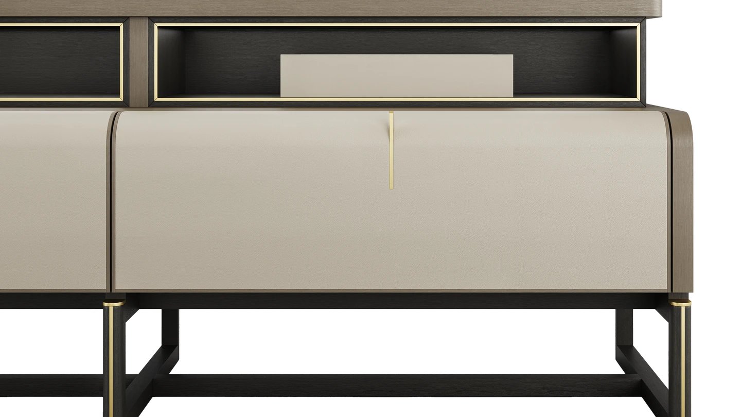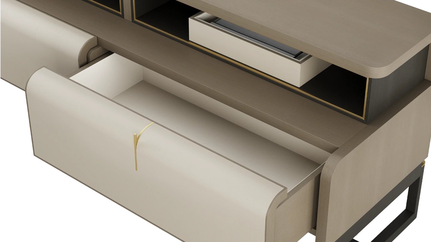 Our ARLES TV Unit features a gently curved top, making it a feature piece for your lounge. It combines premium details from the satin open-pore wood veneer to the leather and suede inlays in the drawers.