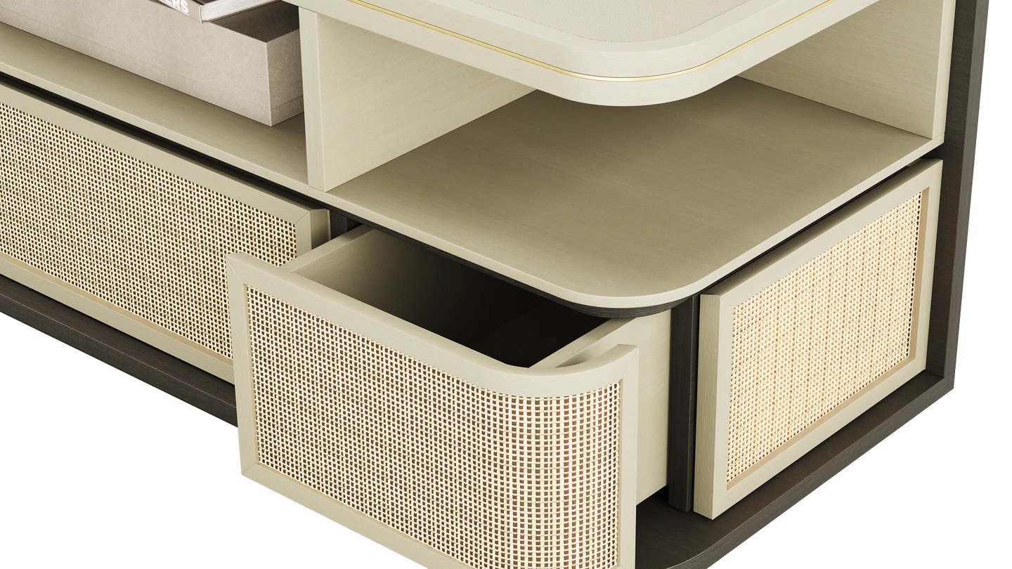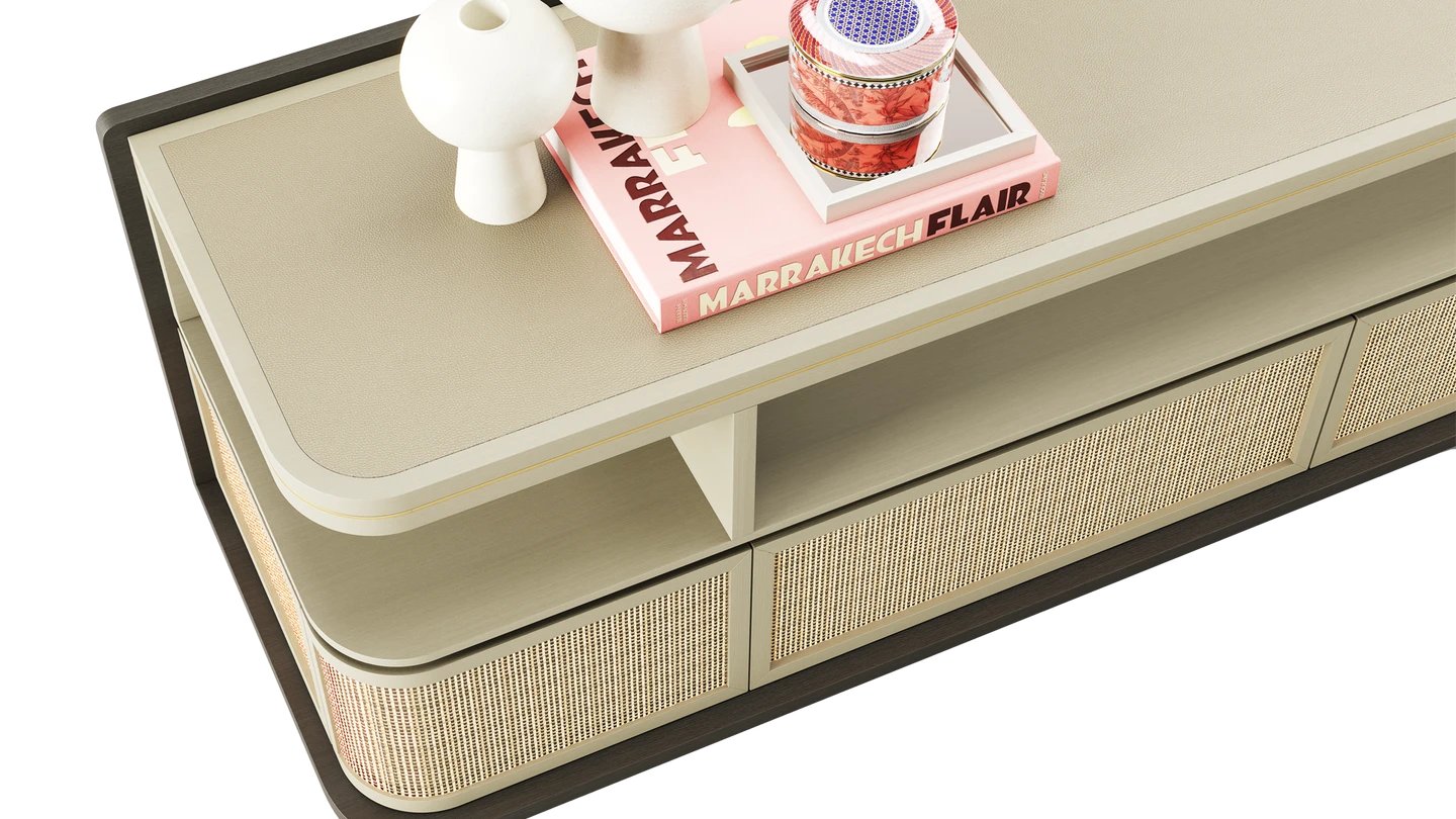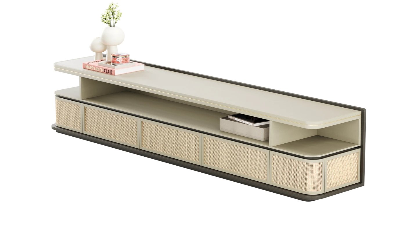 "The NAVALA TV Unit combines satin open pore wood with rattan inlays to bring a natural touch to your lounge. It combines shelves and drawer space to be as practical as it is beautiful. "