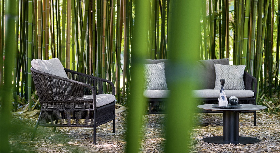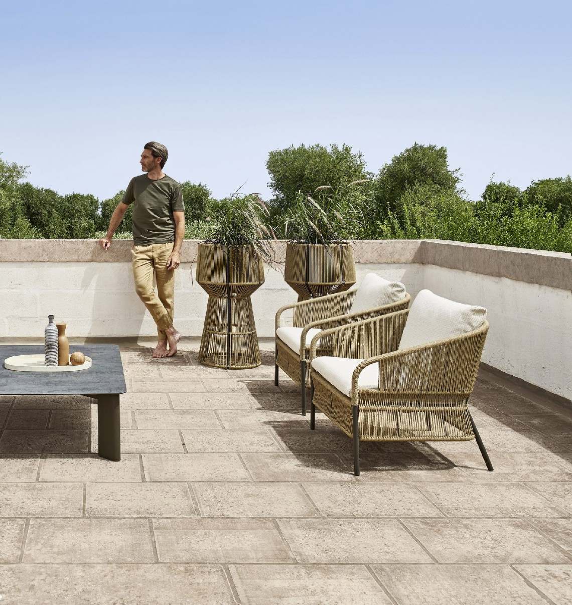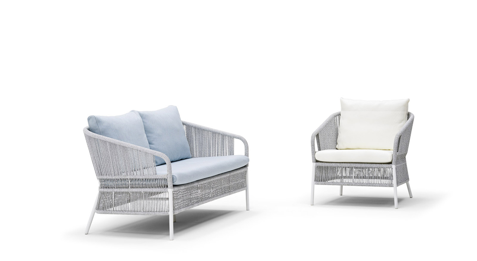 A spacious cushion on the seat and a softer one on the back make this armchair inviting, chosen by many architects and designers to furnish domestic and contract outdoor environments.