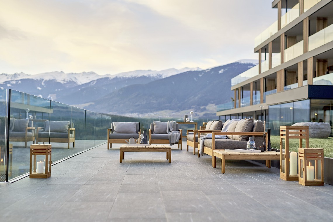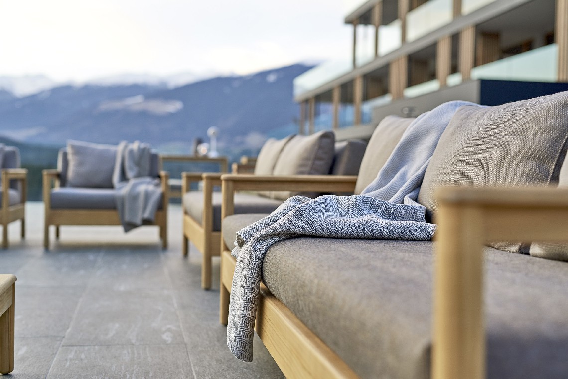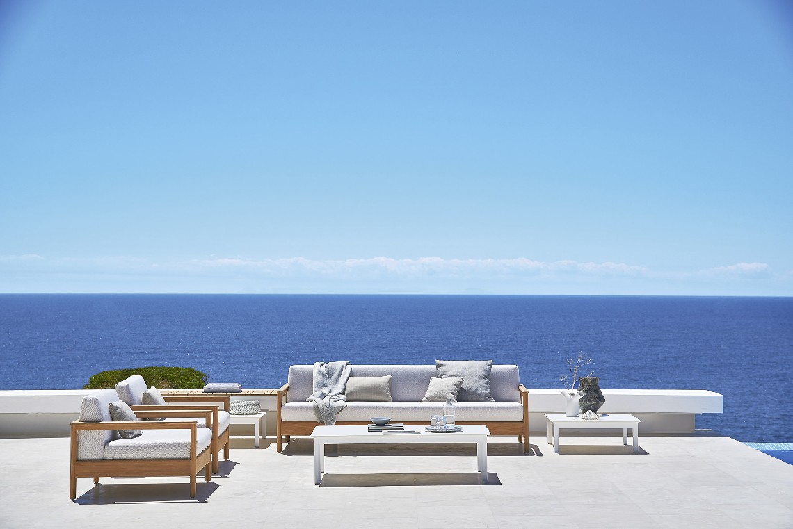 A structure with clean and regular lines in solid teak wood combines with large and soft cushions to give shape to a spacious and comfortable seat, which invites you to immerse yourself in relaxation.