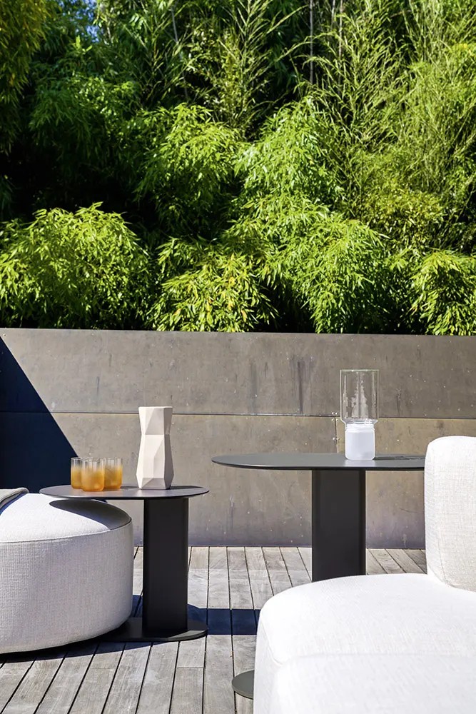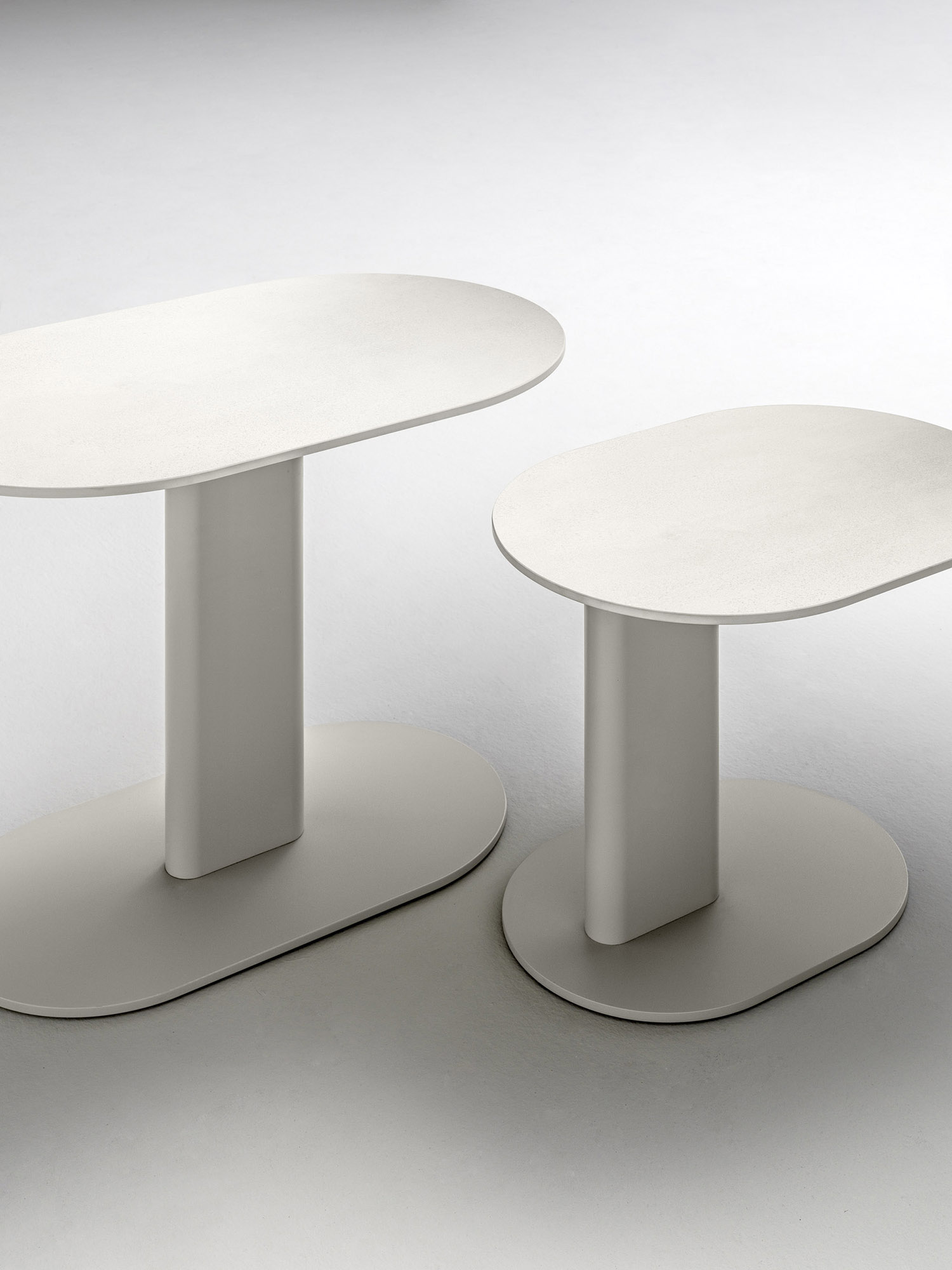 The Plinto coffee table offers a convenient support for placing small items that you may need when spending time outdoors. The stem with the elliptical section of the base that identifies the entire collection also characterizes this version designed for the living area. The top and base are also elliptical in shape, an aesthetic choice that gives harmony to the design of this furniture.