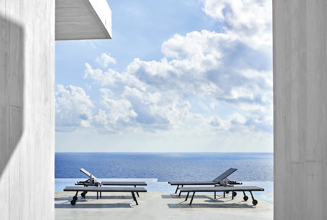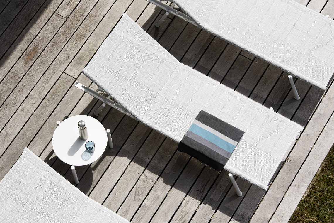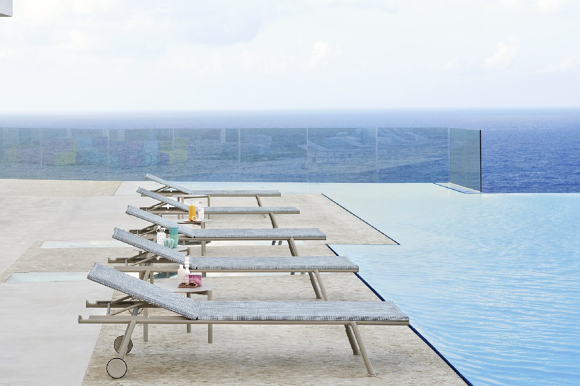 Bahia is a light and handy sunbed, perfect for the beach or swimming pool. Its essential design is embellished with small details that soften the rigorous lines of the structure, such as the circular section of the legs which is revealed on the side of the seat. The version with wheels and cushion allows greater ease of movement for these sunbeds which, when not in use, can be stacked in groups of ten and stored.