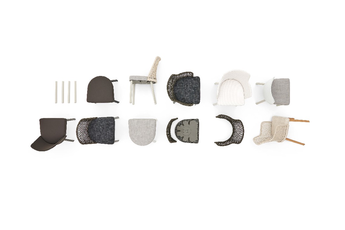 When an unmistakable design meets versatility, products like Emma are born, a handy and resistant outdoor chair, ideal for decorating large terraces and dining rooms in restaurants and hotels. The seat shell in plastic material is designed to allow water drainage. Different types of backrest can be mounted on it, with synthetic fiber weaving, in texture or in fabric, and with legs, in aluminum or iroko wood. Each finish tells a different nuance of Emma’s personality, making it enter into harmonious dialogue with any type of environment.
