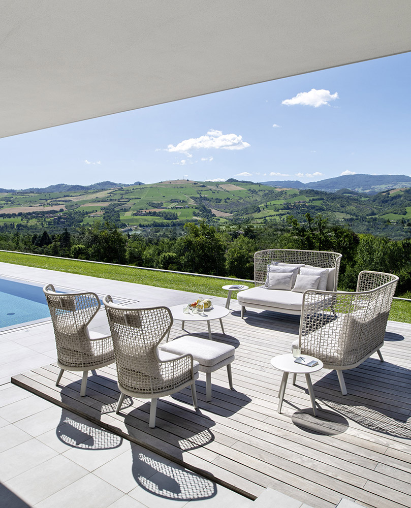 The particular weaving that characterizes the entire Emma collection finds its highest expression in the high backrest of this daybed and an unprecedented cocooning effect. With its soft and curvilinear design, it fits perfectly into any outdoor context, both residential and contract, becoming the protagonist.