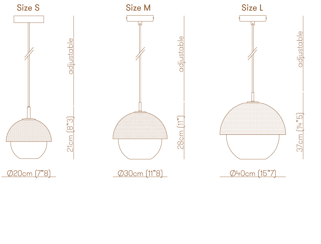Suspended lamp with diffused light. Light or dark burnished brass structure with matte gold or matte black perforated metal lampshade. White Murano blown glass diffuser.