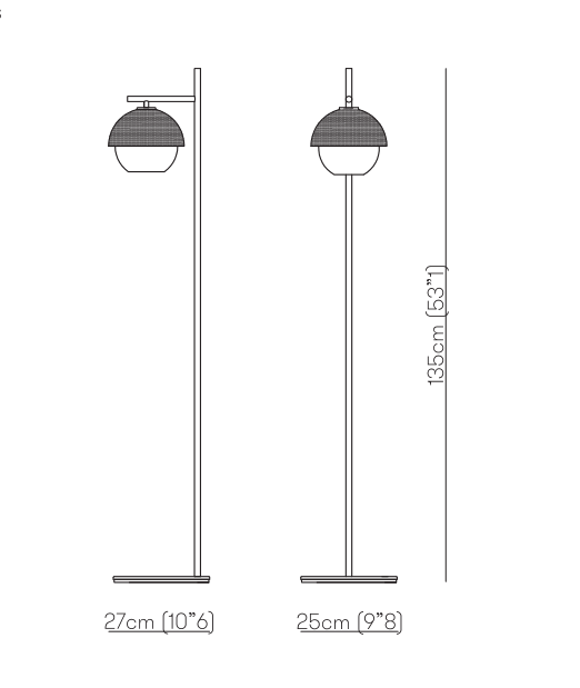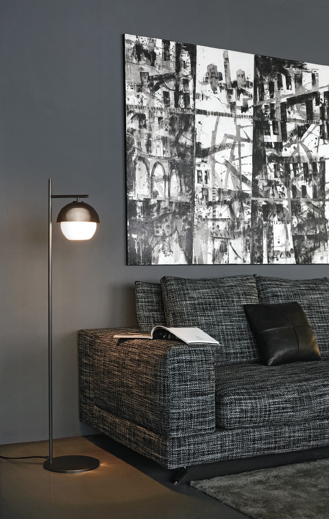 Floor lamp with diffused light. Light or dark burnished brass structure with matte gold or matte black perforated metal lampshade. White Murano blown glass diffuser.
