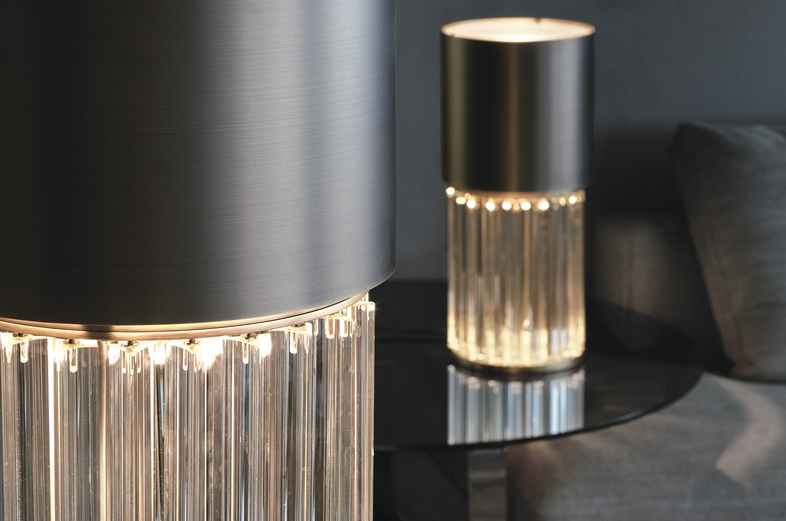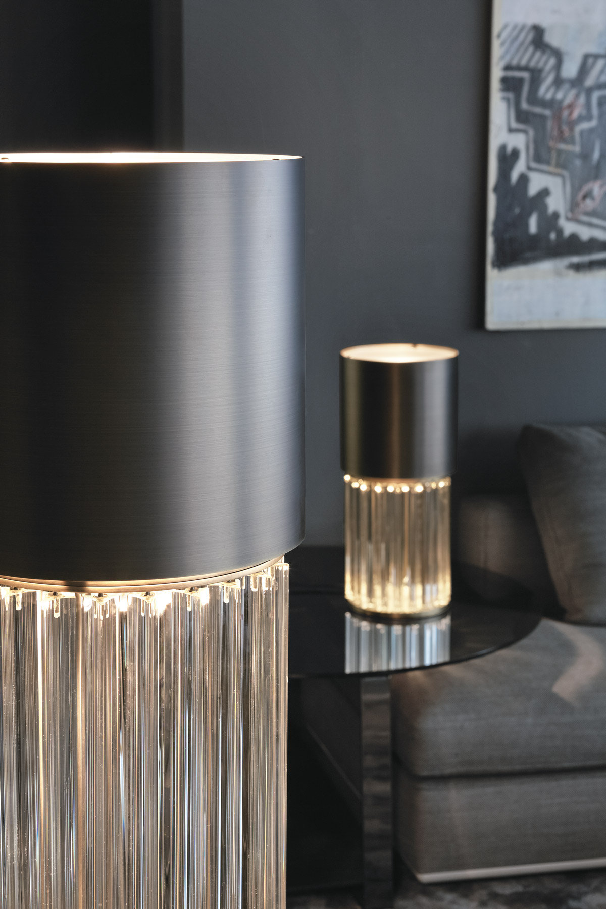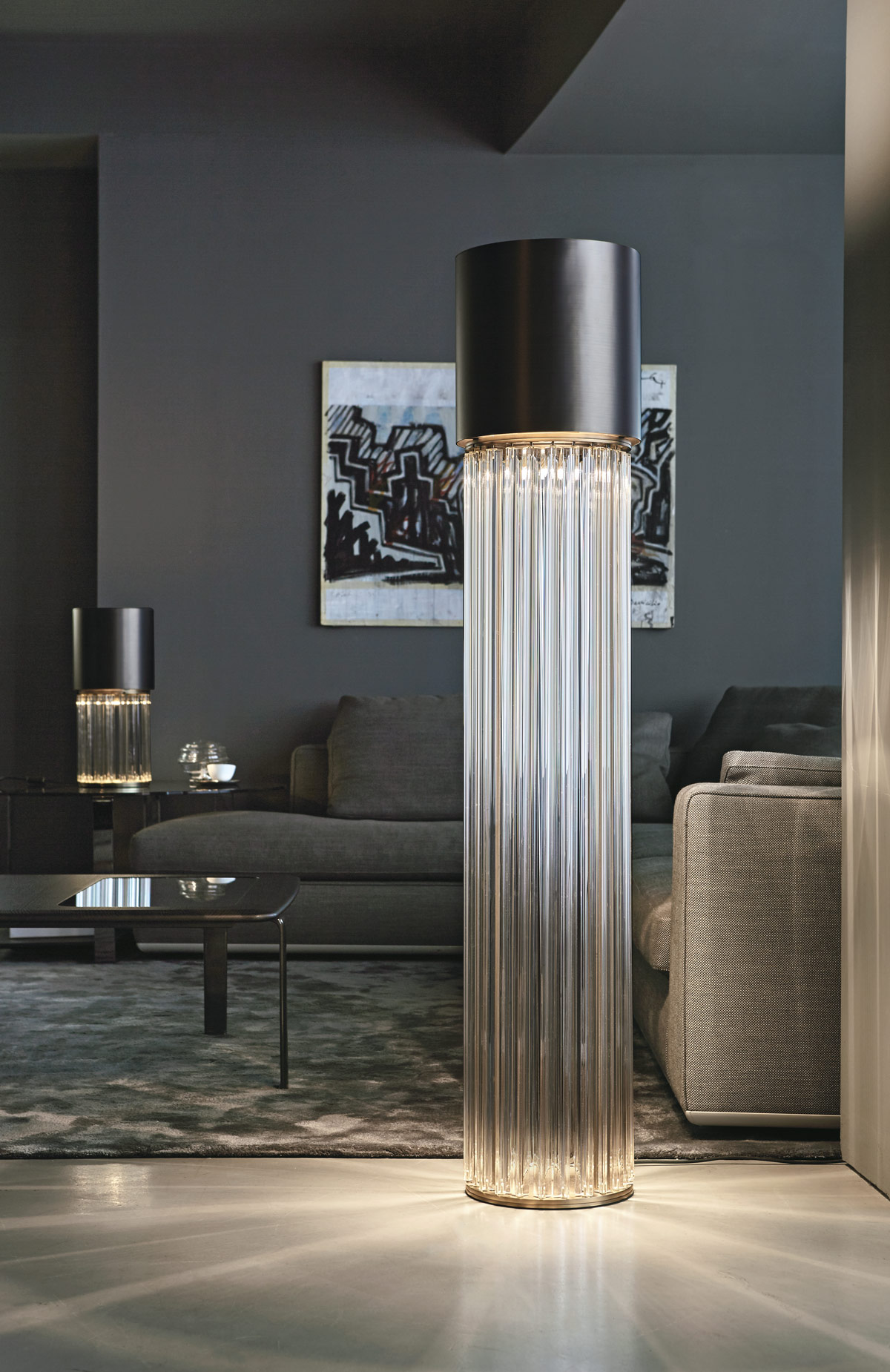 Floor lamp with diffused light. Dark bronze striped structure and crystal, amber or smoke grey Murano blown glass trihedrons.