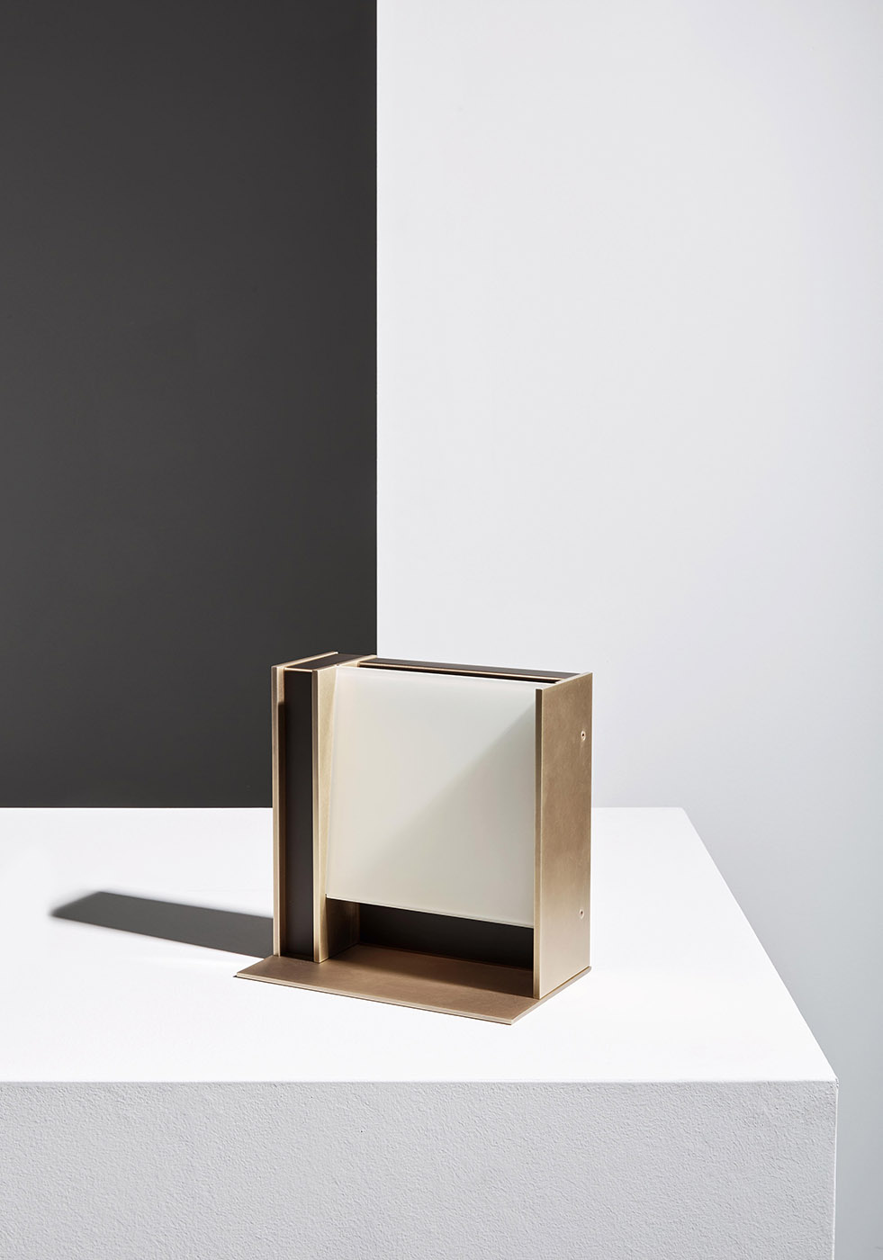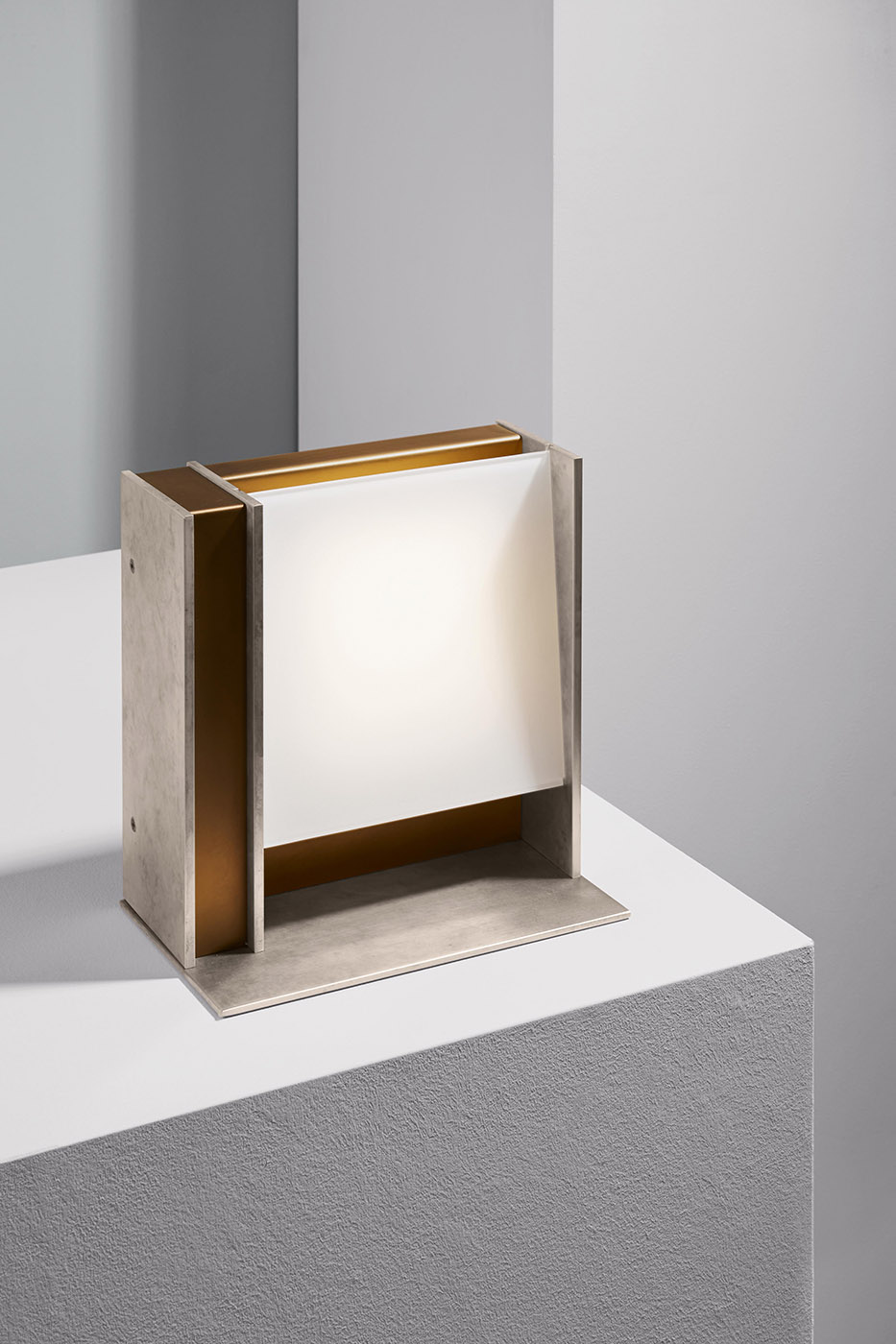 Table lamp with diffused light. Structure in pewter finish and delabré brass or burnished natural brass and dark burnished brass finish. White glass diffuser.