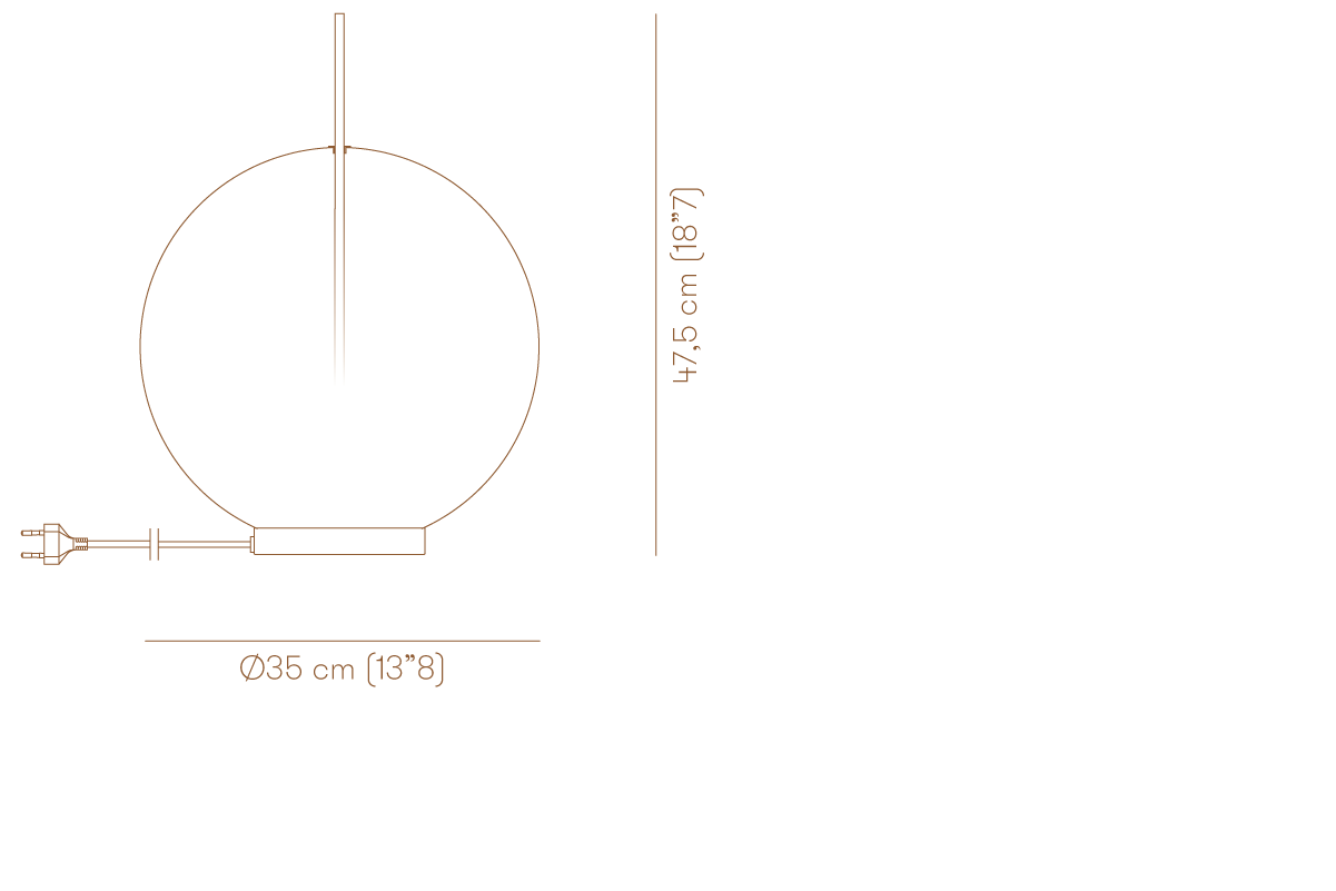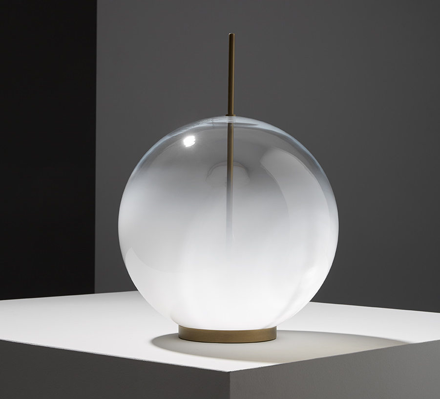 Table lamp with diffused light. Natural burnished brass structure and white blending blown glass diffuser.