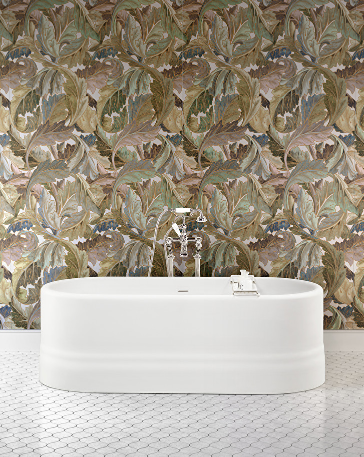 A collection of large ceramic slabs with an extraordinary visual effect, characterized by a surprising synthesis of aesthetic refinement and practicality. The two motifs are classic: the original revisitation of acanthus and the Art Deco stylisation of peacock feathers, having refined golden patterns made with pure gold.