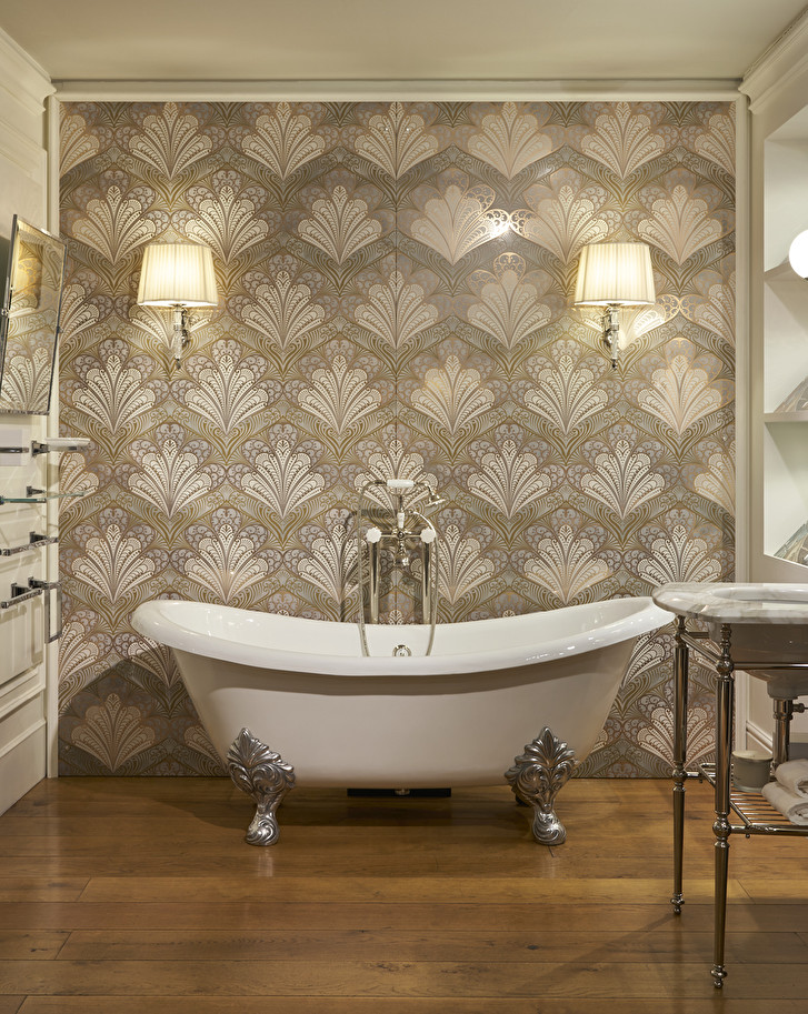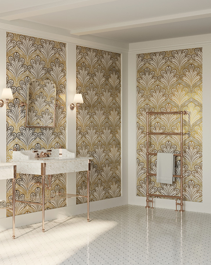 A collection of large ceramic slabs with an extraordinary visual effect, characterized by a surprising synthesis of aesthetic refinement and practicality. The two motifs are classic: the original revisitation of acanthus and the Art Deco stylisation of peacock feathers, having refined golden patterns made with pure gold.