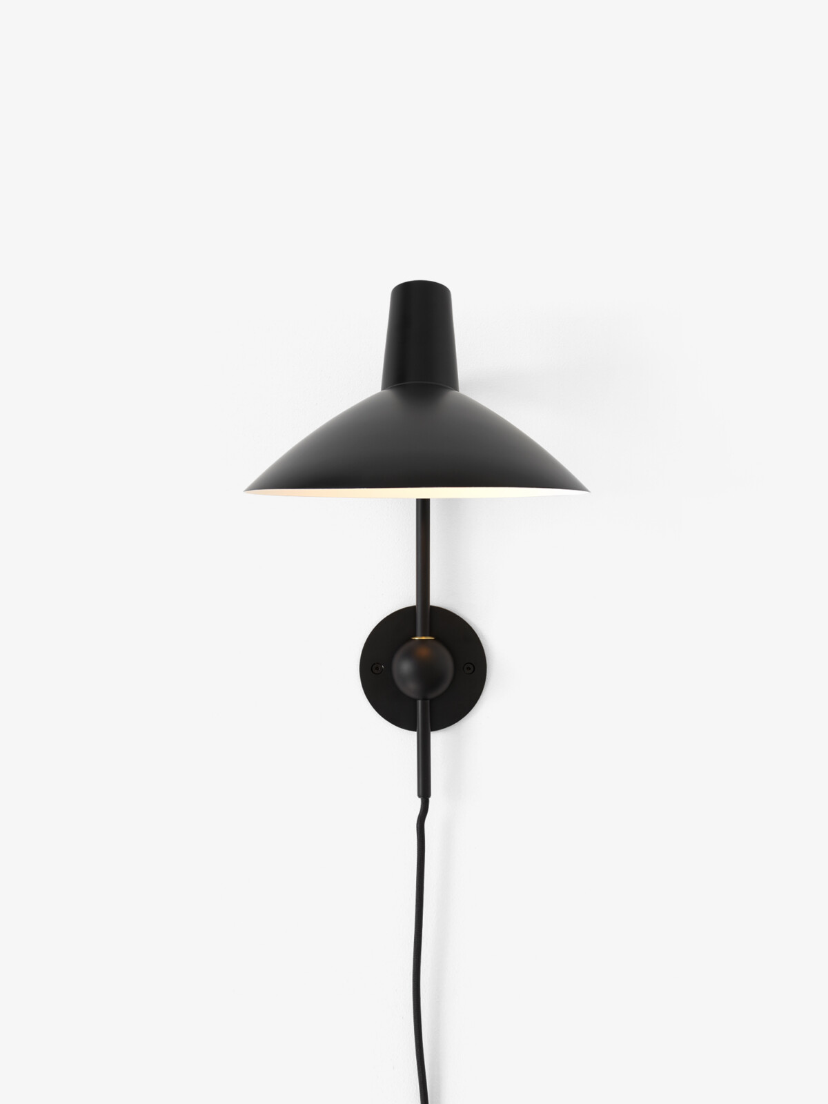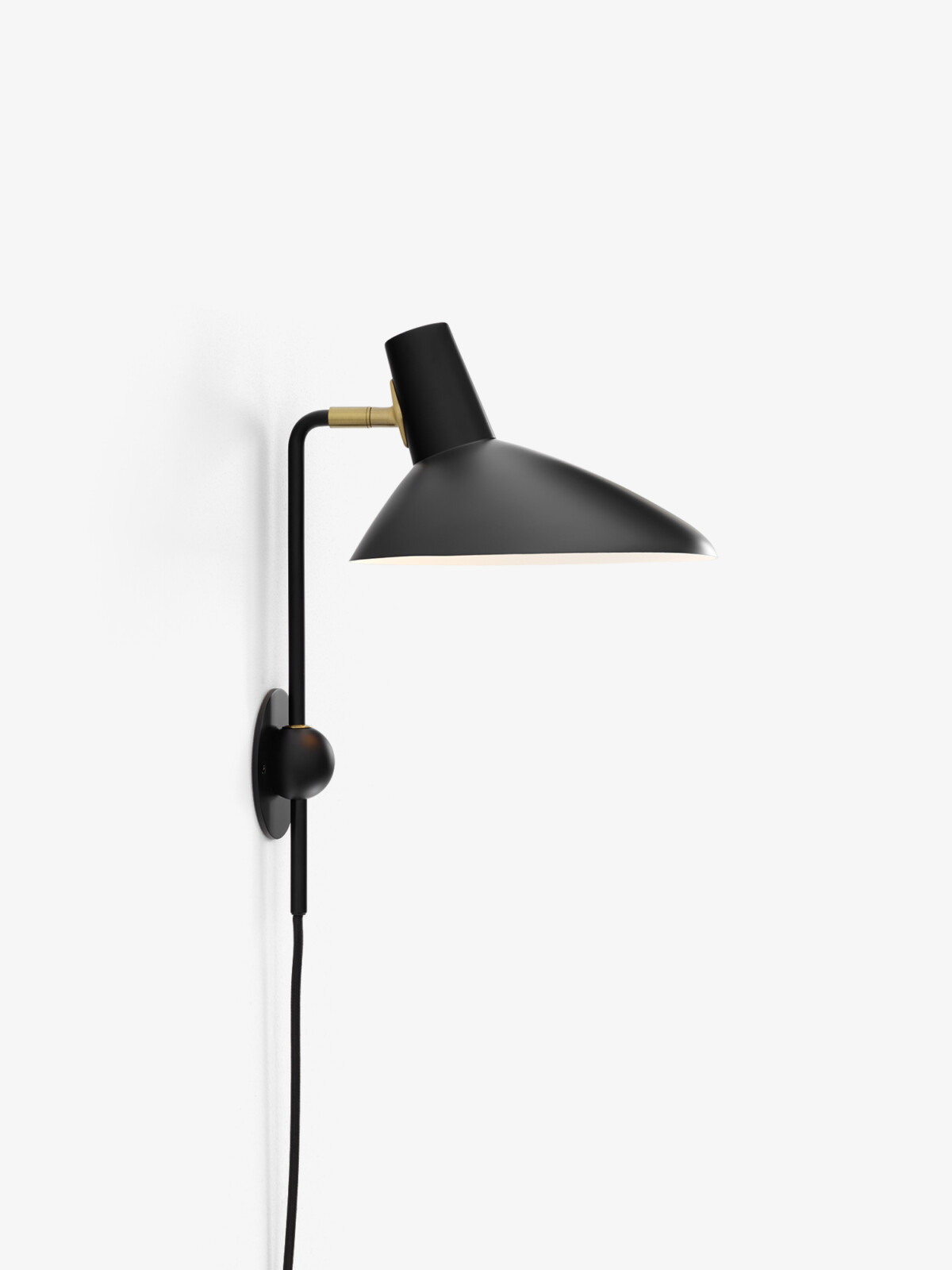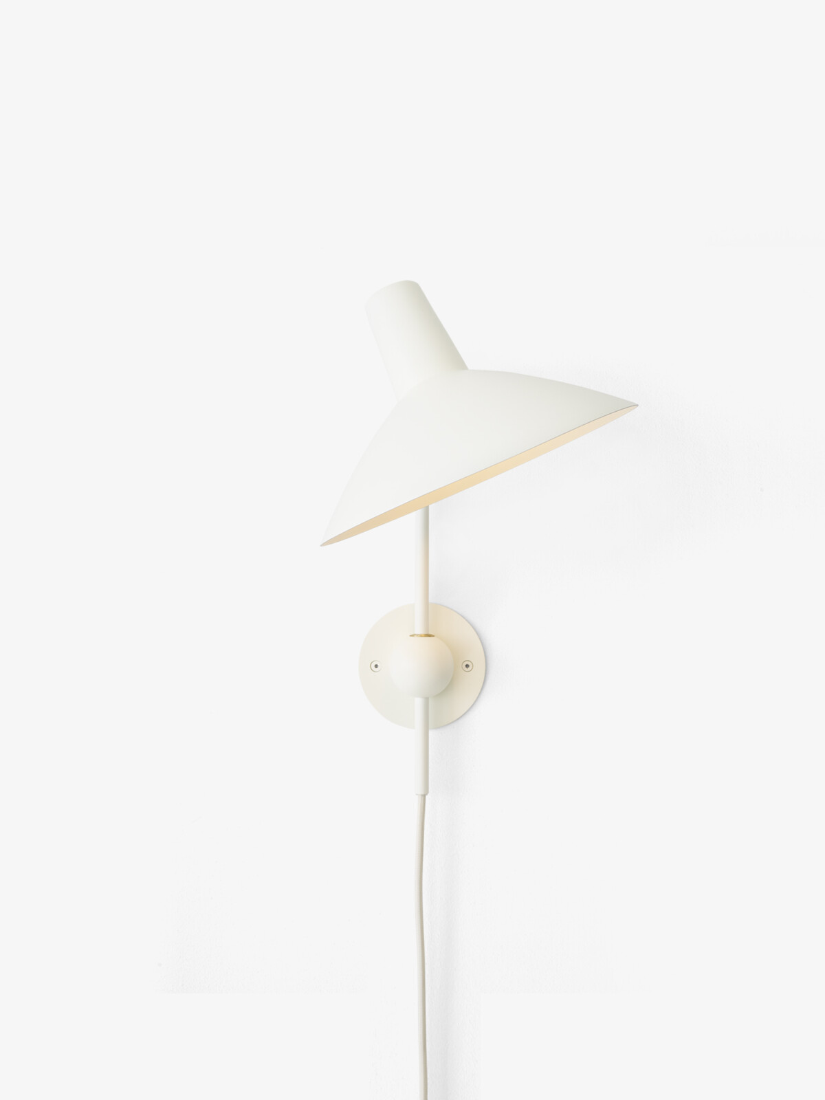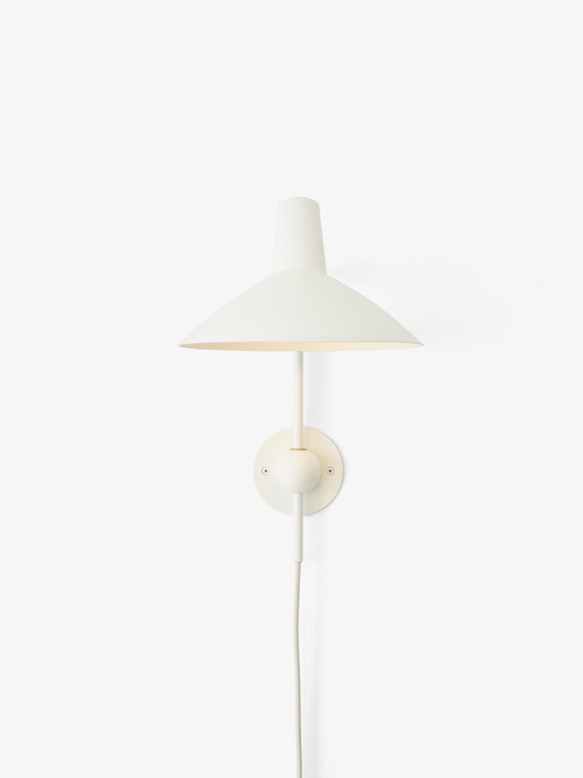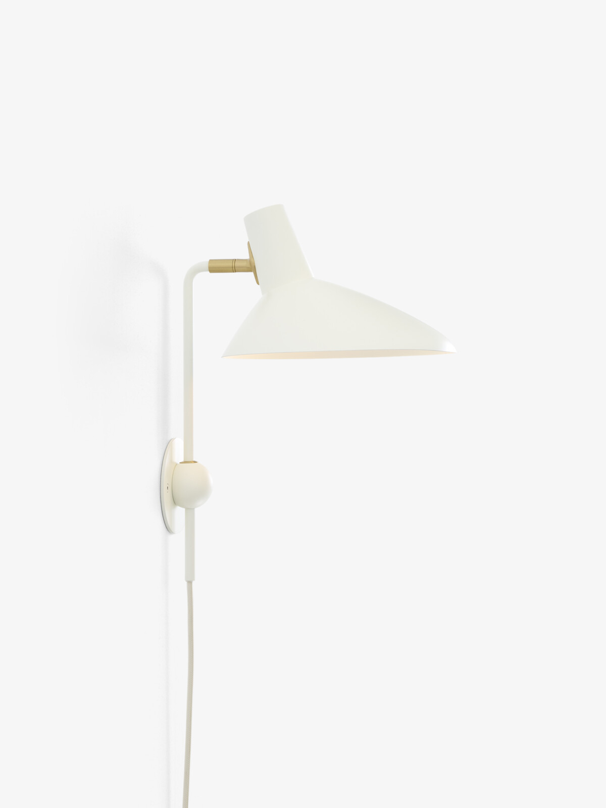 An adaptation inspired by sketches of the original lamp by Hvidt & M?lgaard, the new Tripod Wall Lamp remains true to the essence of the Tripod design. Crafted from lacquered aluminum, the wall lamp is anchored by a spherical base that establishes a visually solid foundation, while the shade’s swivel feature allows the lamp to distribute a generous diffusion of light. The addition of a new colourway, white with brass details, illustrates the timeless appeal of a classic design.